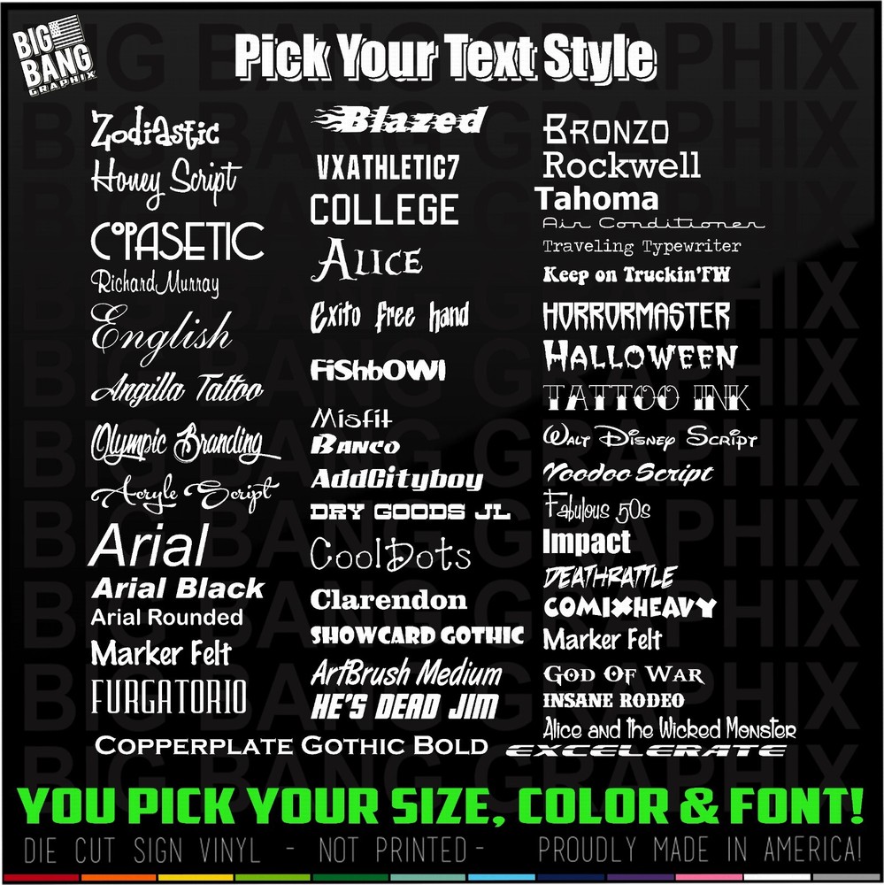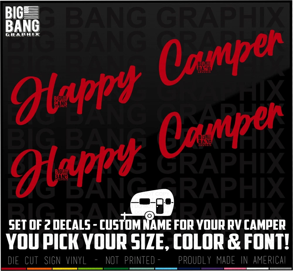 2 Custom RV Name Decal Sticker Camper Toy Trailers Hauler Pop Up Folding Tent Decal SET GREAT GIFT IDEA! Your choice of color and size! Sizes Measured in Length. Decals must be the same color. Message us your choice of font style. Must be the same color & font. Would you like a custom sticker with your name or business? Please see our store or message me for a quote! What Kind of Decals? Our decals are precision die-cut, made from quality, 7 year COMMERCIAL GRADE VINYL. NOT hobby vinyl. Our decals are available in Red, Orange, Yellow, Lime Green, Green, Sea Foam Green, Teal Blue, Medium Blue, Royal Blue, Purple, Pink, White, Black, Mat Silver "Precision Die-Cut" means that each decal is custom cut precisely along the shape of the design so your decal will have no visible background or bordering spaces. Your precision die-cut decals will come to you masked for easy installation. How and where are these made? Made in and shipped from the U.S.! Each precision die cut, hand trimmed and finished for you. Note: there is no background in the decal. Background will be what ever surface you apply it on. How do you apply die cut, decals? Decals can be placed on any flat, clean surface on exterior items as well as interior items. Clean the surface and remove the backing from the decal. Place the decal on the desired clean surface, before removing transfer paper use a credit card type tool to adhere and smooth decal to surface then remove the transfer paper. Thank you for looking and please check out our store for other quality die cut decal. Custom Orders * We make custom decals of any kind, if there is something you are looking for feel free to leave a message! Decals can also be made a different size if needed, but the pricing will be different If you have a problem with your order, contact us immediately and we will take care of it. Satisfaction guaranteed! *Feedback will be left after it is rec'd* In order to qualify for shipping discount, you must pay for all items on (1) ONE invoice. .........