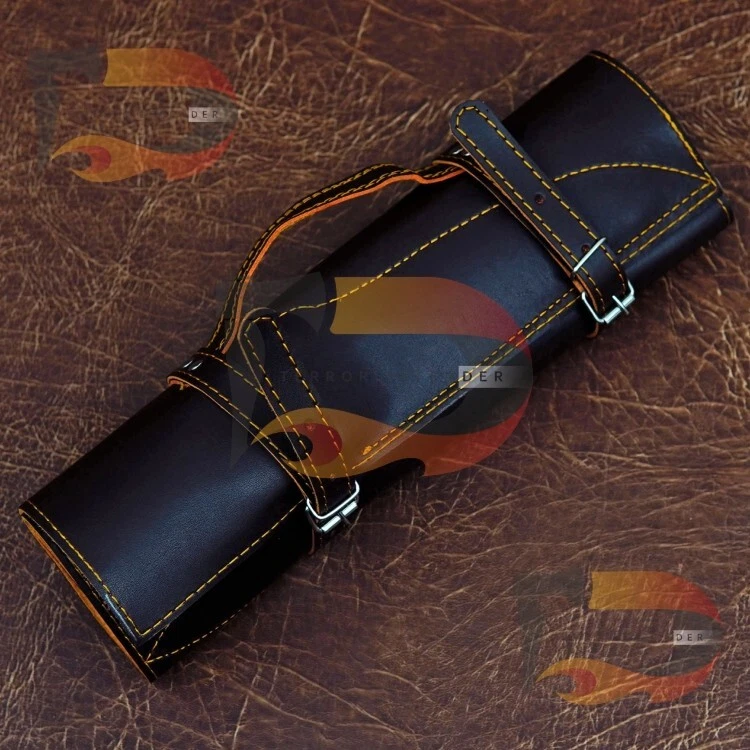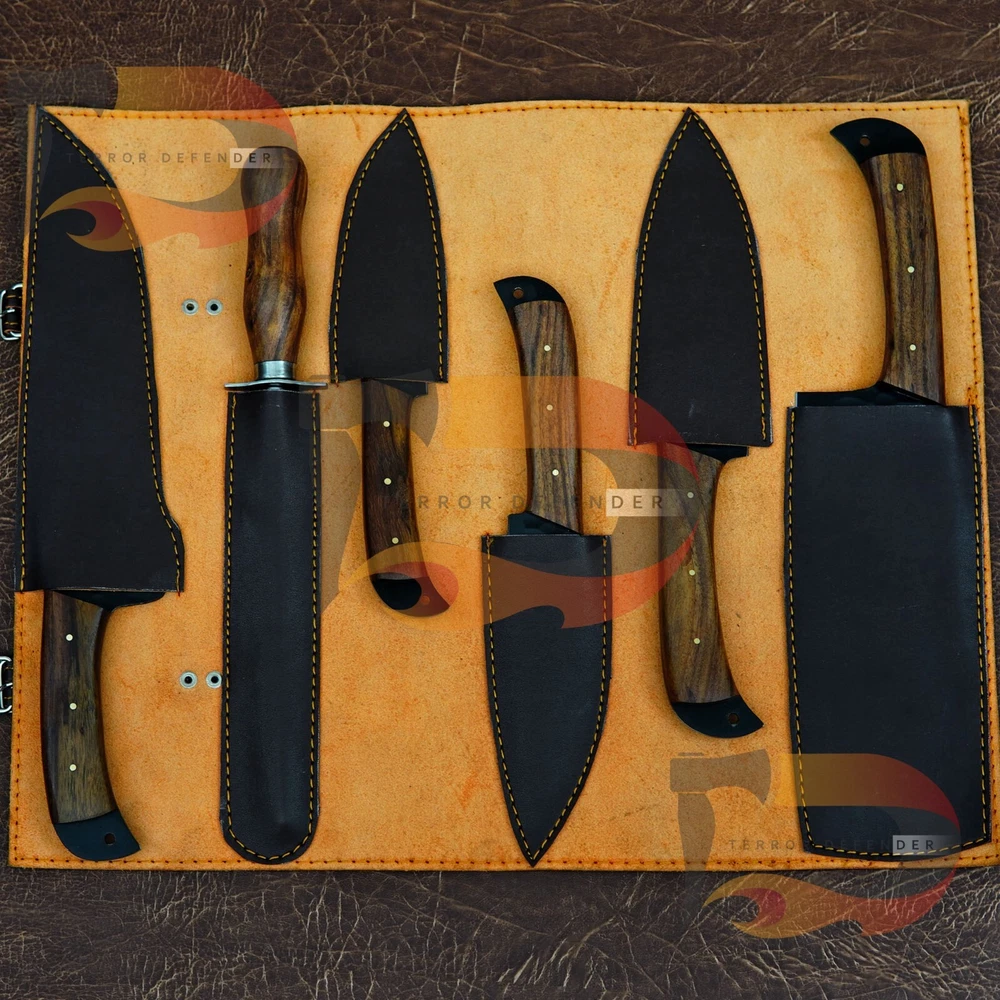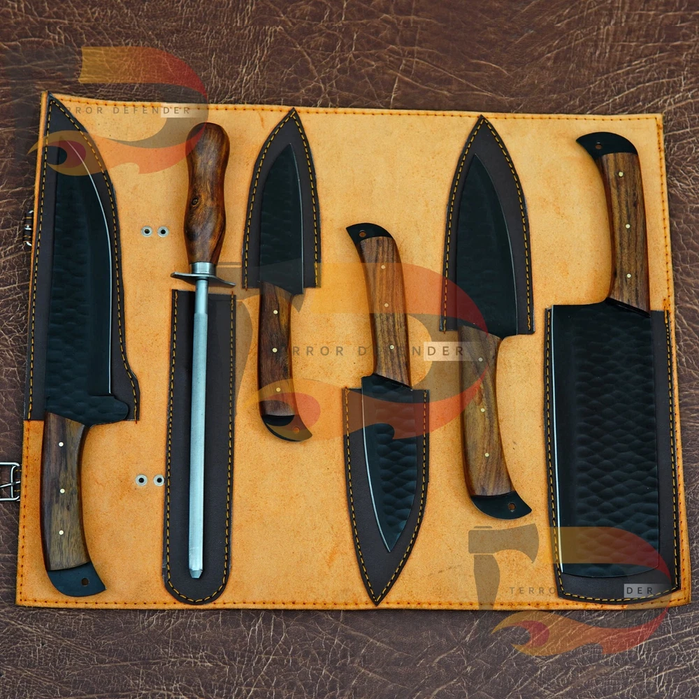 CUSTOM HAND FORGED STAINLESS STEEL BLACK COATED CHEF KITCHEN KNIFE SET Type: BBQ Knife/Chef's Knife Handle Material: Wood with Steel Bolsters with Mosaic pins Blade Material: Hand Forged Stainless Steel Black coated 15N20 and 1095 Carbon Steel Leather Sheath: Original leather Sheath made of Suede leather it is also called leather Roll Overall Length : 13.5"-12.5"-10.5"-10.5"-9.5" Inches Blade Length: 8"-8"-6"-6"-5" inches Handle Length: 4.5" Inches Knife Type: Kitchen / chef knife Note: This is a catalog picture. You will receive the knife as shown in the picture but the blade patterns and handle material may vary slightly due to natural material used. This item is hand forged! Tips to care the Knife Do Not put the knife in the pouch for very long time.It can take rust due to high Carbon. Use oil on the blade after use. Always clean your knife after use Complimentary gift messages *Gift wrapping service available for minimal additional fee ADD ONS: *Custom orders for 10 or more pieces. You can choose & submit your own handle or design. LIFETIME WARRANTY No premium knife is complete without a lifetime warranty; our masterpiece knife is fully covered for life, We do sell wholesale, please contact us for special discounts on bulk orders. FEEDBACK POLICY: YOUR FEEDBACK IS VERY IMPORTANT FOR US, IF THEIR IS ANY KIND OF PROBLEM PLEASE GIVE US OPPORTUNITY TO SORT THE ISSUE