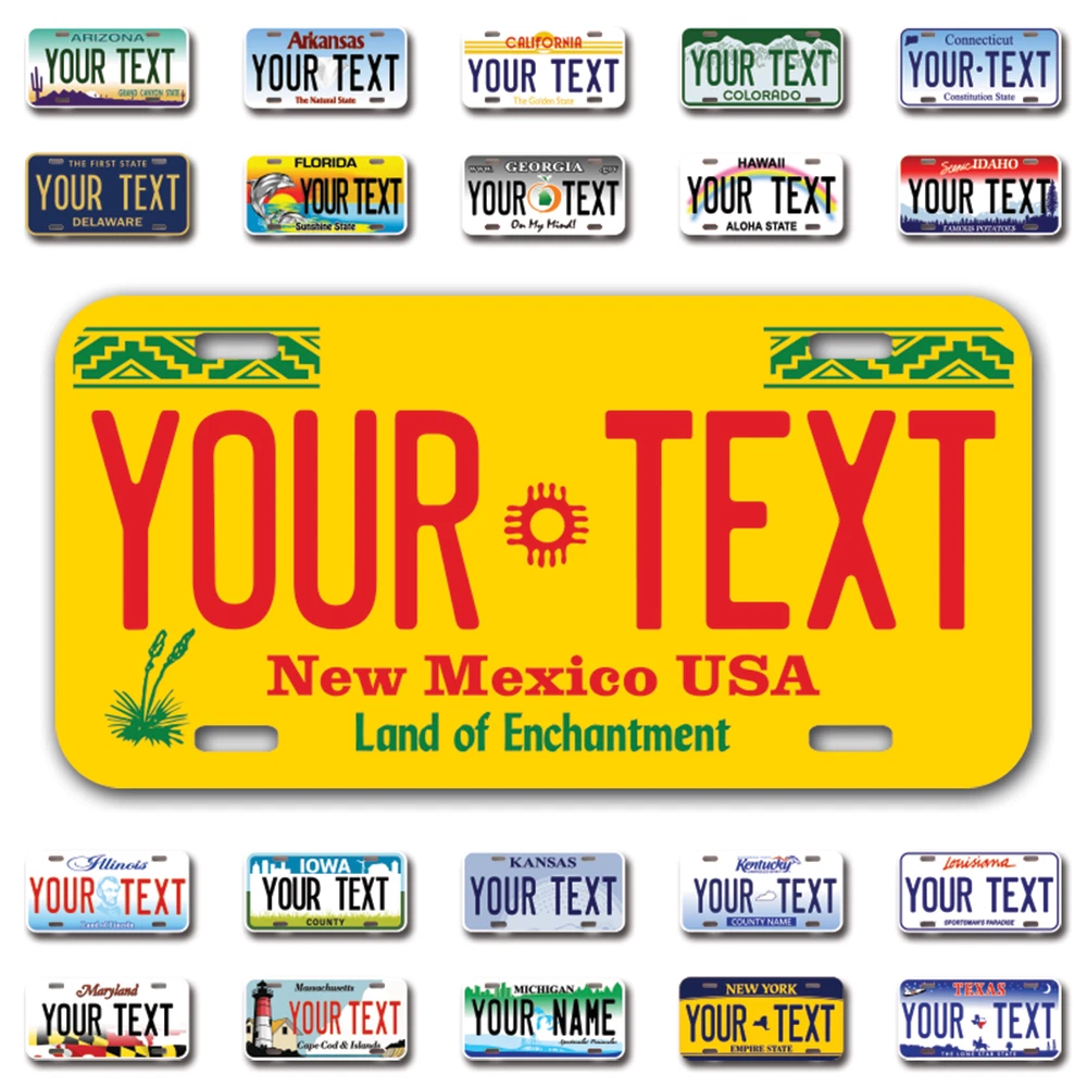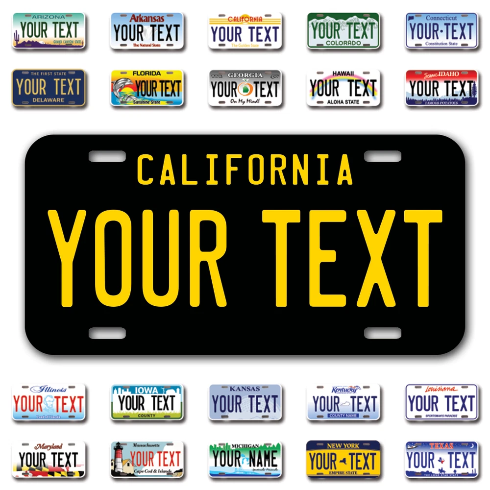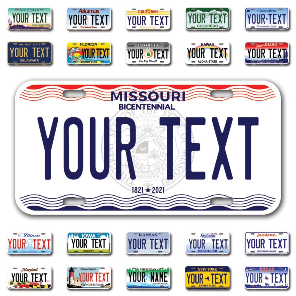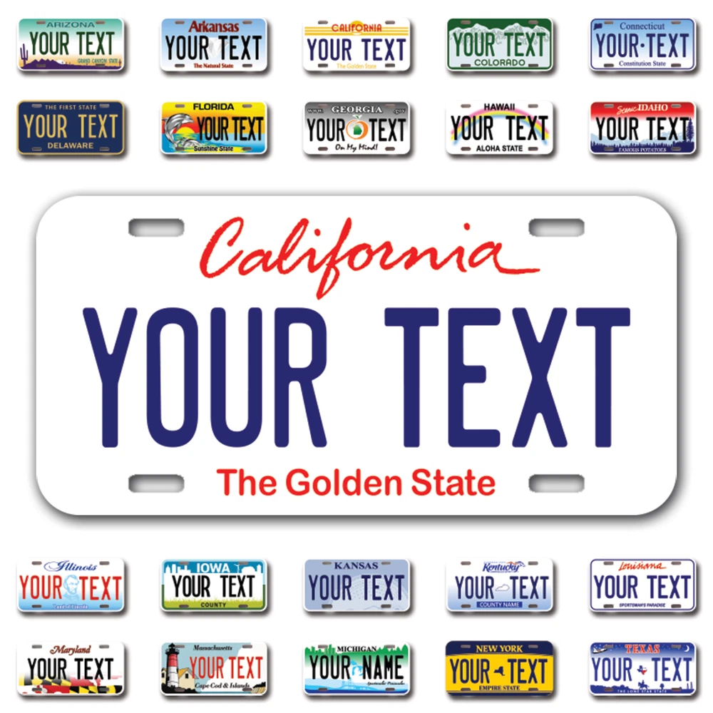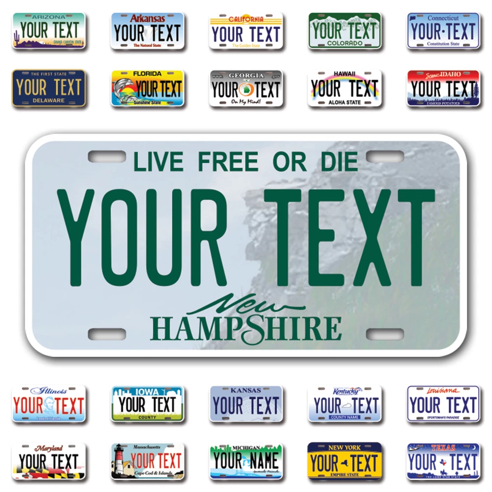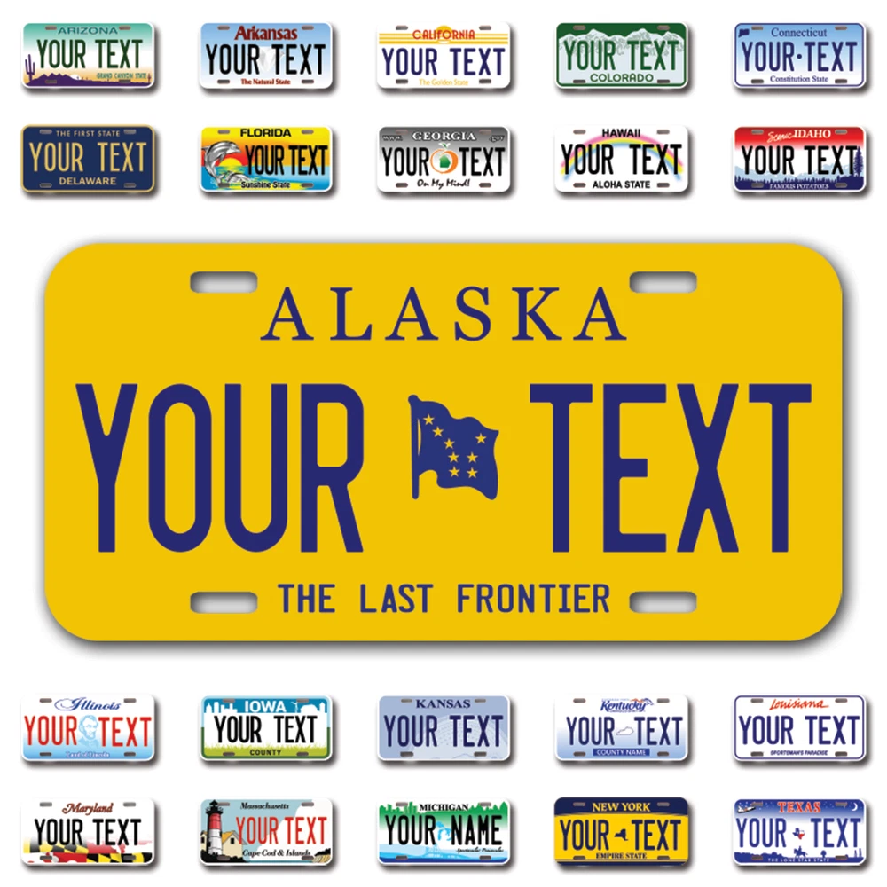Our LICENSE plates are the most unique souvenirs from the United States, Choose between 50 states and 3 different sizes. Cannot be used in place of a state issued plate. IMPORTANT DESCRIPTION • Plates are made using High quality thick 040 rust free Aluminum. • Our plates are printed flat, not raised. The customizing is done using the latest UV Laser technique for weatherproof and high-quality finish. • 100% made in USA. • Standard car plate has four holes and can be used for trucks, motor homes, and more • M otorcycle plates have 2 holes on top for mounting and can be used on ATVS, Mopeds, Snowmobiles, wheelchairs and golf carts • B ike plates have two holes on top and can also be used for toy cars, wagons, electric toy cars, tricycles and more • Write your text in the personalization section. The text will be copied and pasted on the license plate as sent, so make sure of the spelling, punctuation, capitalization, etc. If you have any question regarding your text or you would like a preview, please let us know by adding a note or contacting Alabama | Alaska | Arizona | Arkansas | California | Colorado | Connecticut | Delaware | Florida | Georgia | Hawaii | Idaho | Illinois | Indiana | Iowa | Kansas | Kentucky | Louisiana | Maine | Maryland | Massachusetts | Michigan | Minnesota | Mississippi | Missouri | Montana | Nebraska | Nevada | New Hampshire | New Jersey | New Mexico | New York | North Carolina | North Dakota | Ohio | Oklahoma | Oregon | Pennsylvania | Puerto Rico | Rhode Island | South Carolina | South Dakota | Tennessee | Texas | Utah | Vermont | Virginia | Washington | West Virginia | Wisconsin | Wyoming
