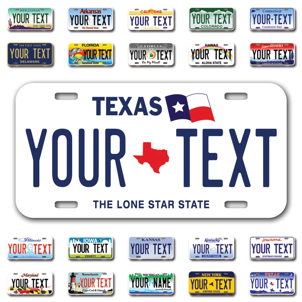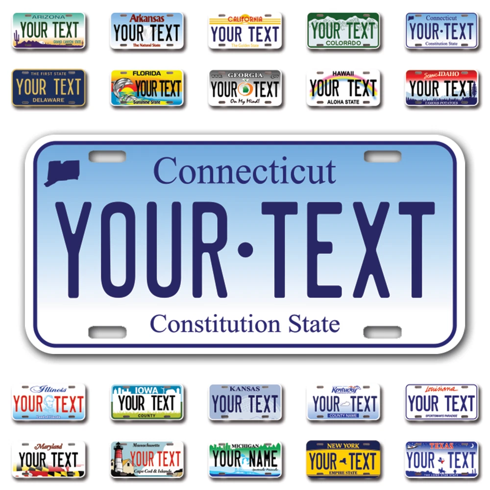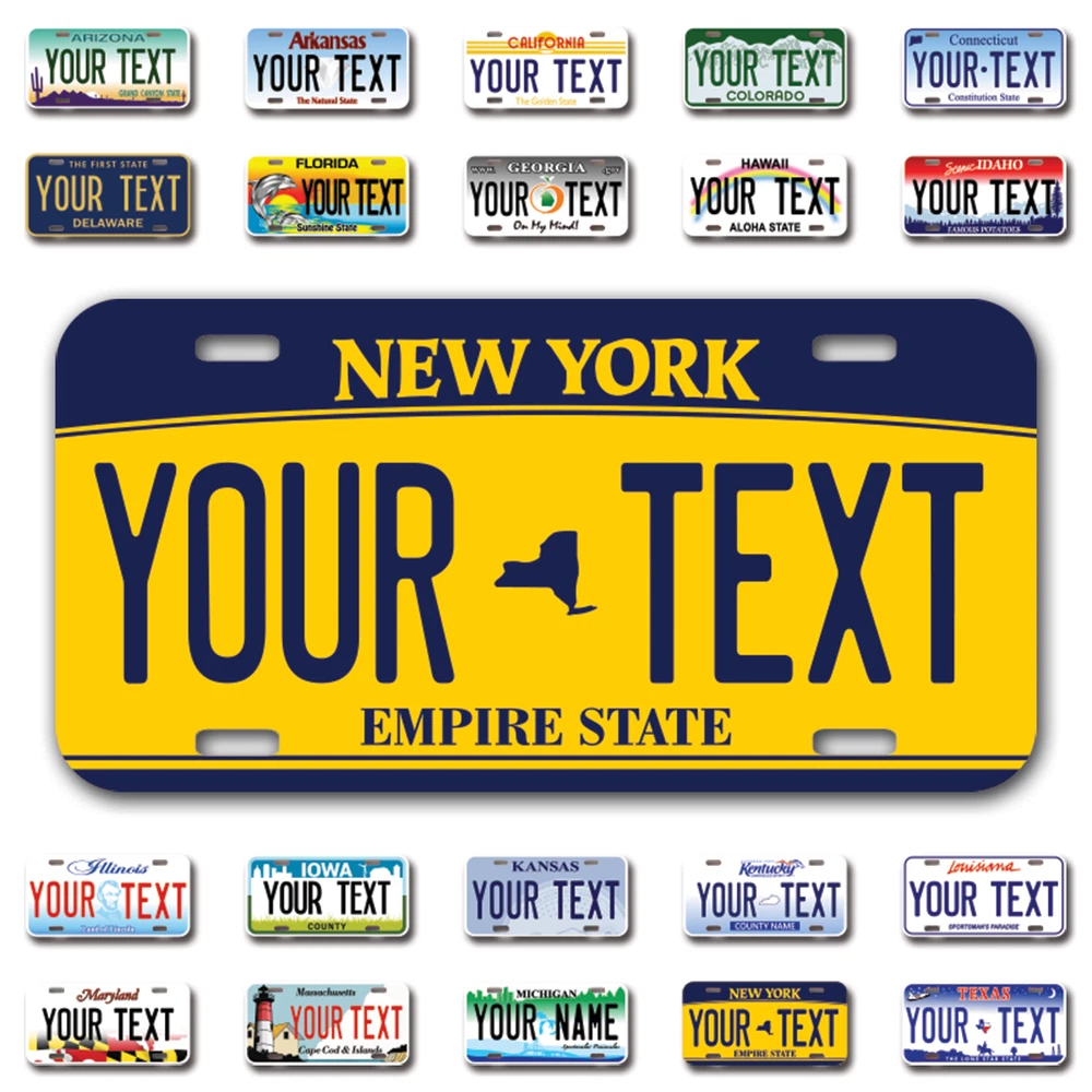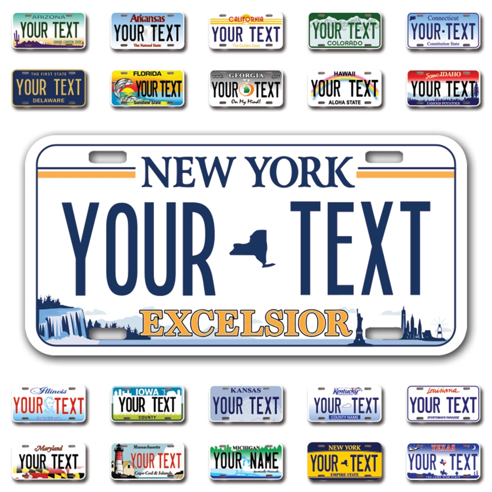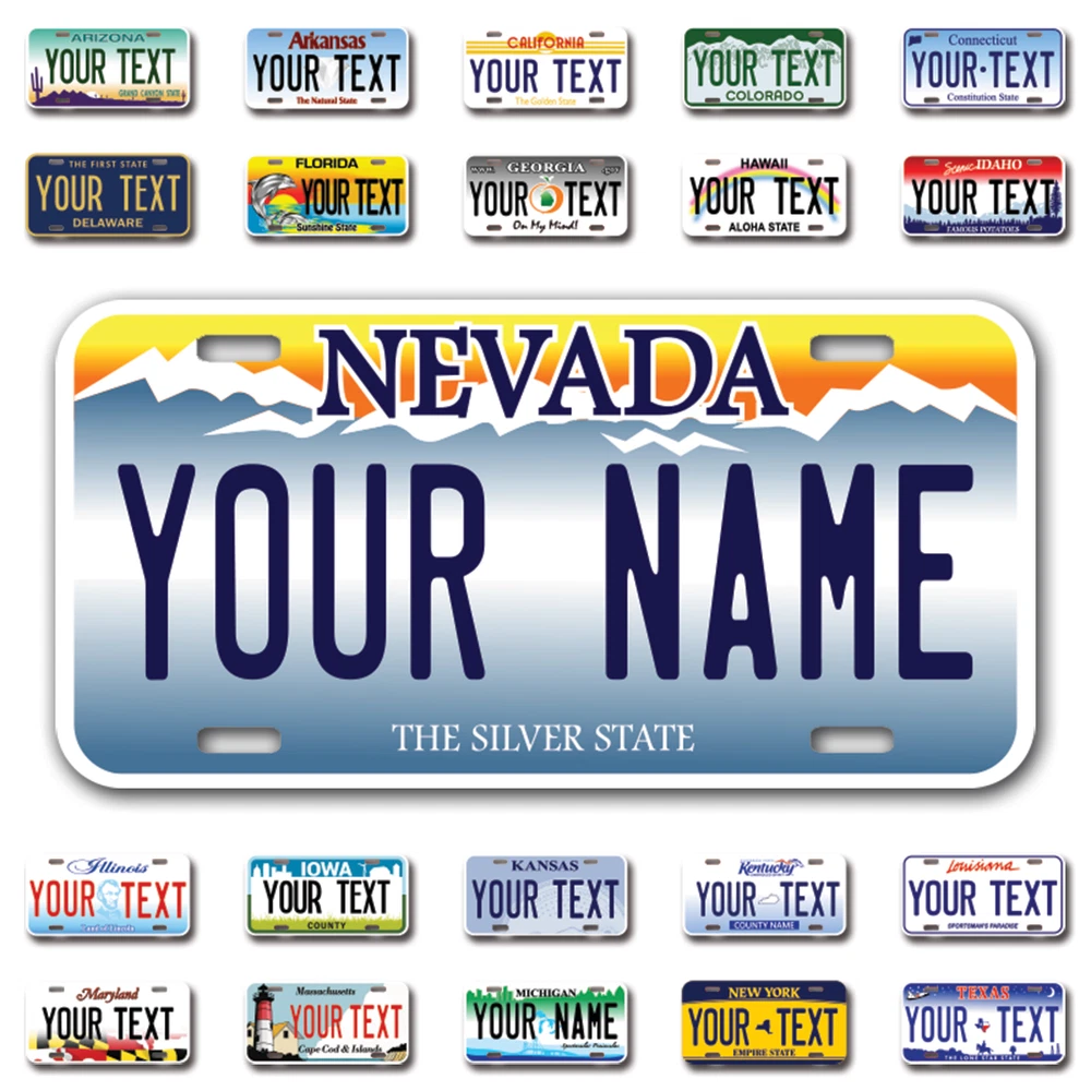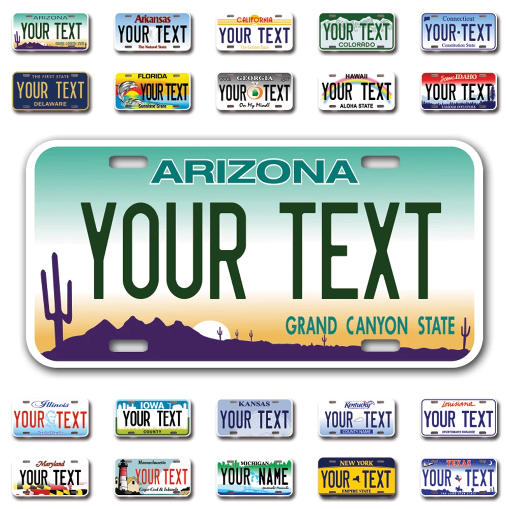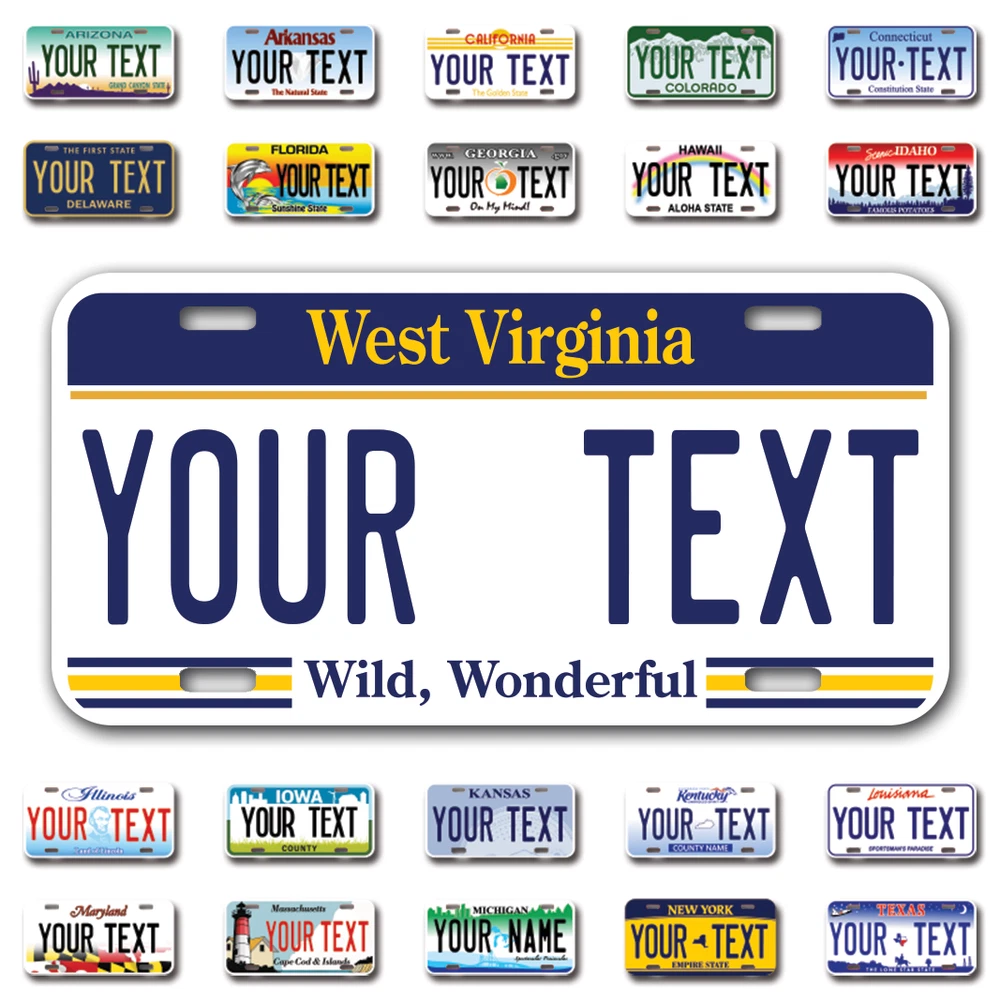 Our LICENSE plates are the most unique souvenirs from the United States, Choose between 50 states and 3 different sizes. Cannot be used in place of a state issued plate. IMPORTANT DESCRIPTION • Plates are made using High quality thick 040 rust free Aluminum. • Our plates are printed flat, not raised. The customizing is done using the latest UV Laser technique for weatherproof and high-quality finish. • 100% made in USA. • Standard car plate has four holes and can be used for trucks, motor homes, and more • M otorcycle plates have 2 holes on top for mounting and can be used on ATVS, Mopeds, Snowmobiles, wheelchairs and golf carts • B ike plates have two holes on top and can also be used for toy cars, wagons, electric toy cars, tricycles and more • Write your text in the personalization section. The text will be copied and pasted on the license plate as sent, so make sure of the spelling, punctuation, capitalization, etc. If you have any question regarding your text or you would like a preview, please let us know by adding a note or contacting Alabama | Alaska | Arizona | Arkansas | California | Colorado | Connecticut | Delaware | Florida | Georgia | Hawaii | Idaho | Illinois | Indiana | Iowa | Kansas | Kentucky | Louisiana | Maine | Maryland | Massachusetts | Michigan | Minnesota | Mississippi | Missouri | Montana | Nebraska | Nevada | New Hampshire | New Jersey | New Mexico | New York | North Carolina | North Dakota | Ohio | Oklahoma | Oregon | Pennsylvania | Puerto Rico | Rhode Island | South Carolina | South Dakota | Tennessee | Texas | Utah | Vermont | Virginia | Washington | West Virginia | Wisconsin | Wyoming