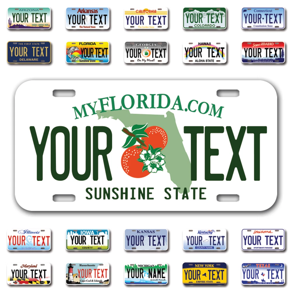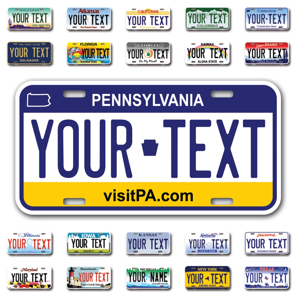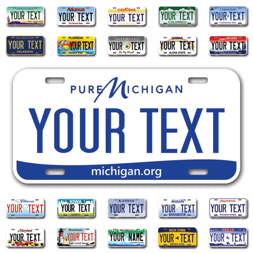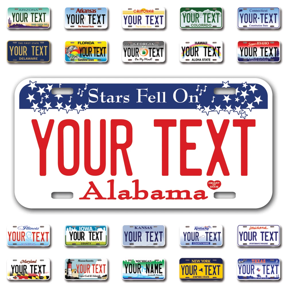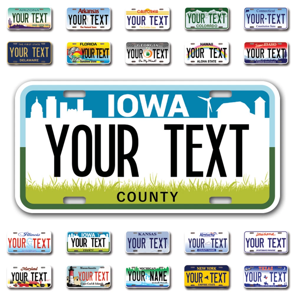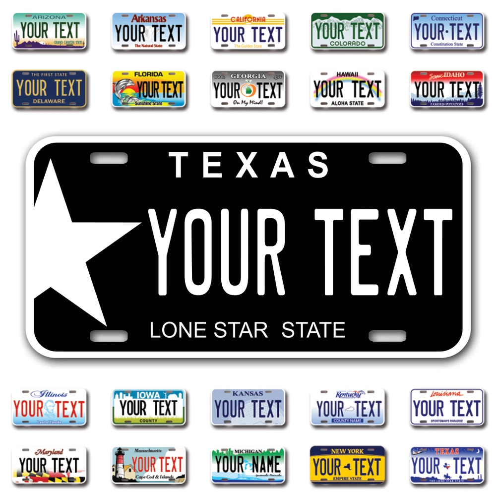 Our LICENSE plates are the most unique souvenirs from the United States, Choose between 50 states and 3 different sizes. Cannot be used in place of a state issued plate. IMPORTANT DESCRIPTION • Plates are made using High quality thick 040 rust free Aluminum. • Our plates are printed flat, not raised. The customizing is done using the latest UV Laser technique for weatherproof and high-quality finish. • 100% made in USA. • Standard car plate has four holes and can be used for trucks, motor homes, and more • M otorcycle plates have 2 holes on top for mounting and can be used on ATVS, Mopeds, Snowmobiles, wheelchairs and golf carts • B ike plates have two holes on top and can also be used for toy cars, wagons, electric toy cars, tricycles and more • Write your text in the personalization section. The text will be copied and pasted on the license plate as sent, so make sure of the spelling, punctuation, capitalization, etc. If you have any question regarding your text or you would like a preview, please let us know by adding a note or contacting Alabama | Alaska | Arizona | Arkansas | California | Colorado | Connecticut | Delaware | Florida | Georgia | Hawaii | Idaho | Illinois | Indiana | Iowa | Kansas | Kentucky | Louisiana | Maine | Maryland | Massachusetts | Michigan | Minnesota | Mississippi | Missouri | Montana | Nebraska | Nevada | New Hampshire | New Jersey | New Mexico | New York | North Carolina | North Dakota | Ohio | Oklahoma | Oregon | Pennsylvania | Puerto Rico | Rhode Island | South Carolina | South Dakota | Tennessee | Texas | Utah | Vermont | Virginia | Washington | West Virginia | Wisconsin | Wyoming
