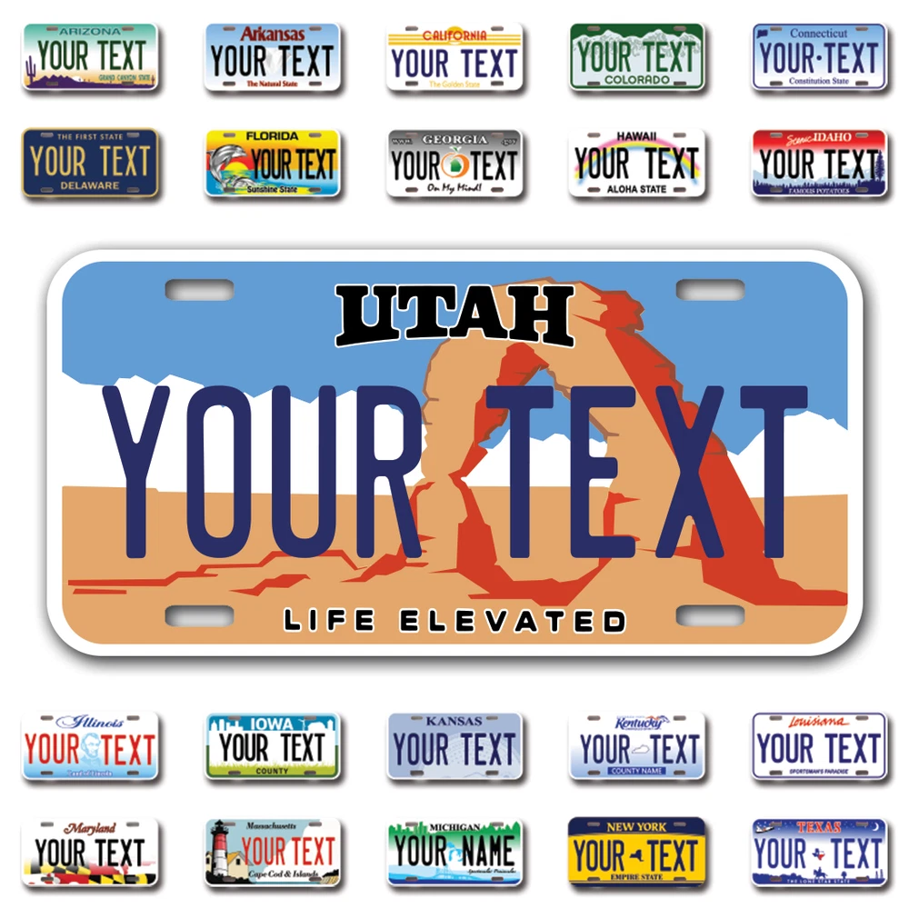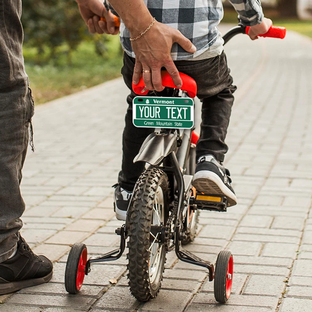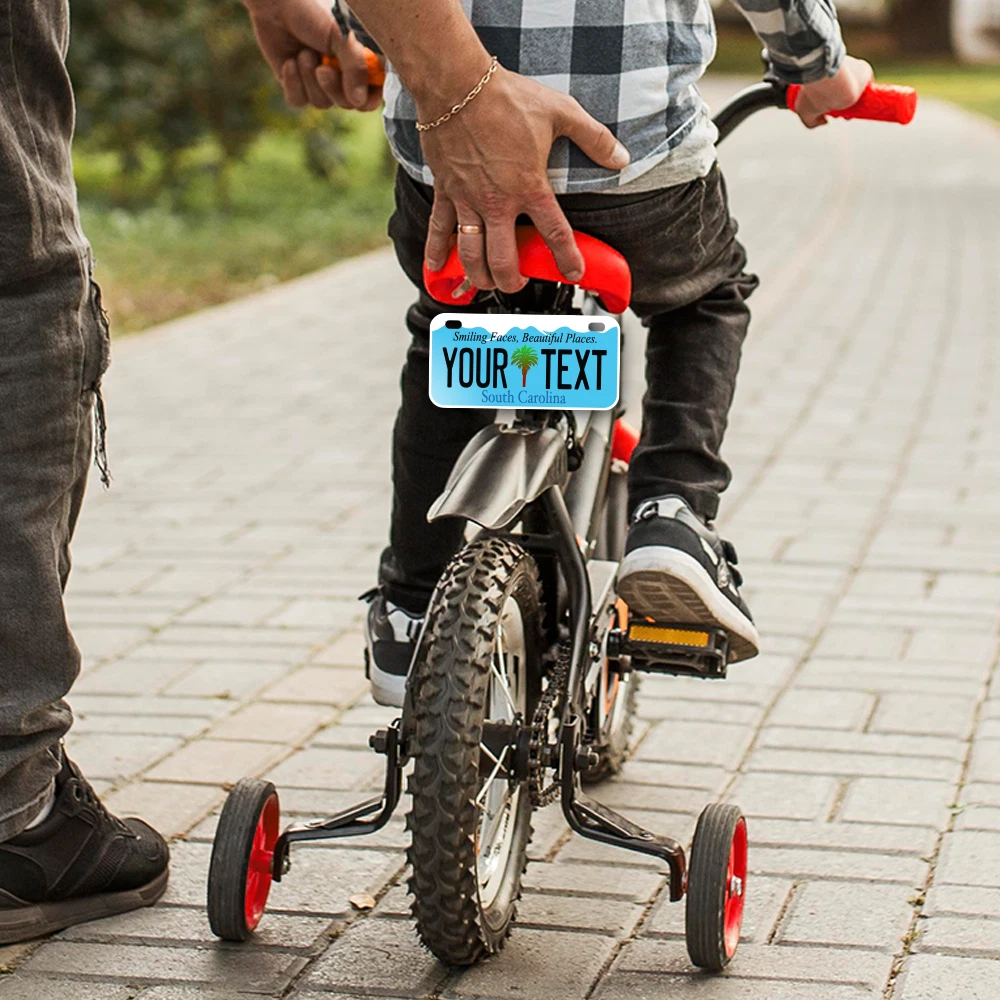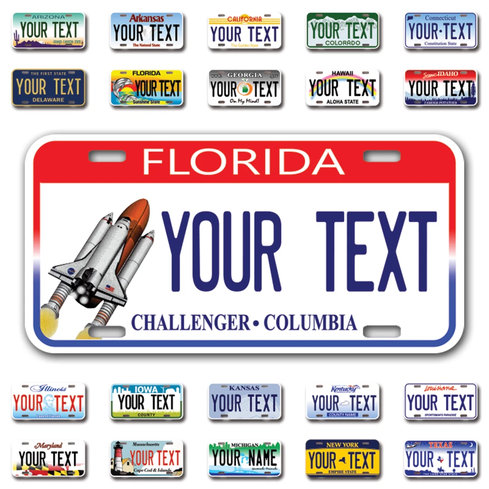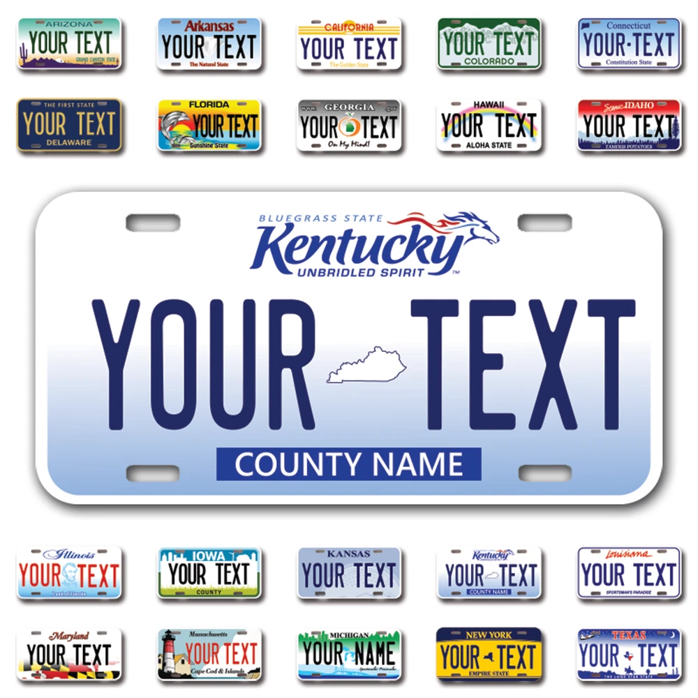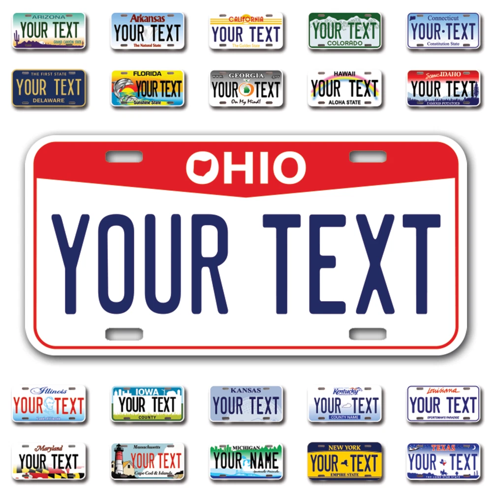 Our LICENSE plates are the most unique souvenirs from the United States, Choose between 50 states and 3 different sizes. Cannot be used in place of a state issued plate. IMPORTANT DESCRIPTION • Plates are made using High quality thick 040 rust free Aluminum. • Our plates are printed flat, not raised. The customizing is done using the latest UV Laser technique for weatherproof and high-quality finish. • 100% made in USA. • Standard car plate has four holes and can be used for trucks, motor homes, and more • M otorcycle plates have 2 holes on top for mounting and can be used on ATVS, Mopeds, Snowmobiles, wheelchairs and golf carts • B ike plates have two holes on top and can also be used for toy cars, wagons, electric toy cars, tricycles and more • Write your text in the personalization section. The text will be copied and pasted on the license plate as sent, so make sure of the spelling, punctuation, capitalization, etc. If you have any question regarding your text or you would like a preview, please let us know by adding a note or contacting Alabama | Alaska | Arizona | Arkansas | California | Colorado | Connecticut | Delaware | Florida | Georgia | Hawaii | Idaho | Illinois | Indiana | Iowa | Kansas | Kentucky | Louisiana | Maine | Maryland | Massachusetts | Michigan | Minnesota | Mississippi | Missouri | Montana | Nebraska | Nevada | New Hampshire | New Jersey | New Mexico | New York | North Carolina | North Dakota | Ohio | Oklahoma | Oregon | Pennsylvania | Puerto Rico | Rhode Island | South Carolina | South Dakota | Tennessee | Texas | Utah | Vermont | Virginia | Washington | West Virginia | Wisconsin | Wyoming