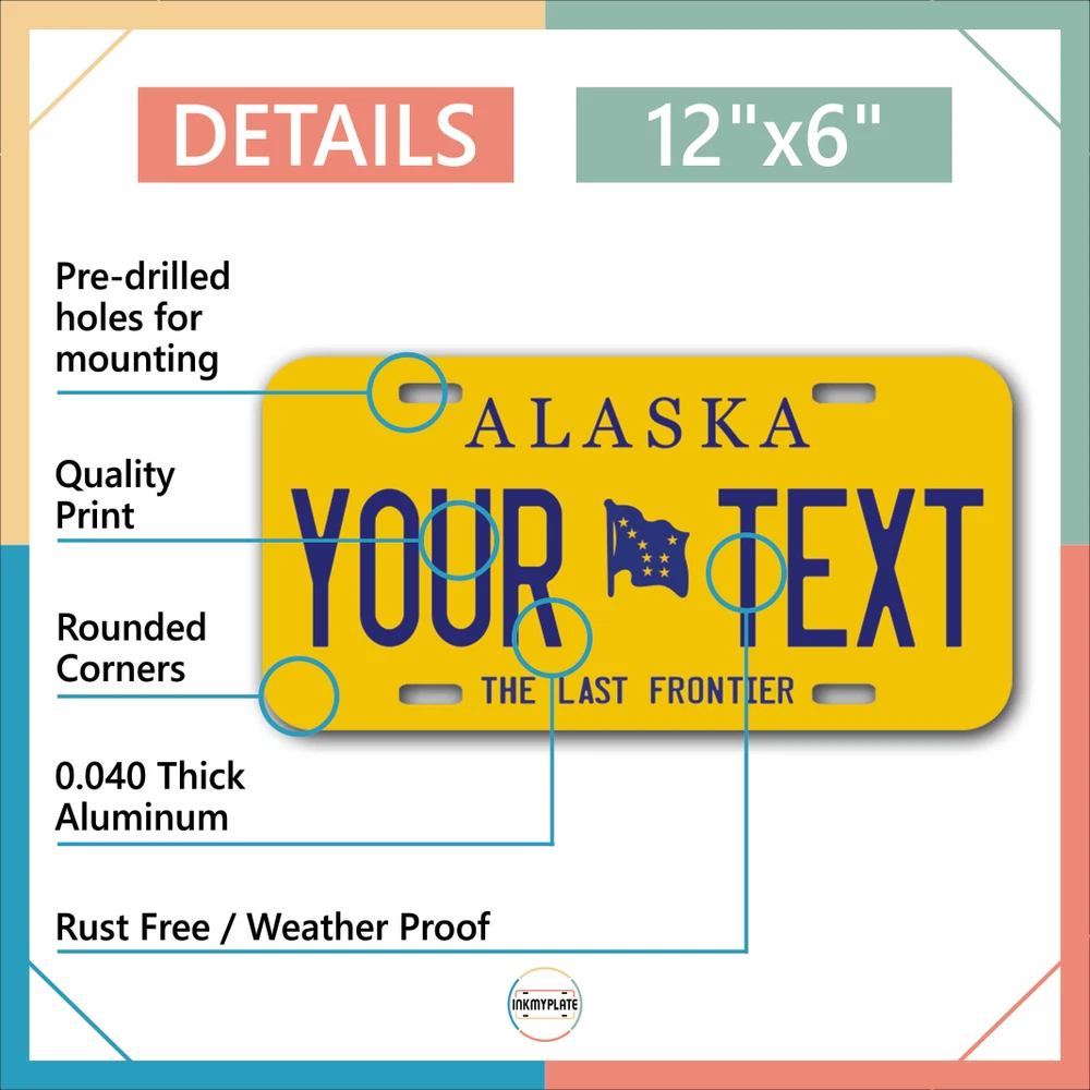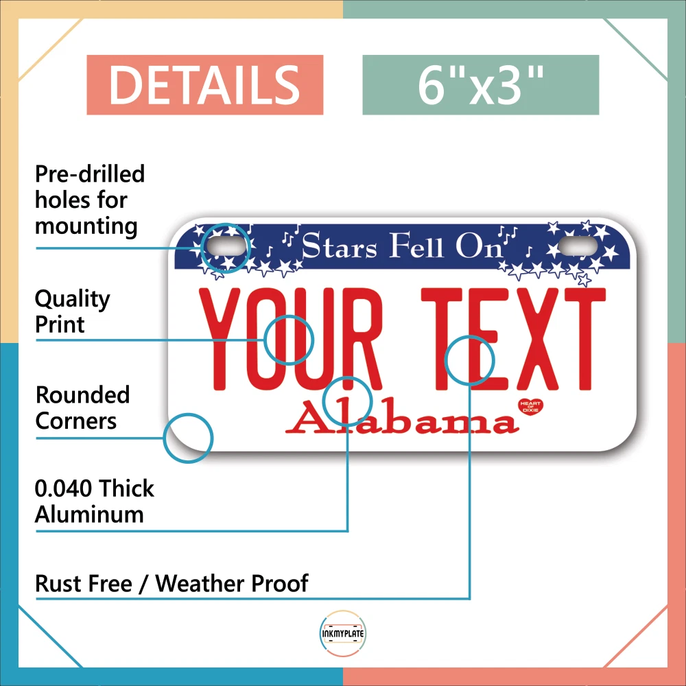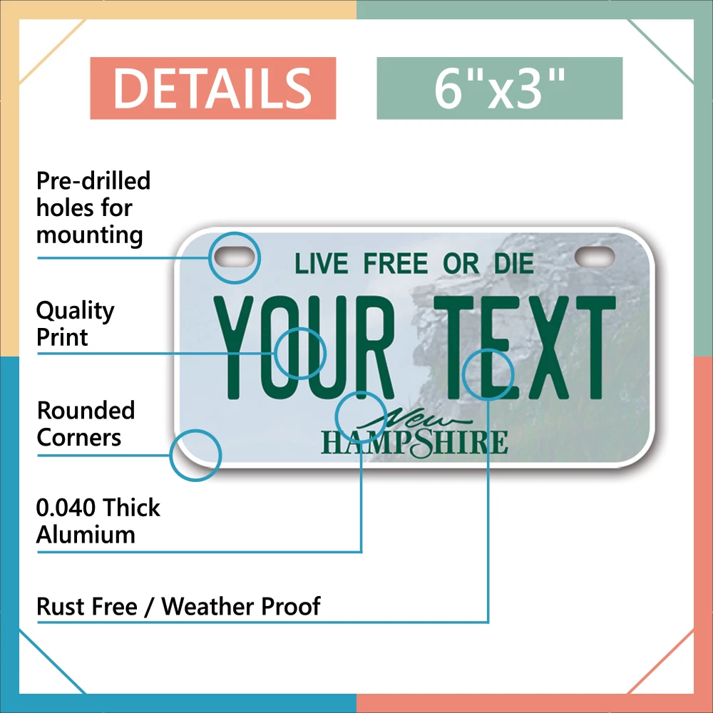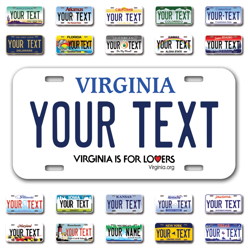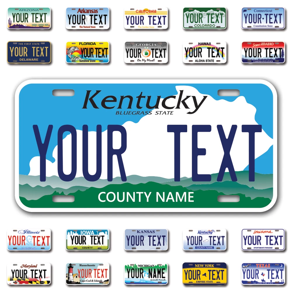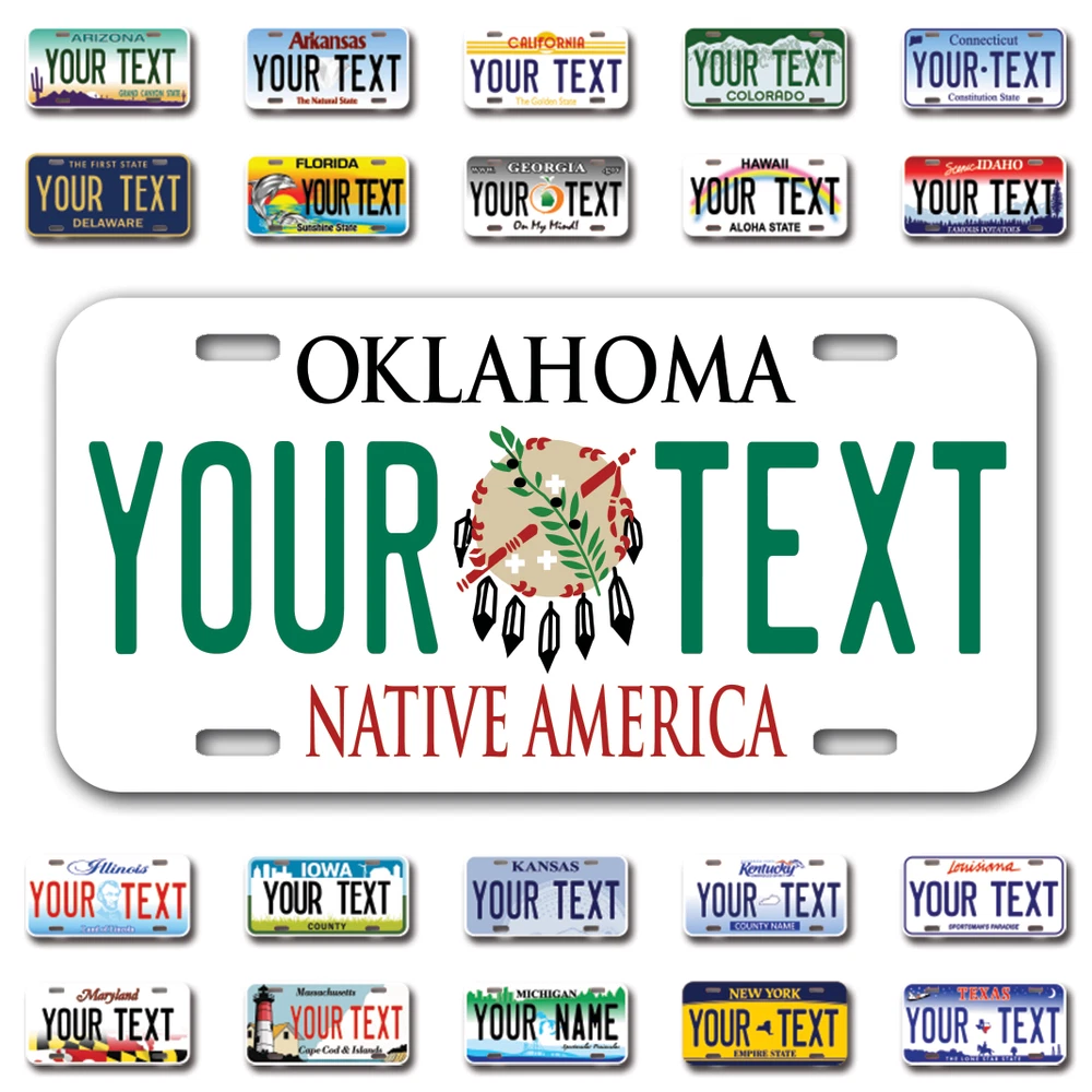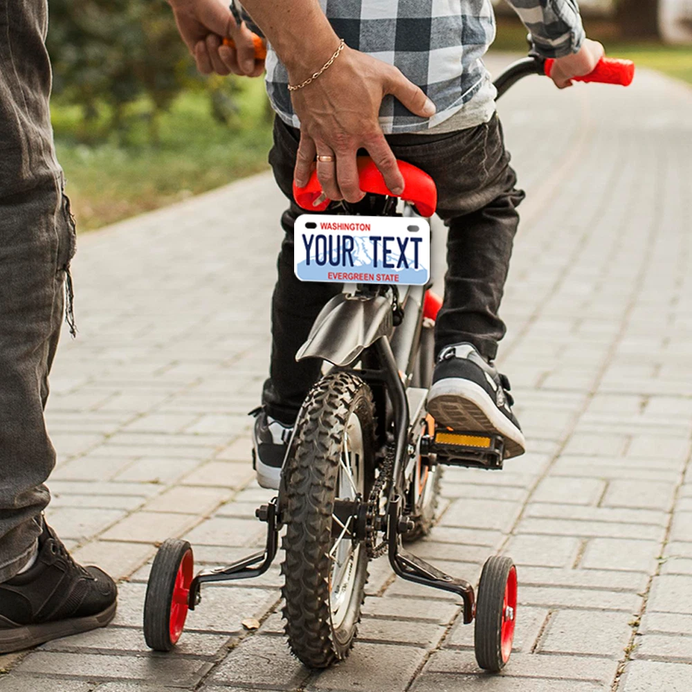 Our LICENSE plates are the most unique souvenirs from the United States, Choose between 50 states and 3 different sizes. Cannot be used in place of a state issued plate. IMPORTANT DESCRIPTION • Plates are made using High quality thick 040 rust free Aluminum. • Our plates are printed flat, not raised. The customizing is done using the latest UV Laser technique for weatherproof and high-quality finish. • 100% made in USA. • Standard car plate has four holes and can be used for trucks, motor homes, and more • M otorcycle plates have 2 holes on top for mounting and can be used on ATVS, Mopeds, Snowmobiles, wheelchairs and golf carts • B ike plates have two holes on top and can also be used for toy cars, wagons, electric toy cars, tricycles and more • Write your text in the personalization section. The text will be copied and pasted on the license plate as sent, so make sure of the spelling, punctuation, capitalization, etc. If you have any question regarding your text or you would like a preview, please let us know by adding a note or contacting Alabama | Alaska | Arizona | Arkansas | California | Colorado | Connecticut | Delaware | Florida | Georgia | Hawaii | Idaho | Illinois | Indiana | Iowa | Kansas | Kentucky | Louisiana | Maine | Maryland | Massachusetts | Michigan | Minnesota | Mississippi | Missouri | Montana | Nebraska | Nevada | New Hampshire | New Jersey | New Mexico | New York | North Carolina | North Dakota | Ohio | Oklahoma | Oregon | Pennsylvania | Puerto Rico | Rhode Island | South Carolina | South Dakota | Tennessee | Texas | Utah | Vermont | Virginia | Washington | West Virginia | Wisconsin | Wyoming