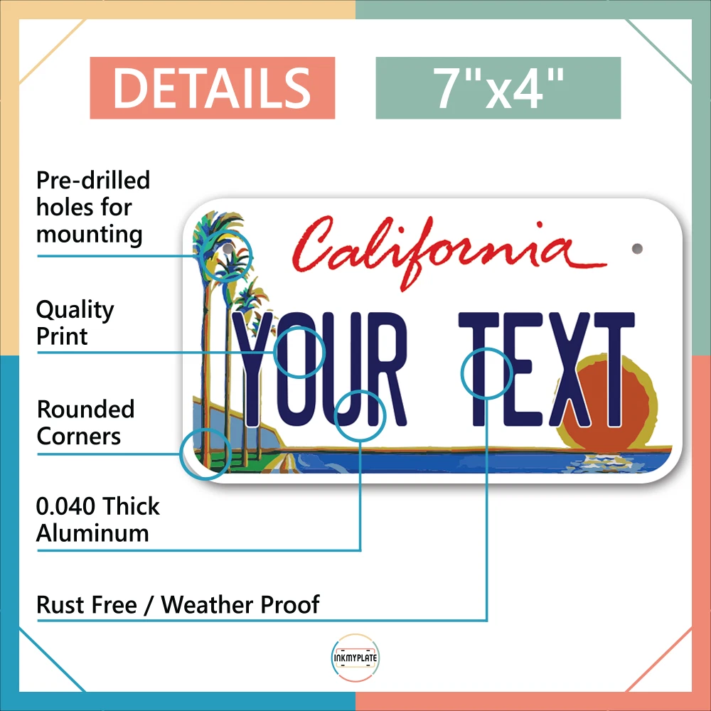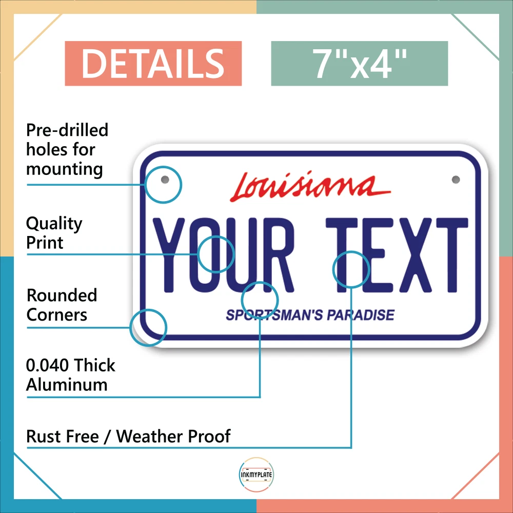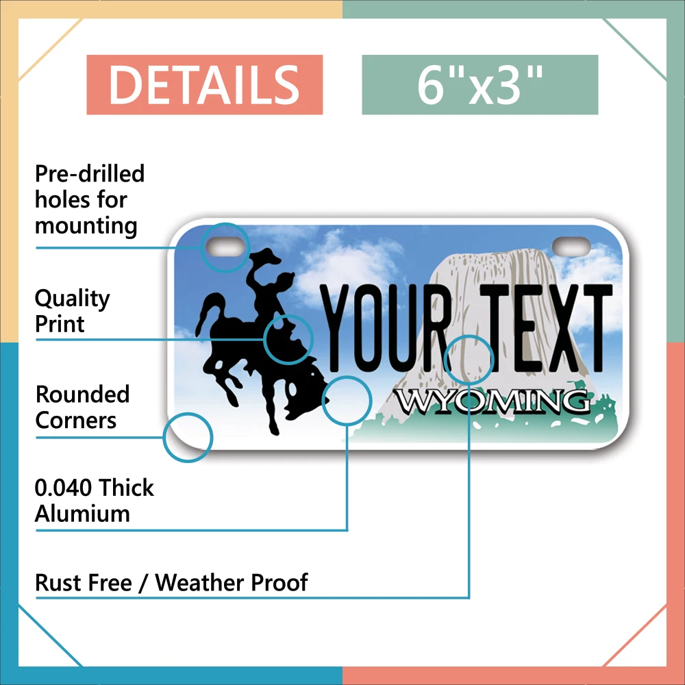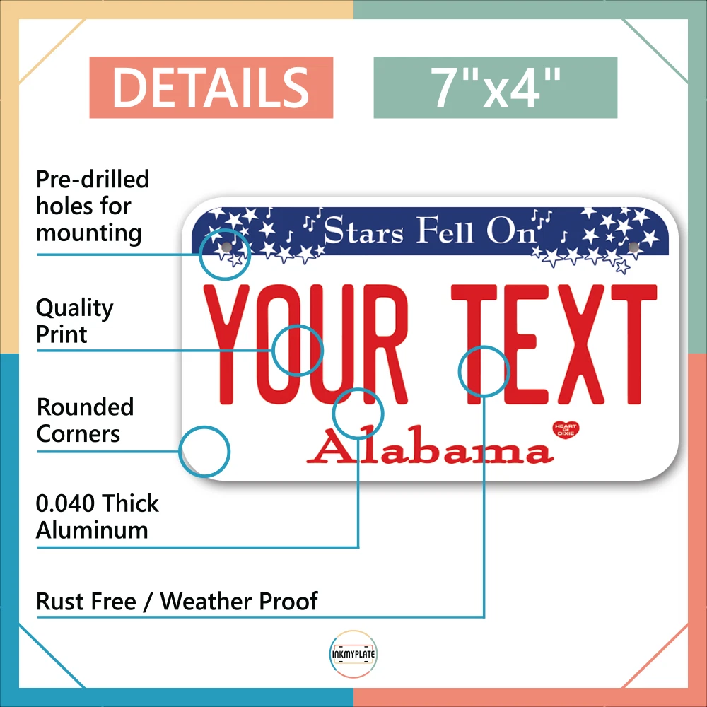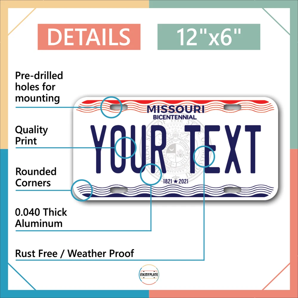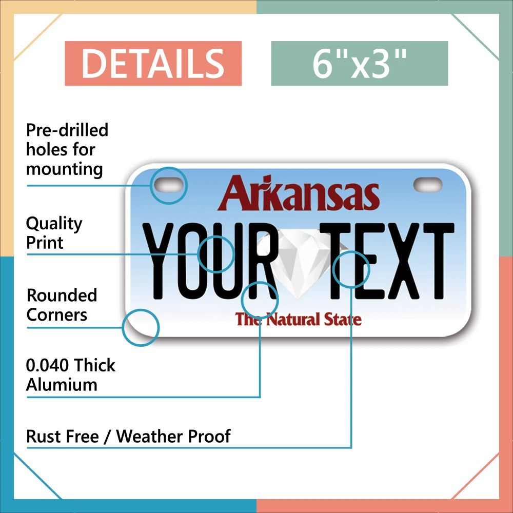 Our LICENSE plates are the most unique souvenirs from the United States, Choose between 50 states and 3 different sizes. Cannot be used in place of a state issued plate. IMPORTANT DESCRIPTION • Plates are made using High quality thick 040 rust free Aluminum. • Our plates are printed flat, not raised. The customizing is done using the latest UV Laser technique for weatherproof and high-quality finish. • 100% made in USA. • Standard car plate has four holes and can be used for trucks, motor homes, and more • M otorcycle plates have 2 holes on top for mounting and can be used on ATVS, Mopeds, Snowmobiles, wheelchairs and golf carts • B ike plates have two holes on top and can also be used for toy cars, wagons, electric toy cars, tricycles and more • Write your text in the personalization section. The text will be copied and pasted on the license plate as sent, so make sure of the spelling, punctuation, capitalization, etc. If you have any question regarding your text or you would like a preview, please let us know by adding a note or contacting Alabama | Alaska | Arizona | Arkansas | California | Colorado | Connecticut | Delaware | Florida | Georgia | Hawaii | Idaho | Illinois | Indiana | Iowa | Kansas | Kentucky | Louisiana | Maine | Maryland | Massachusetts | Michigan | Minnesota | Mississippi | Missouri | Montana | Nebraska | Nevada | New Hampshire | New Jersey | New Mexico | New York | North Carolina | North Dakota | Ohio | Oklahoma | Oregon | Pennsylvania | Puerto Rico | Rhode Island | South Carolina | South Dakota | Tennessee | Texas | Utah | Vermont | Virginia | Washington | West Virginia | Wisconsin | Wyoming