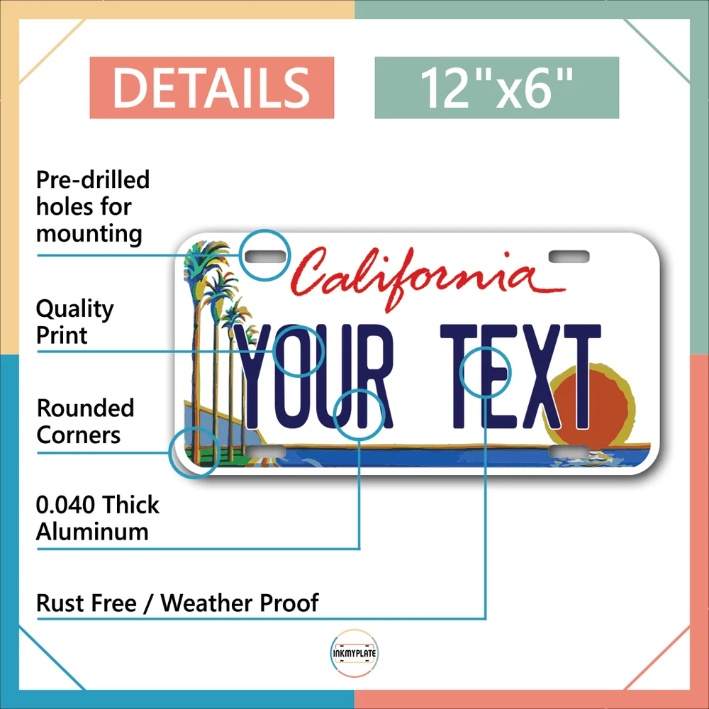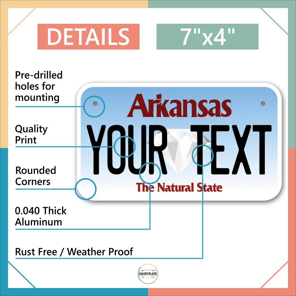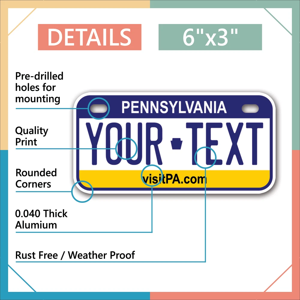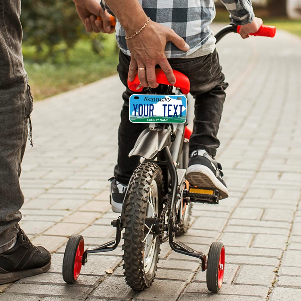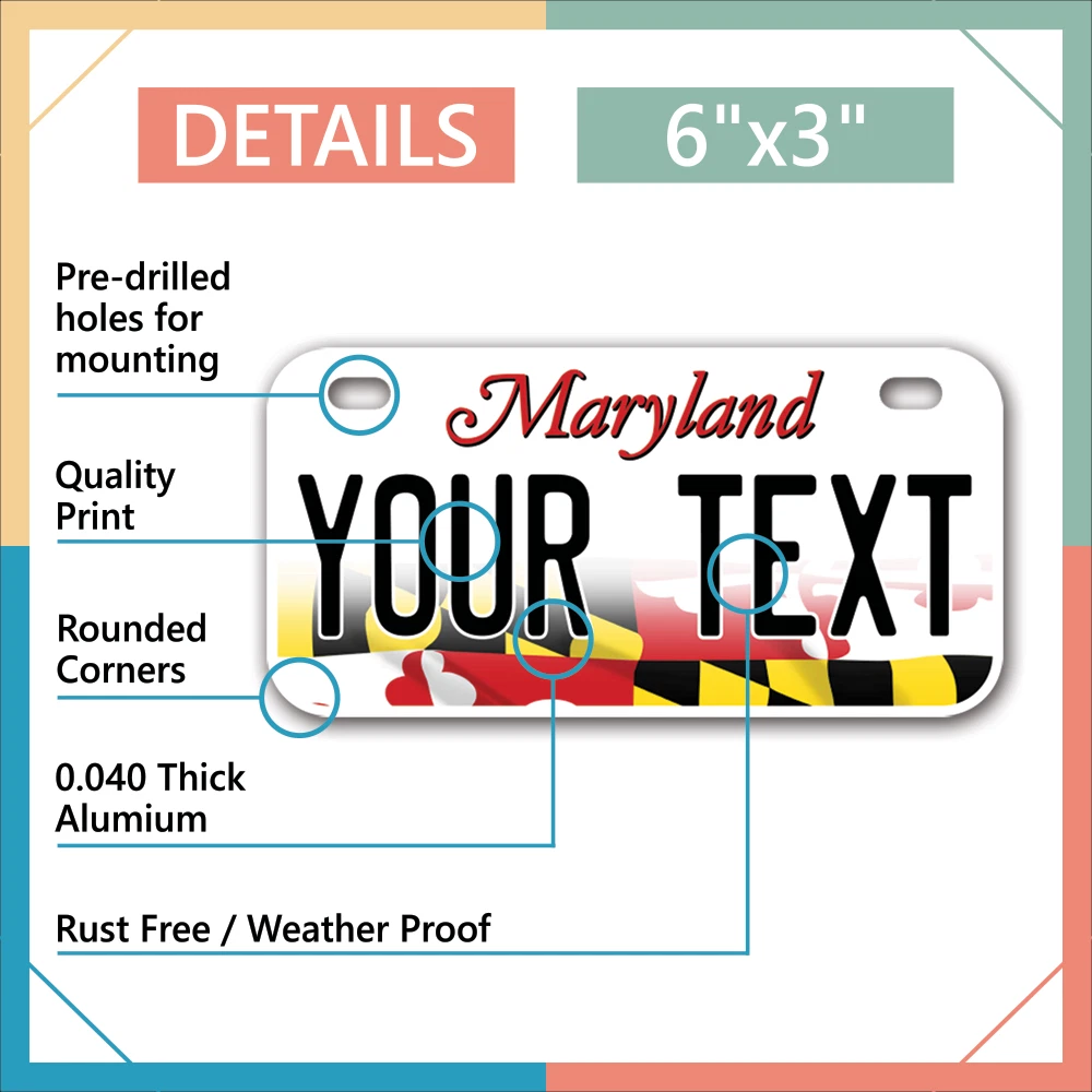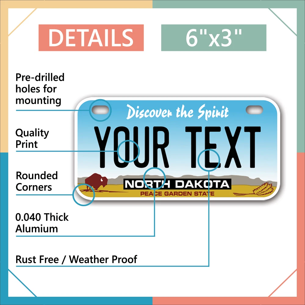 Our LICENSE plates are the most unique souvenirs from the United States, Choose between 50 states and 3 different sizes. Cannot be used in place of a state issued plate. IMPORTANT DESCRIPTION • Plates are made using High quality thick 040 rust free Aluminum. • Our plates are printed flat, not raised. The customizing is done using the latest UV Laser technique for weatherproof and high-quality finish. • 100% made in USA. • Standard car plate has four holes and can be used for trucks, motor homes, and more • M otorcycle plates have 2 holes on top for mounting and can be used on ATVS, Mopeds, Snowmobiles, wheelchairs and golf carts • B ike plates have two holes on top and can also be used for toy cars, wagons, electric toy cars, tricycles and more • Write your text in the personalization section. The text will be copied and pasted on the license plate as sent, so make sure of the spelling, punctuation, capitalization, etc. If you have any question regarding your text or you would like a preview, please let us know by adding a note or contacting Alabama | Alaska | Arizona | Arkansas | California | Colorado | Connecticut | Delaware | Florida | Georgia | Hawaii | Idaho | Illinois | Indiana | Iowa | Kansas | Kentucky | Louisiana | Maine | Maryland | Massachusetts | Michigan | Minnesota | Mississippi | Missouri | Montana | Nebraska | Nevada | New Hampshire | New Jersey | New Mexico | New York | North Carolina | North Dakota | Ohio | Oklahoma | Oregon | Pennsylvania | Puerto Rico | Rhode Island | South Carolina | South Dakota | Tennessee | Texas | Utah | Vermont | Virginia | Washington | West Virginia | Wisconsin | Wyoming