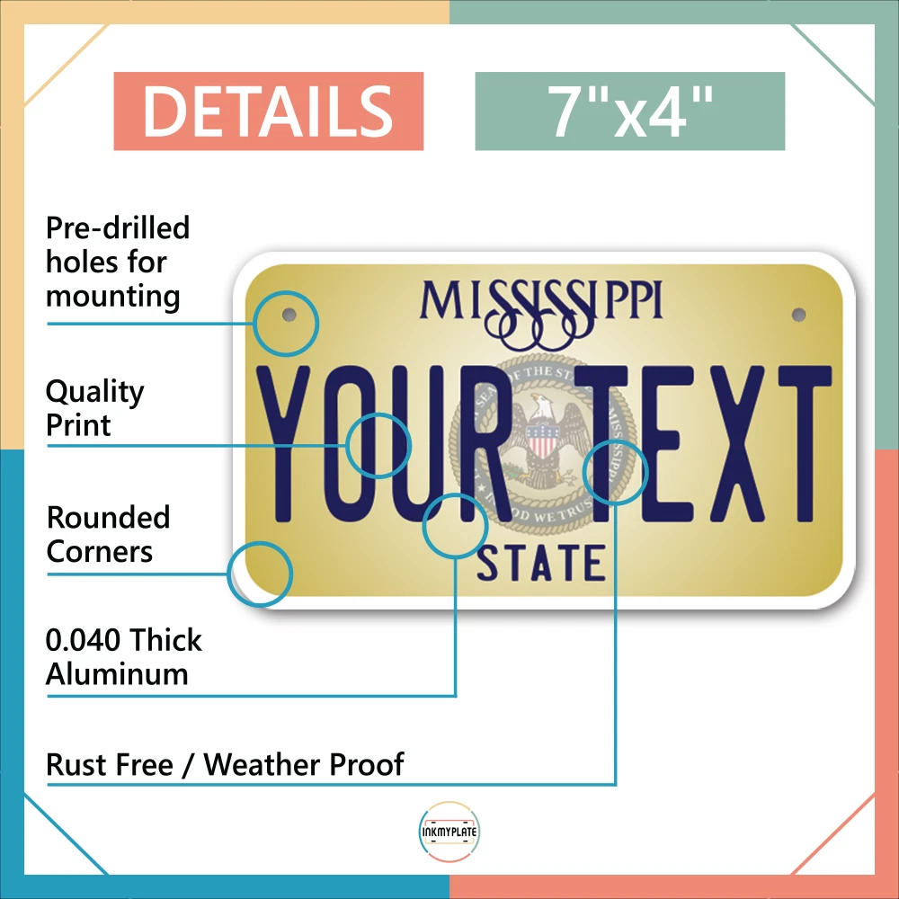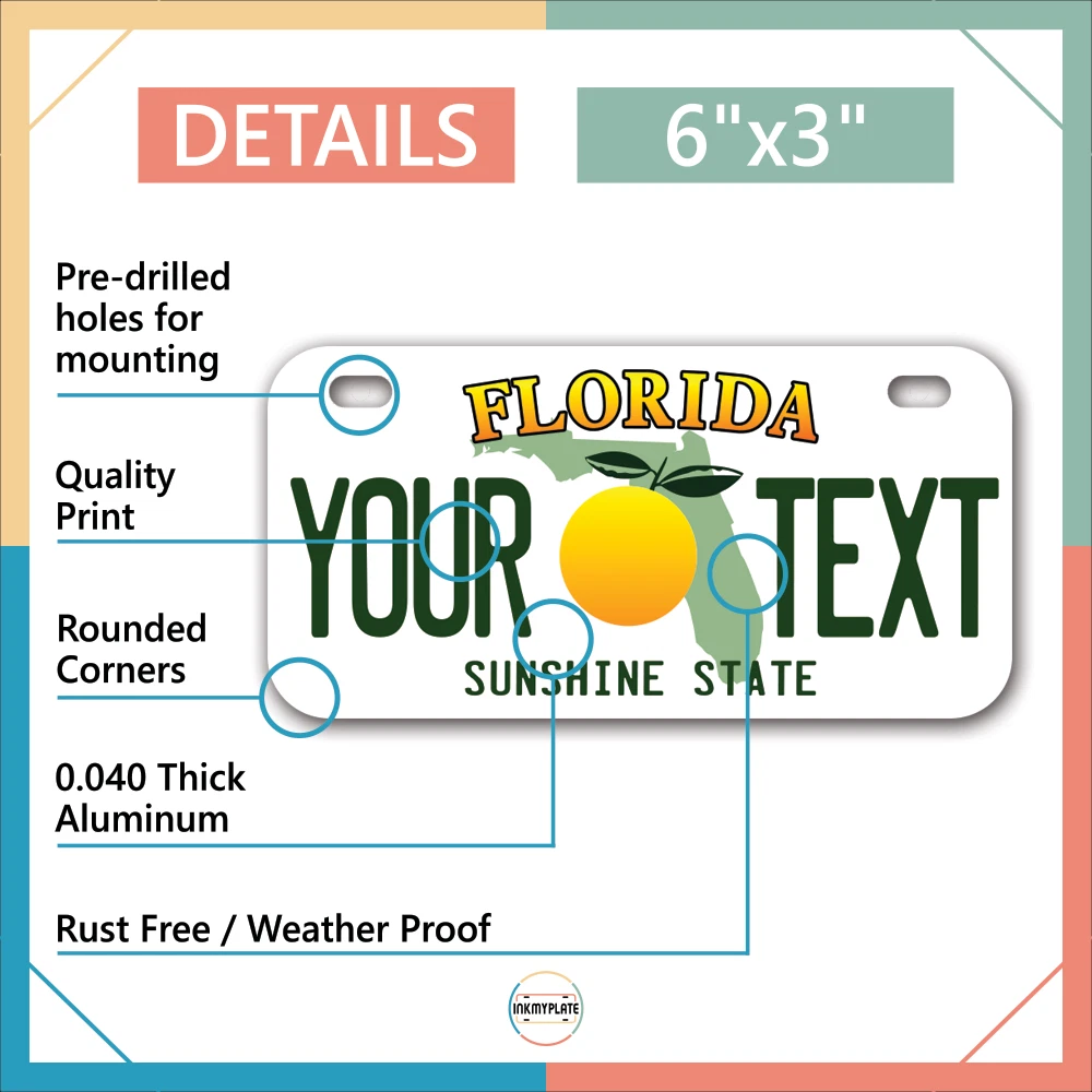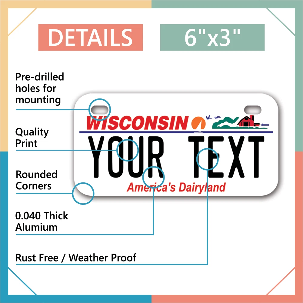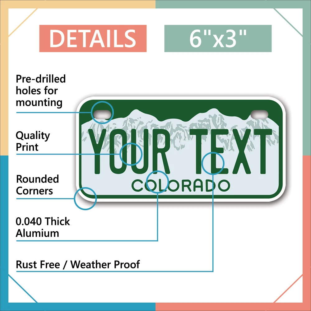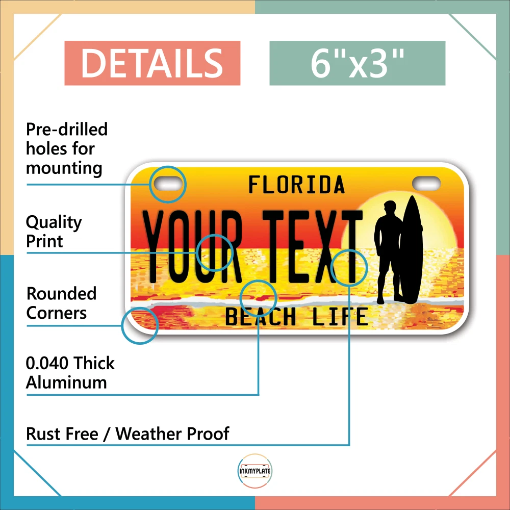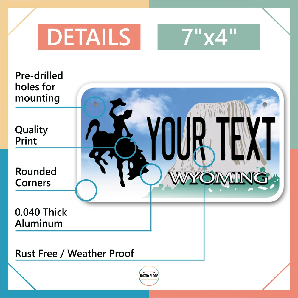 Our LICENSE plates are the most unique souvenirs from the United States, Choose between 50 states and 3 different sizes. Cannot be used in place of a state issued plate. IMPORTANT DESCRIPTION • Plates are made using High quality thick 040 rust free Aluminum. • Our plates are printed flat, not raised. The customizing is done using the latest UV Laser technique for weatherproof and high-quality finish. • 100% made in USA. • Standard car plate has four holes and can be used for trucks, motor homes, and more • M otorcycle plates have 2 holes on top for mounting and can be used on ATVS, Mopeds, Snowmobiles, wheelchairs and golf carts • B ike plates have two holes on top and can also be used for toy cars, wagons, electric toy cars, tricycles and more • Write your text in the personalization section. The text will be copied and pasted on the license plate as sent, so make sure of the spelling, punctuation, capitalization, etc. If you have any question regarding your text or you would like a preview, please let us know by adding a note or contacting Alabama | Alaska | Arizona | Arkansas | California | Colorado | Connecticut | Delaware | Florida | Georgia | Hawaii | Idaho | Illinois | Indiana | Iowa | Kansas | Kentucky | Louisiana | Maine | Maryland | Massachusetts | Michigan | Minnesota | Mississippi | Missouri | Montana | Nebraska | Nevada | New Hampshire | New Jersey | New Mexico | New York | North Carolina | North Dakota | Ohio | Oklahoma | Oregon | Pennsylvania | Puerto Rico | Rhode Island | South Carolina | South Dakota | Tennessee | Texas | Utah | Vermont | Virginia | Washington | West Virginia | Wisconsin | Wyoming