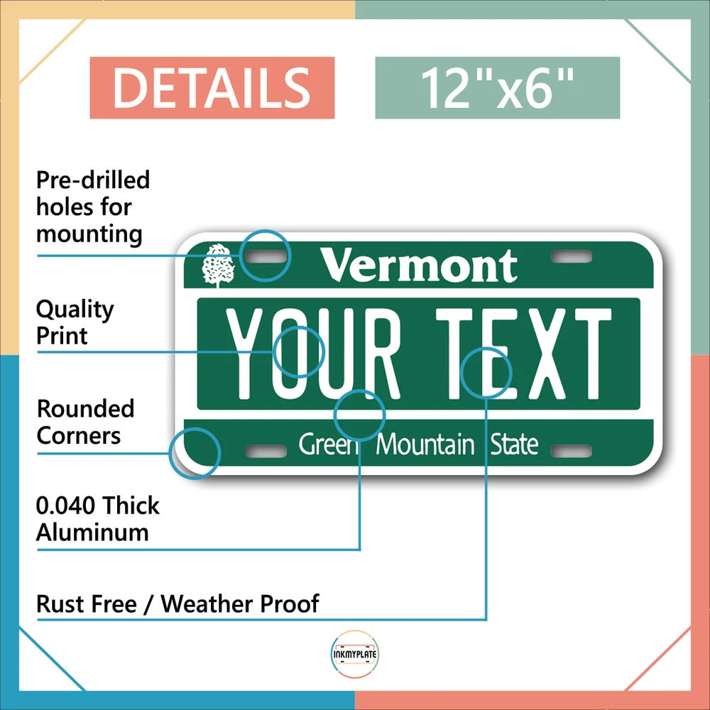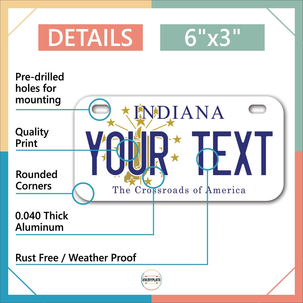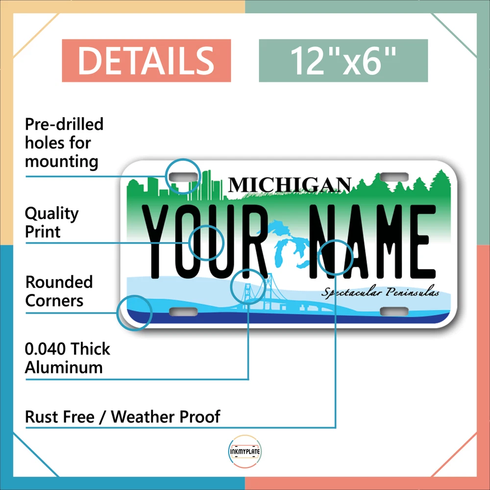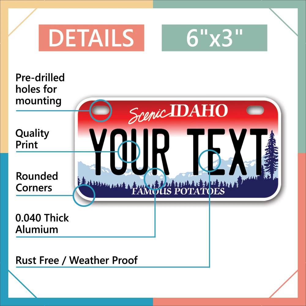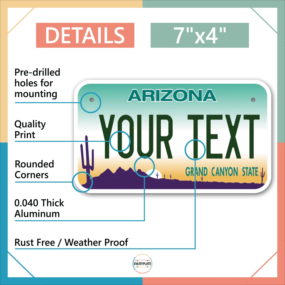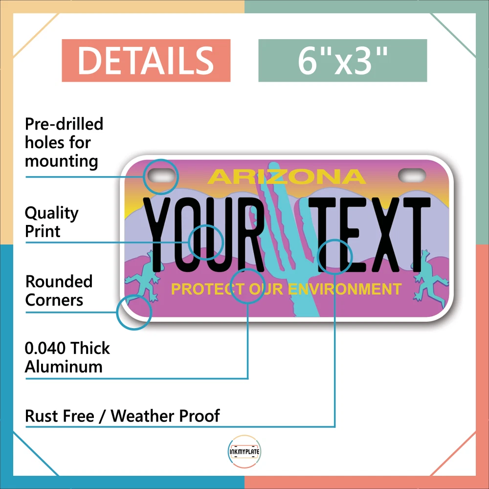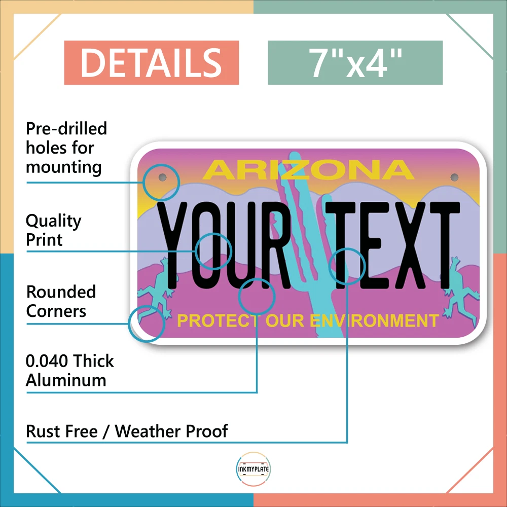Our LICENSE plates are the most unique souvenirs from the United States, Choose between 50 states and 3 different sizes. Cannot be used in place of a state issued plate. IMPORTANT DESCRIPTION • Plates are made using High quality thick 040 rust free Aluminum. • Our plates are printed flat, not raised. The customizing is done using the latest UV Laser technique for weatherproof and high-quality finish. • 100% made in USA. • Standard car plate has four holes and can be used for trucks, motor homes, and more • M otorcycle plates have 2 holes on top for mounting and can be used on ATVS, Mopeds, Snowmobiles, wheelchairs and golf carts • B ike plates have two holes on top and can also be used for toy cars, wagons, electric toy cars, tricycles and more • Write your text in the personalization section. The text will be copied and pasted on the license plate as sent, so make sure of the spelling, punctuation, capitalization, etc. If you have any question regarding your text or you would like a preview, please let us know by adding a note or contacting Alabama | Alaska | Arizona | Arkansas | California | Colorado | Connecticut | Delaware | Florida | Georgia | Hawaii | Idaho | Illinois | Indiana | Iowa | Kansas | Kentucky | Louisiana | Maine | Maryland | Massachusetts | Michigan | Minnesota | Mississippi | Missouri | Montana | Nebraska | Nevada | New Hampshire | New Jersey | New Mexico | New York | North Carolina | North Dakota | Ohio | Oklahoma | Oregon | Pennsylvania | Puerto Rico | Rhode Island | South Carolina | South Dakota | Tennessee | Texas | Utah | Vermont | Virginia | Washington | West Virginia | Wisconsin | Wyoming