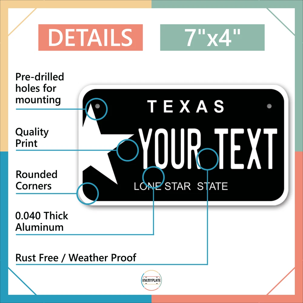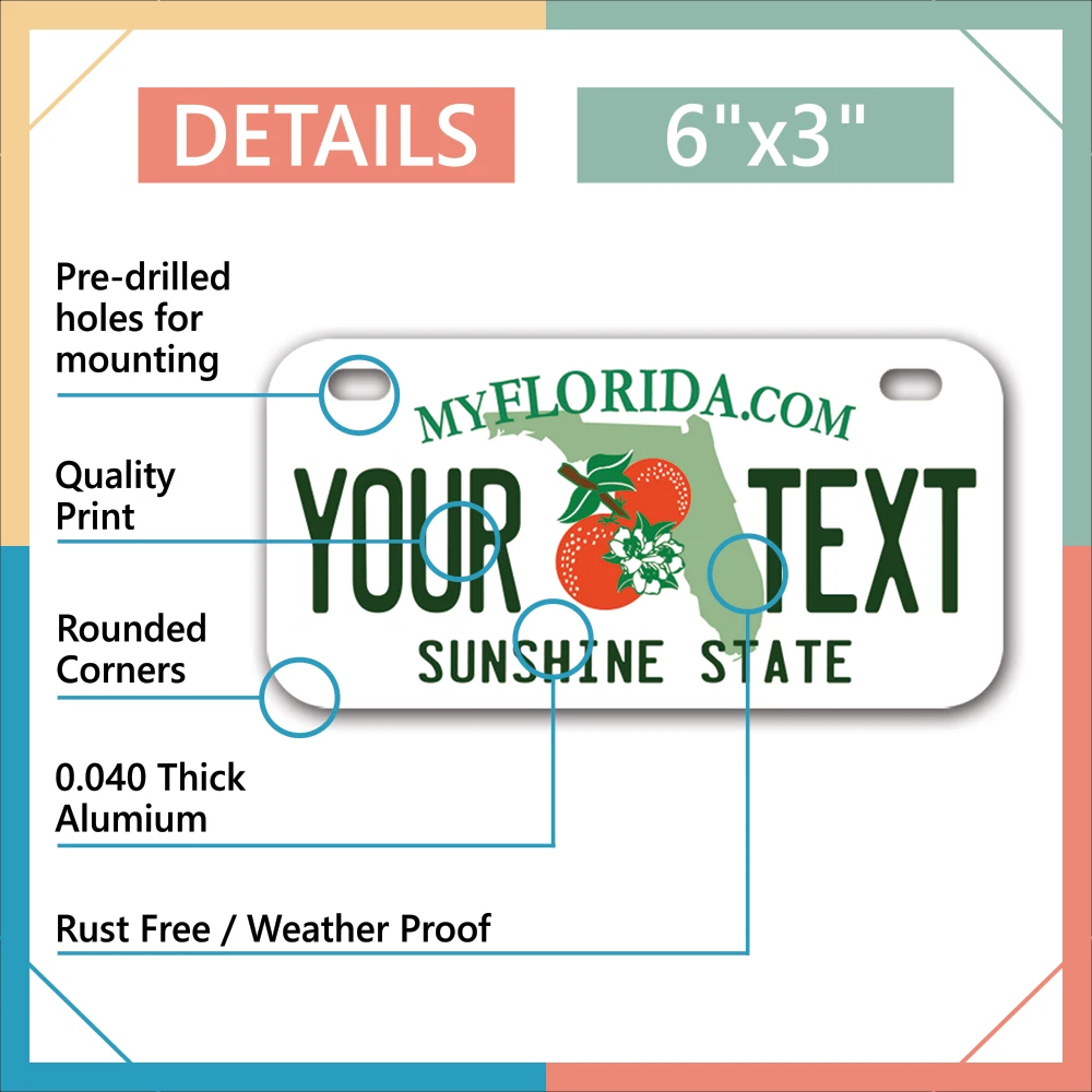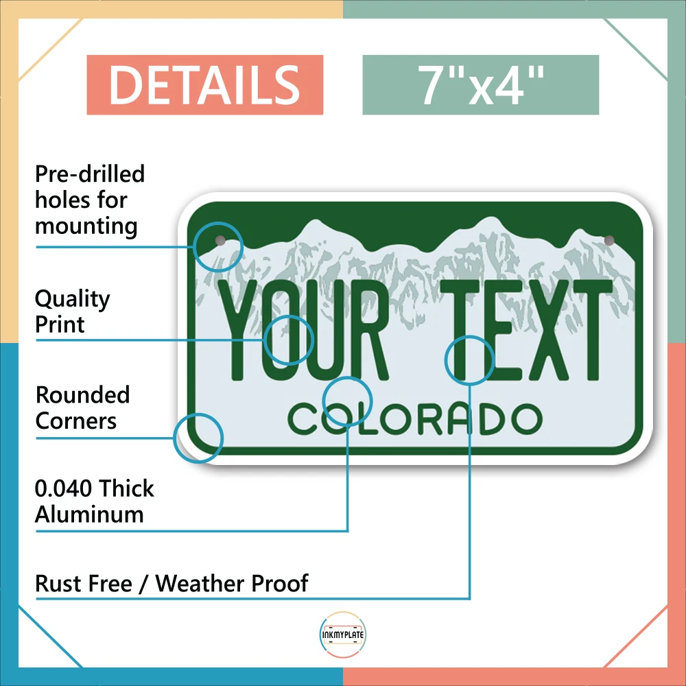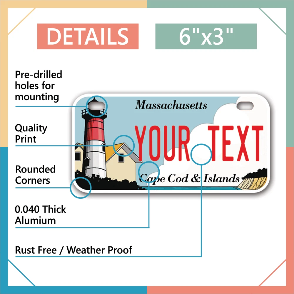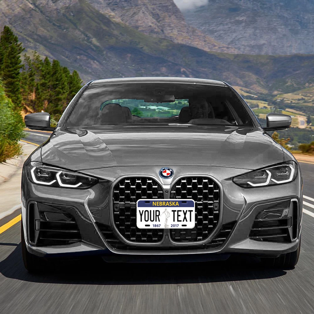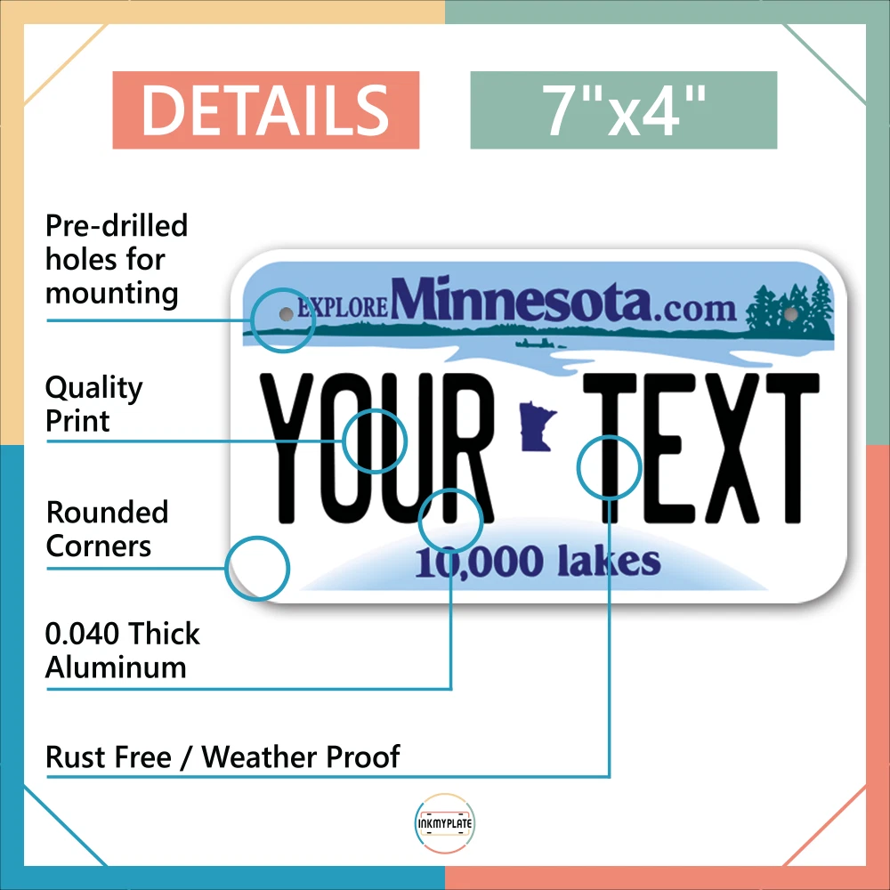 Our LICENSE plates are the most unique souvenirs from the United States, Choose between 50 states and 3 different sizes. Cannot be used in place of a state issued plate. IMPORTANT DESCRIPTION • Plates are made using High quality thick 040 rust free Aluminum. • Our plates are printed flat, not raised. The customizing is done using the latest UV Laser technique for weatherproof and high-quality finish. • 100% made in USA. • Standard car plate has four holes and can be used for trucks, motor homes, and more • M otorcycle plates have 2 holes on top for mounting and can be used on ATVS, Mopeds, Snowmobiles, wheelchairs and golf carts • B ike plates have two holes on top and can also be used for toy cars, wagons, electric toy cars, tricycles and more • Write your text in the personalization section. The text will be copied and pasted on the license plate as sent, so make sure of the spelling, punctuation, capitalization, etc. If you have any question regarding your text or you would like a preview, please let us know by adding a note or contacting Alabama | Alaska | Arizona | Arkansas | California | Colorado | Connecticut | Delaware | Florida | Georgia | Hawaii | Idaho | Illinois | Indiana | Iowa | Kansas | Kentucky | Louisiana | Maine | Maryland | Massachusetts | Michigan | Minnesota | Mississippi | Missouri | Montana | Nebraska | Nevada | New Hampshire | New Jersey | New Mexico | New York | North Carolina | North Dakota | Ohio | Oklahoma | Oregon | Pennsylvania | Puerto Rico | Rhode Island | South Carolina | South Dakota | Tennessee | Texas | Utah | Vermont | Virginia | Washington | West Virginia | Wisconsin | Wyoming