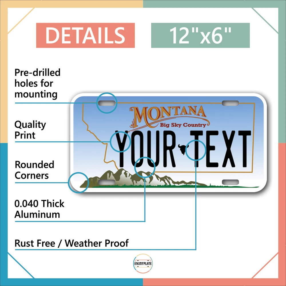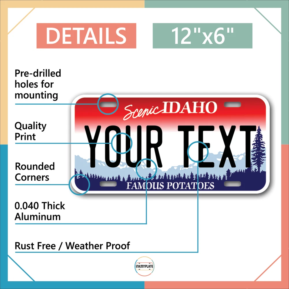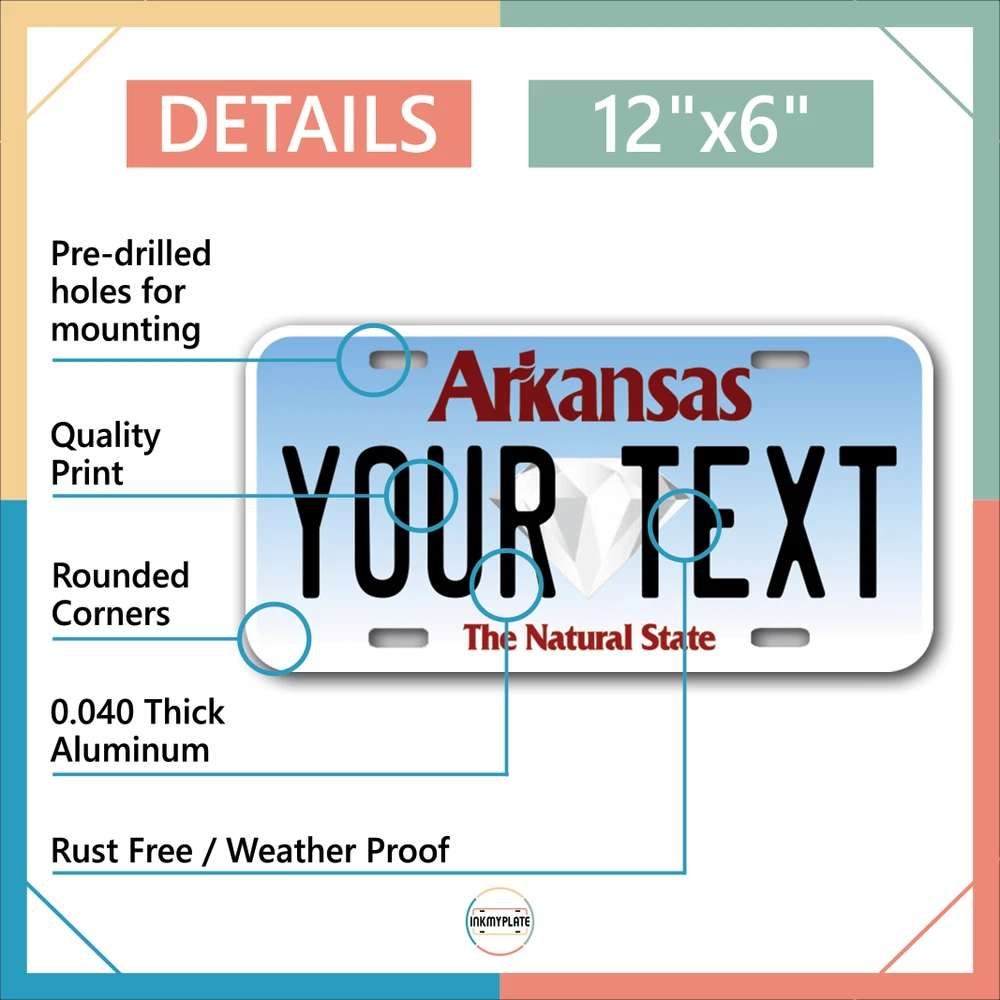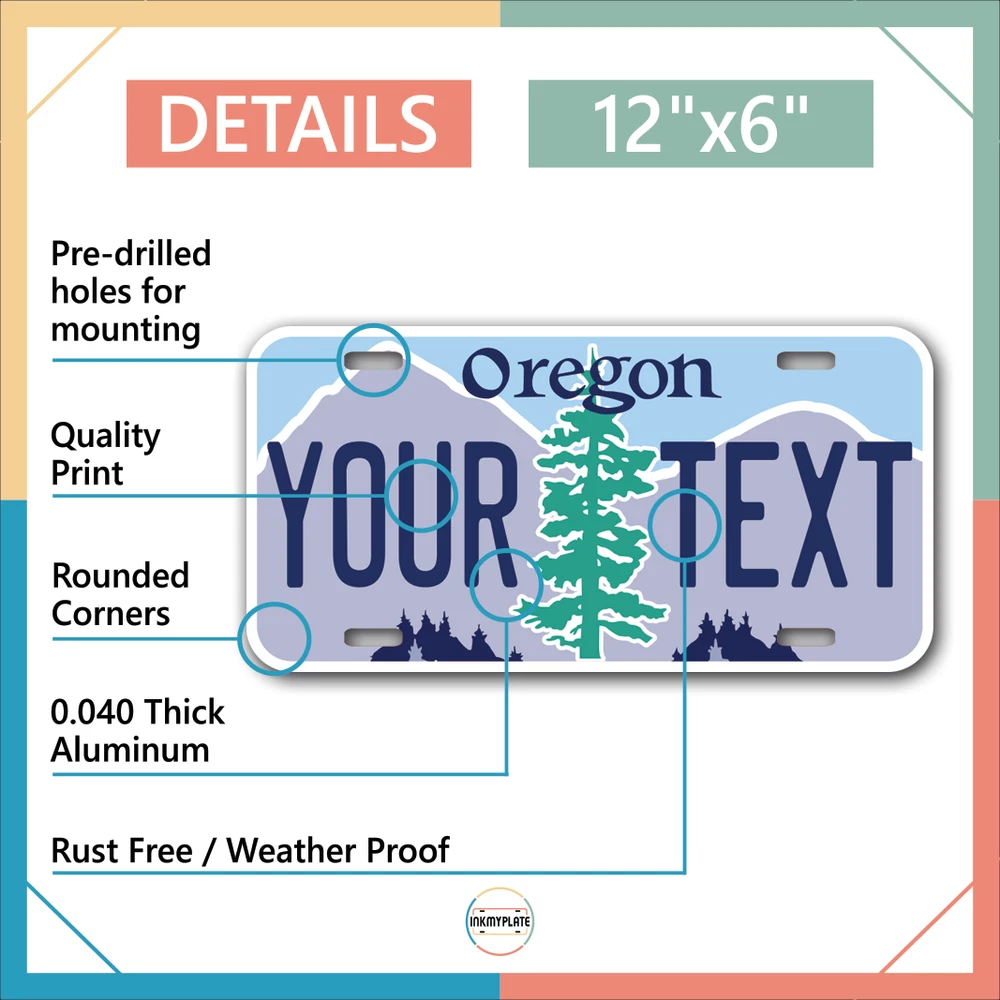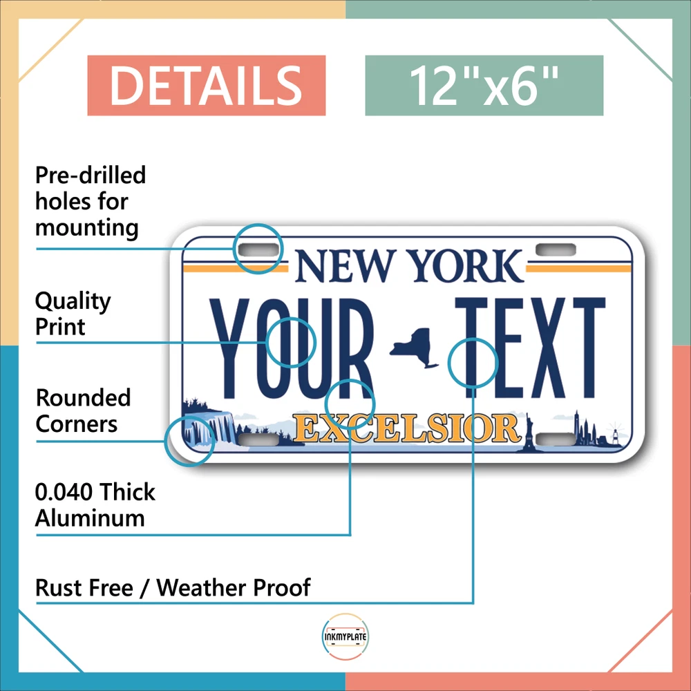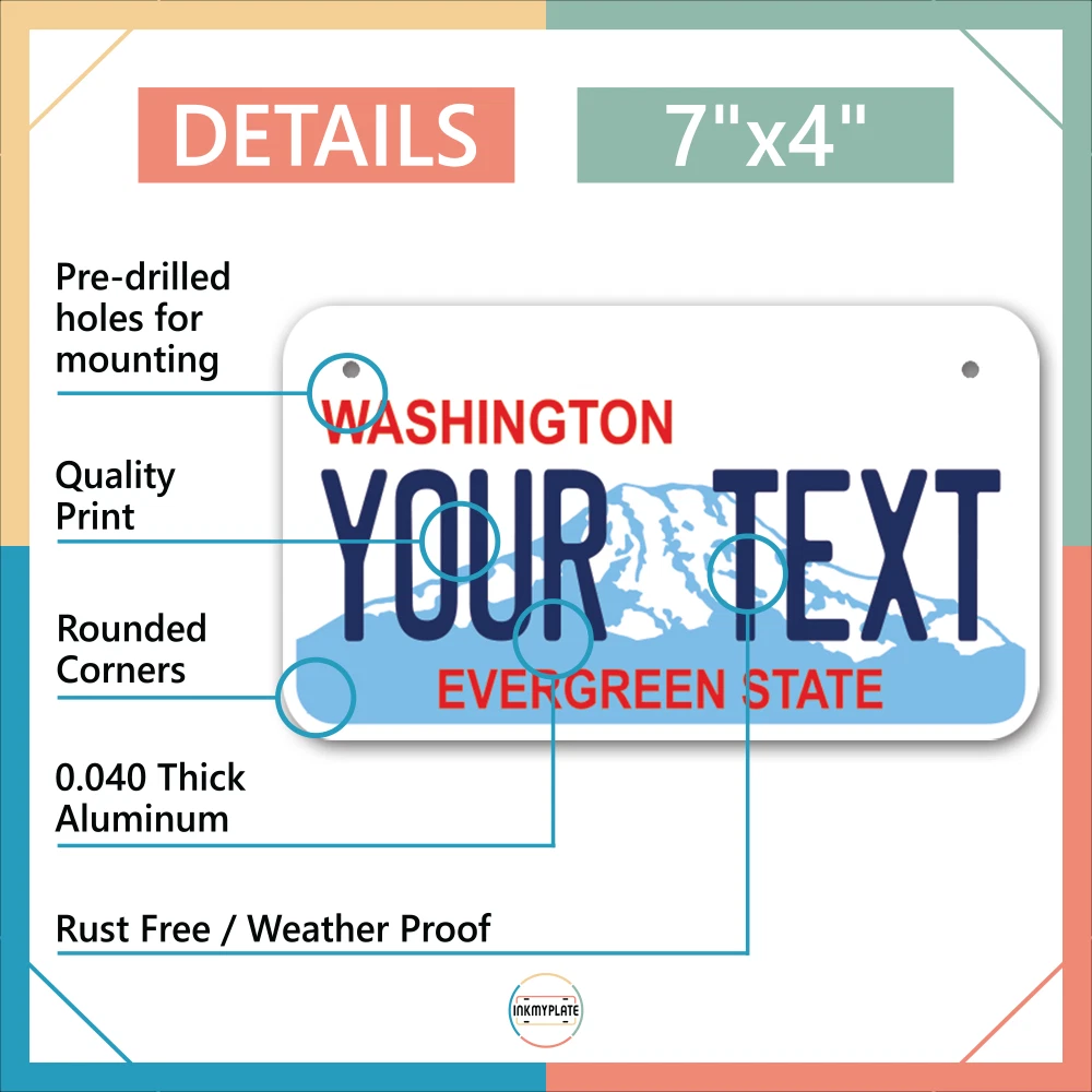 Our LICENSE plates are the most unique souvenirs from the United States, Choose between 50 states and 3 different sizes. Cannot be used in place of a state issued plate. IMPORTANT DESCRIPTION • Plates are made using High quality thick 040 rust free Aluminum. • Our plates are printed flat, not raised. The customizing is done using the latest UV Laser technique for weatherproof and high-quality finish. • 100% made in USA. • Standard car plate has four holes and can be used for trucks, motor homes, and more • M otorcycle plates have 2 holes on top for mounting and can be used on ATVS, Mopeds, Snowmobiles, wheelchairs and golf carts • B ike plates have two holes on top and can also be used for toy cars, wagons, electric toy cars, tricycles and more • Write your text in the personalization section. The text will be copied and pasted on the license plate as sent, so make sure of the spelling, punctuation, capitalization, etc. If you have any question regarding your text or you would like a preview, please let us know by adding a note or contacting Alabama | Alaska | Arizona | Arkansas | California | Colorado | Connecticut | Delaware | Florida | Georgia | Hawaii | Idaho | Illinois | Indiana | Iowa | Kansas | Kentucky | Louisiana | Maine | Maryland | Massachusetts | Michigan | Minnesota | Mississippi | Missouri | Montana | Nebraska | Nevada | New Hampshire | New Jersey | New Mexico | New York | North Carolina | North Dakota | Ohio | Oklahoma | Oregon | Pennsylvania | Puerto Rico | Rhode Island | South Carolina | South Dakota | Tennessee | Texas | Utah | Vermont | Virginia | Washington | West Virginia | Wisconsin | Wyoming