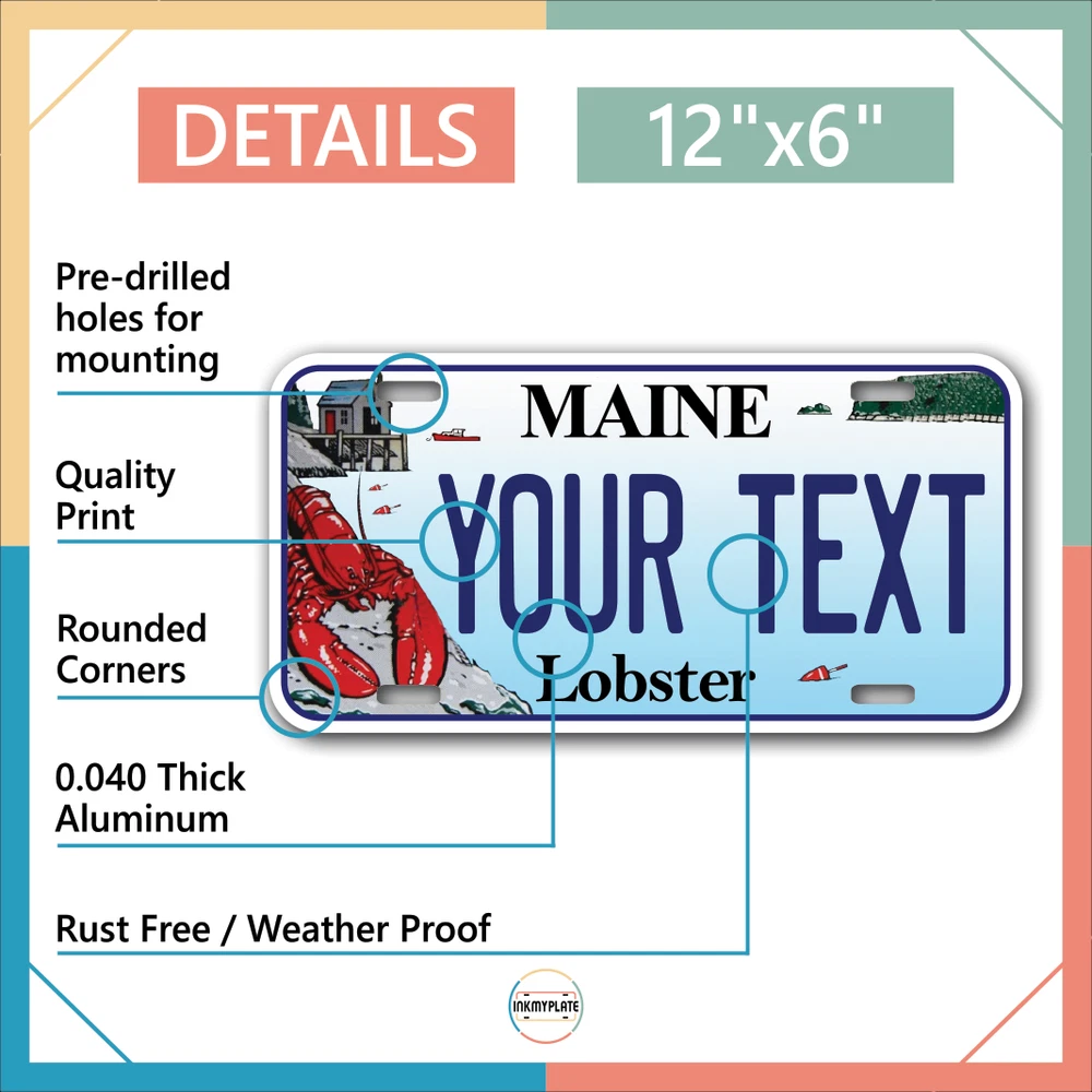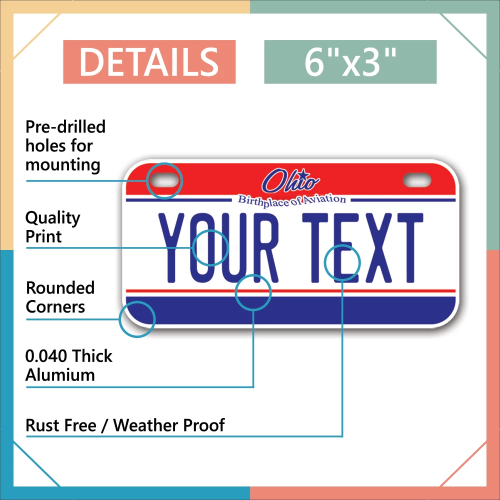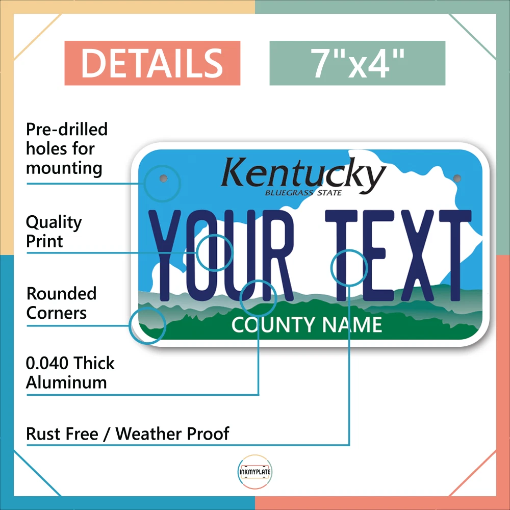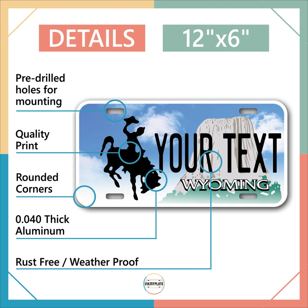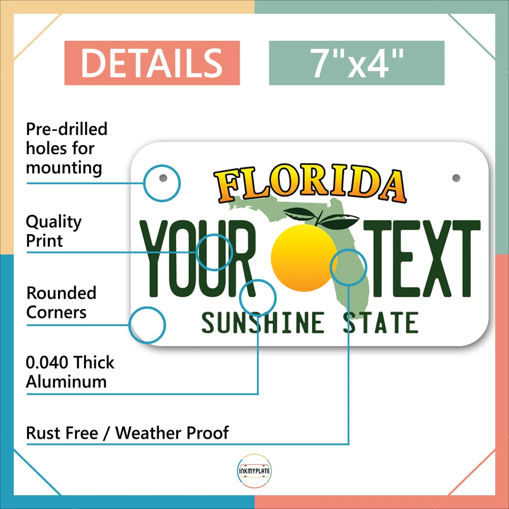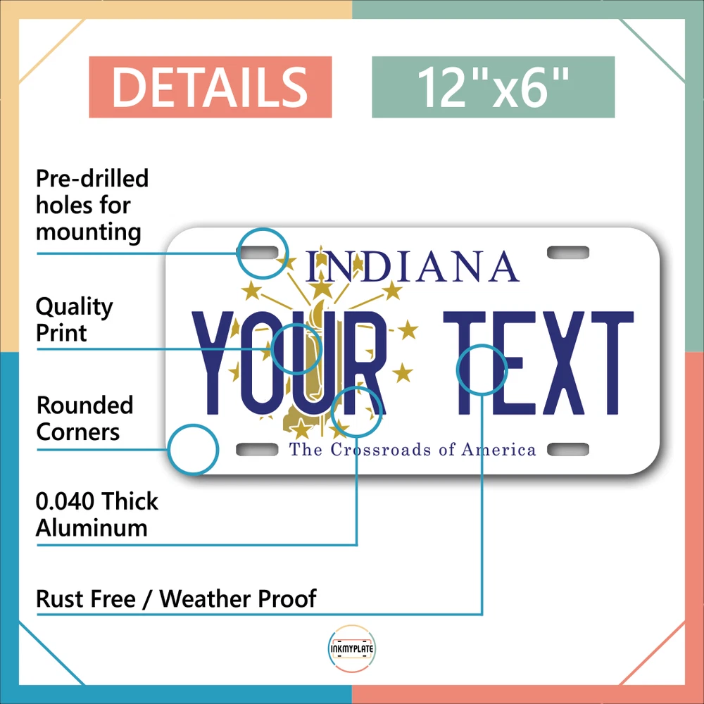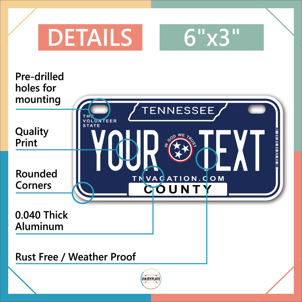 Our LICENSE plates are the most unique souvenirs from the United States, Choose between 50 states and 3 different sizes. Cannot be used in place of a state issued plate. IMPORTANT DESCRIPTION • Plates are made using High quality thick 040 rust free Aluminum. • Our plates are printed flat, not raised. The customizing is done using the latest UV Laser technique for weatherproof and high-quality finish. • 100% made in USA. • Standard car plate has four holes and can be used for trucks, motor homes, and more • M otorcycle plates have 2 holes on top for mounting and can be used on ATVS, Mopeds, Snowmobiles, wheelchairs and golf carts • B ike plates have two holes on top and can also be used for toy cars, wagons, electric toy cars, tricycles and more • Write your text in the personalization section. The text will be copied and pasted on the license plate as sent, so make sure of the spelling, punctuation, capitalization, etc. If you have any question regarding your text or you would like a preview, please let us know by adding a note or contacting Alabama | Alaska | Arizona | Arkansas | California | Colorado | Connecticut | Delaware | Florida | Georgia | Hawaii | Idaho | Illinois | Indiana | Iowa | Kansas | Kentucky | Louisiana | Maine | Maryland | Massachusetts | Michigan | Minnesota | Mississippi | Missouri | Montana | Nebraska | Nevada | New Hampshire | New Jersey | New Mexico | New York | North Carolina | North Dakota | Ohio | Oklahoma | Oregon | Pennsylvania | Puerto Rico | Rhode Island | South Carolina | South Dakota | Tennessee | Texas | Utah | Vermont | Virginia | Washington | West Virginia | Wisconsin | Wyoming