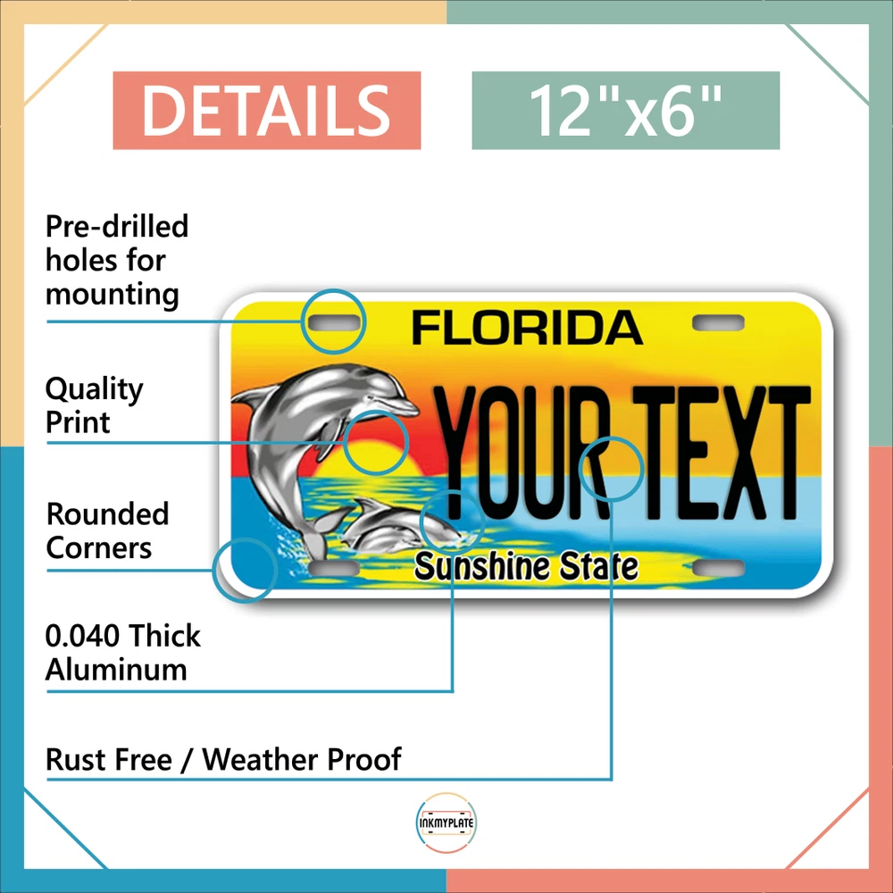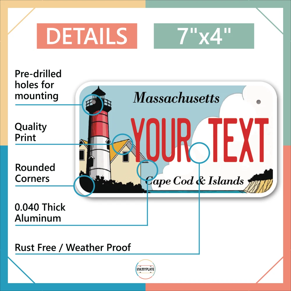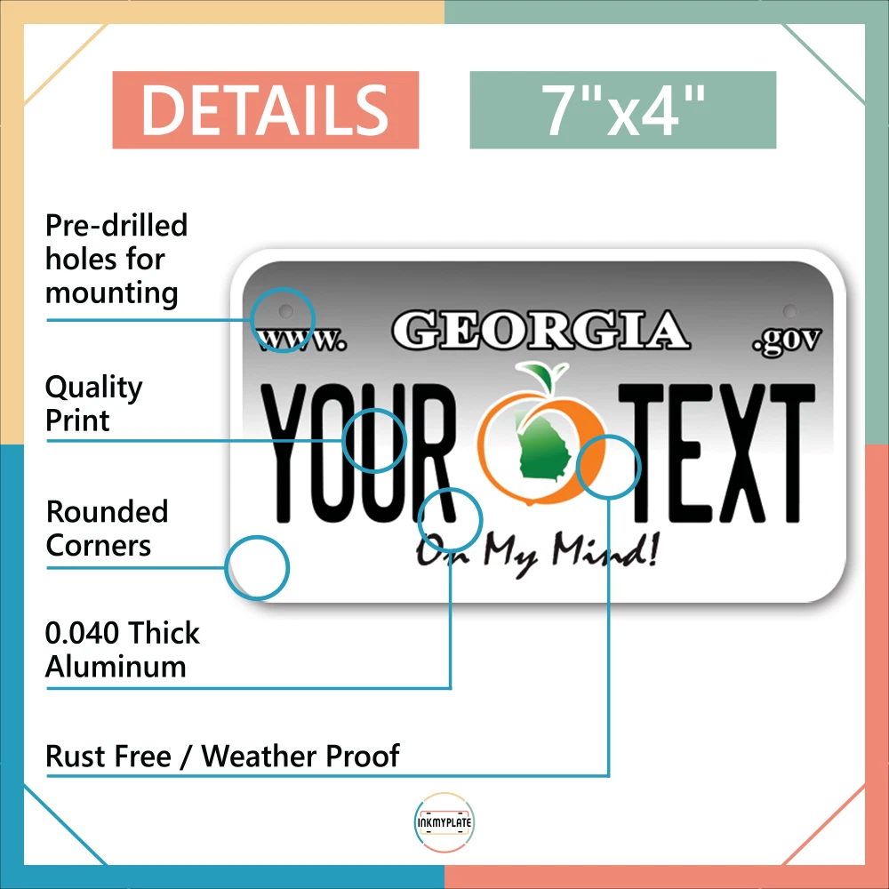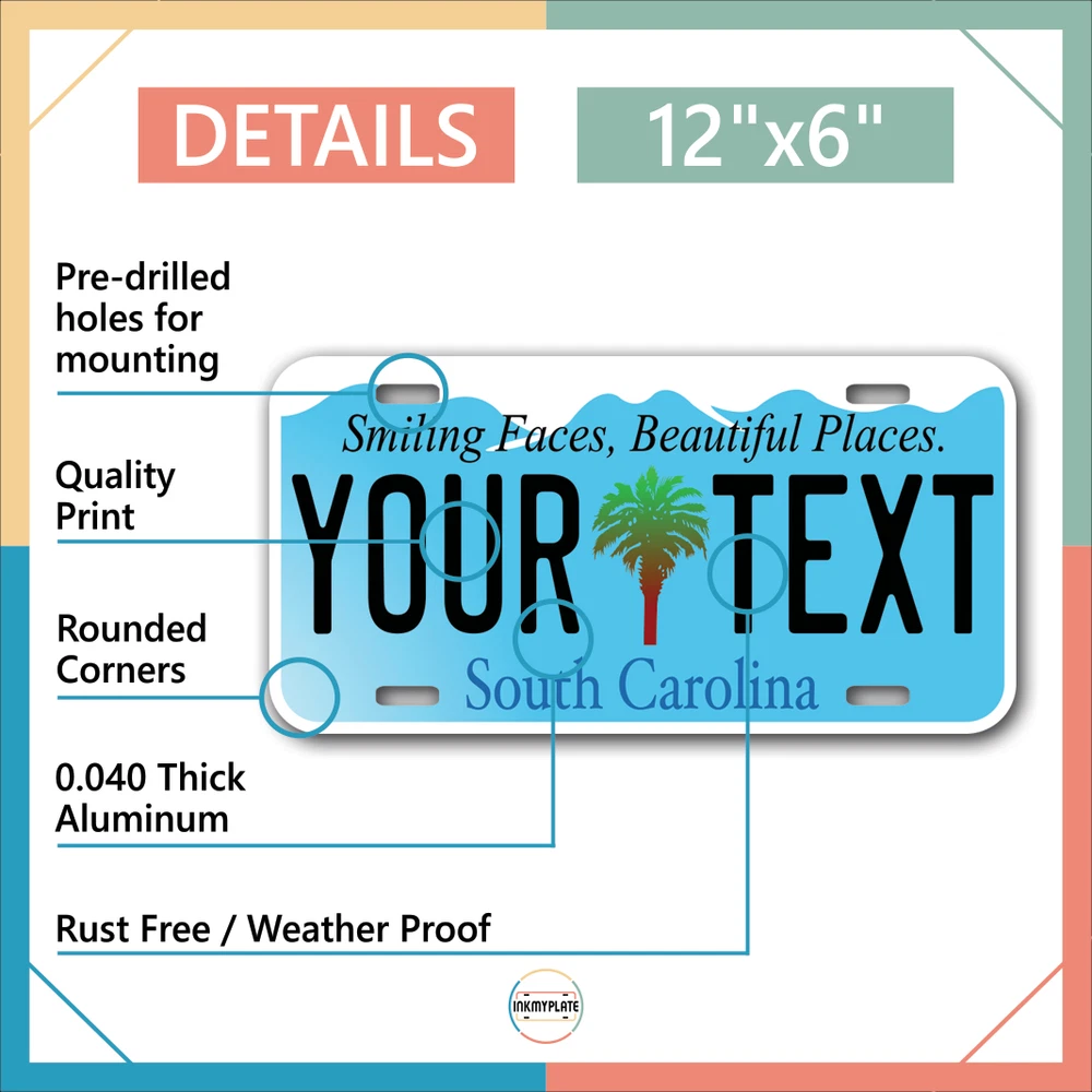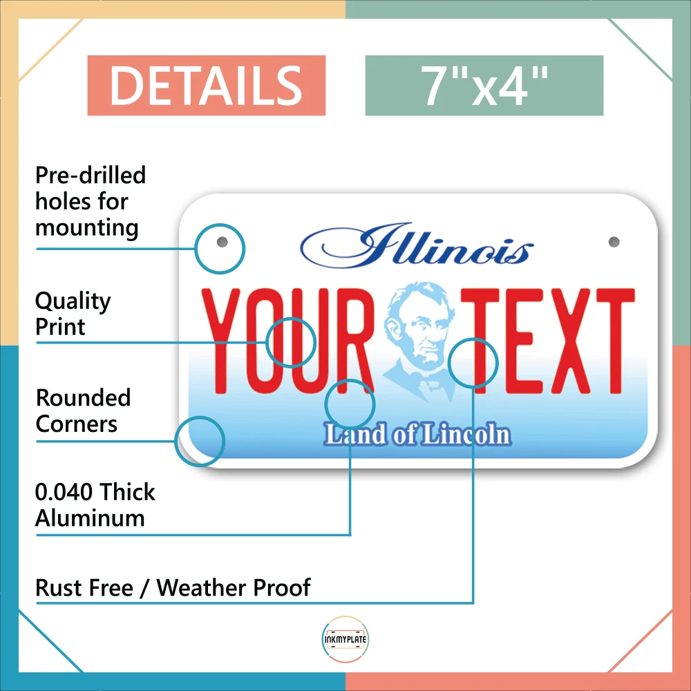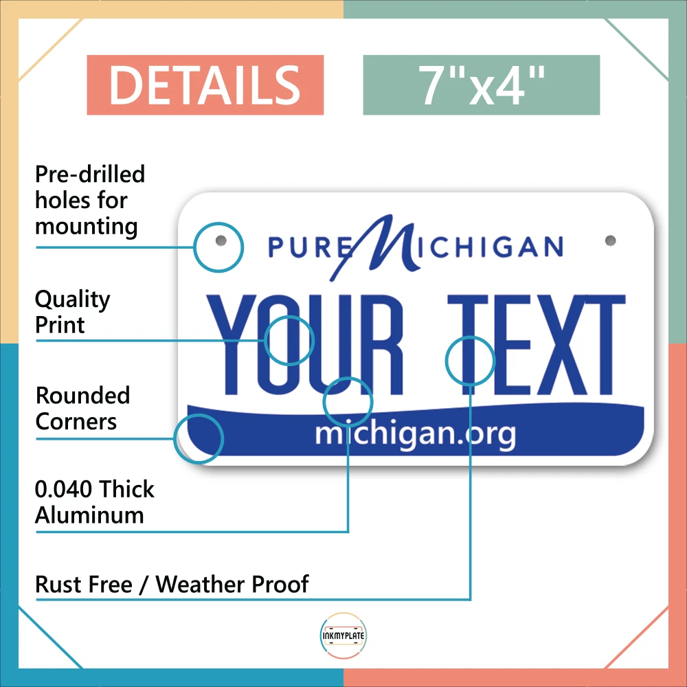 Our LICENSE plates are the most unique souvenirs from the United States, Choose between 50 states and 3 different sizes. Cannot be used in place of a state issued plate. IMPORTANT DESCRIPTION • Plates are made using High quality thick 040 rust free Aluminum. • Our plates are printed flat, not raised. The customizing is done using the latest UV Laser technique for weatherproof and high-quality finish. • 100% made in USA. • Standard car plate has four holes and can be used for trucks, motor homes, and more • M otorcycle plates have 2 holes on top for mounting and can be used on ATVS, Mopeds, Snowmobiles, wheelchairs and golf carts • B ike plates have two holes on top and can also be used for toy cars, wagons, electric toy cars, tricycles and more • Write your text in the personalization section. The text will be copied and pasted on the license plate as sent, so make sure of the spelling, punctuation, capitalization, etc. If you have any question regarding your text or you would like a preview, please let us know by adding a note or contacting Alabama | Alaska | Arizona | Arkansas | California | Colorado | Connecticut | Delaware | Florida | Georgia | Hawaii | Idaho | Illinois | Indiana | Iowa | Kansas | Kentucky | Louisiana | Maine | Maryland | Massachusetts | Michigan | Minnesota | Mississippi | Missouri | Montana | Nebraska | Nevada | New Hampshire | New Jersey | New Mexico | New York | North Carolina | North Dakota | Ohio | Oklahoma | Oregon | Pennsylvania | Puerto Rico | Rhode Island | South Carolina | South Dakota | Tennessee | Texas | Utah | Vermont | Virginia | Washington | West Virginia | Wisconsin | Wyoming