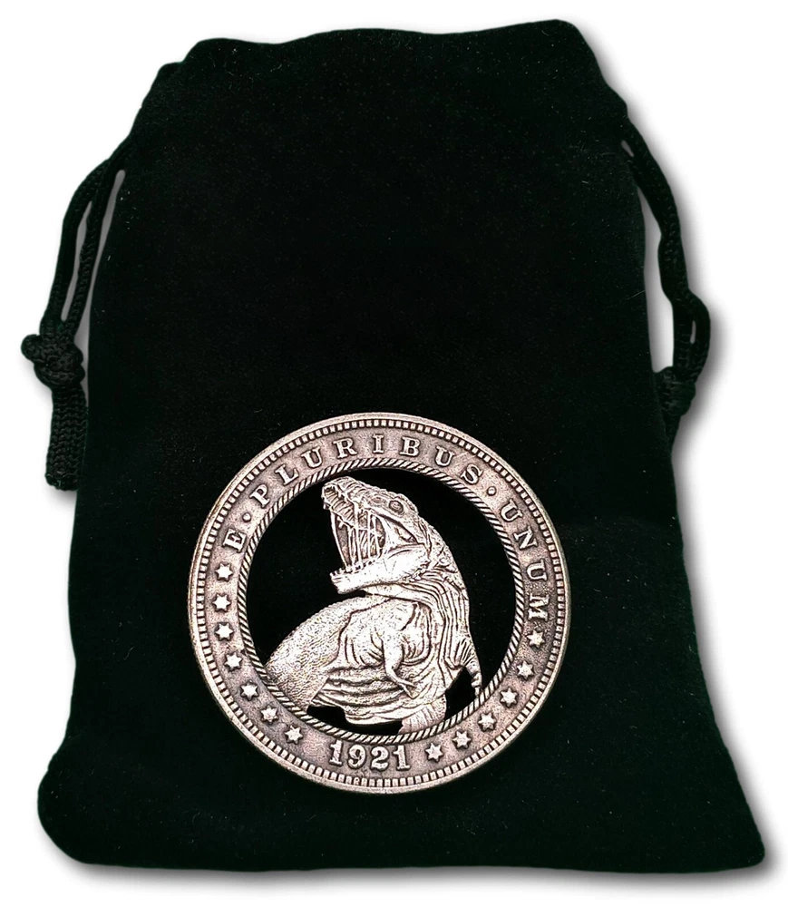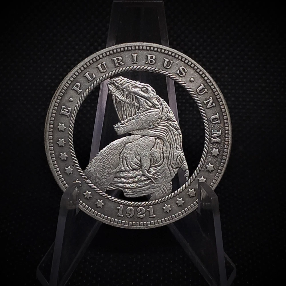Cut Coin Dollar Dinosaur Raptor T-Rex Prehistoric Fantasy Hobo Coin Art This is a Hand Cut American Customized Dollar, perfect for any occasion and a great conversation starter Perfect for those who love coins and money, signs and symbols, and memorial jewelry. Don't miss out on this beautiful, one-of-a-kind, unique Hand Cut Hobo Coin. Im sorry these are much better in person....... Im an Master Artist but im not a photographer so im still figuring that part out :P So i can guarantee you will love it because i pay attention to the smallest of details to make it perfect. If you have any questions feel free to contact me and i will get back to you as soon as i can