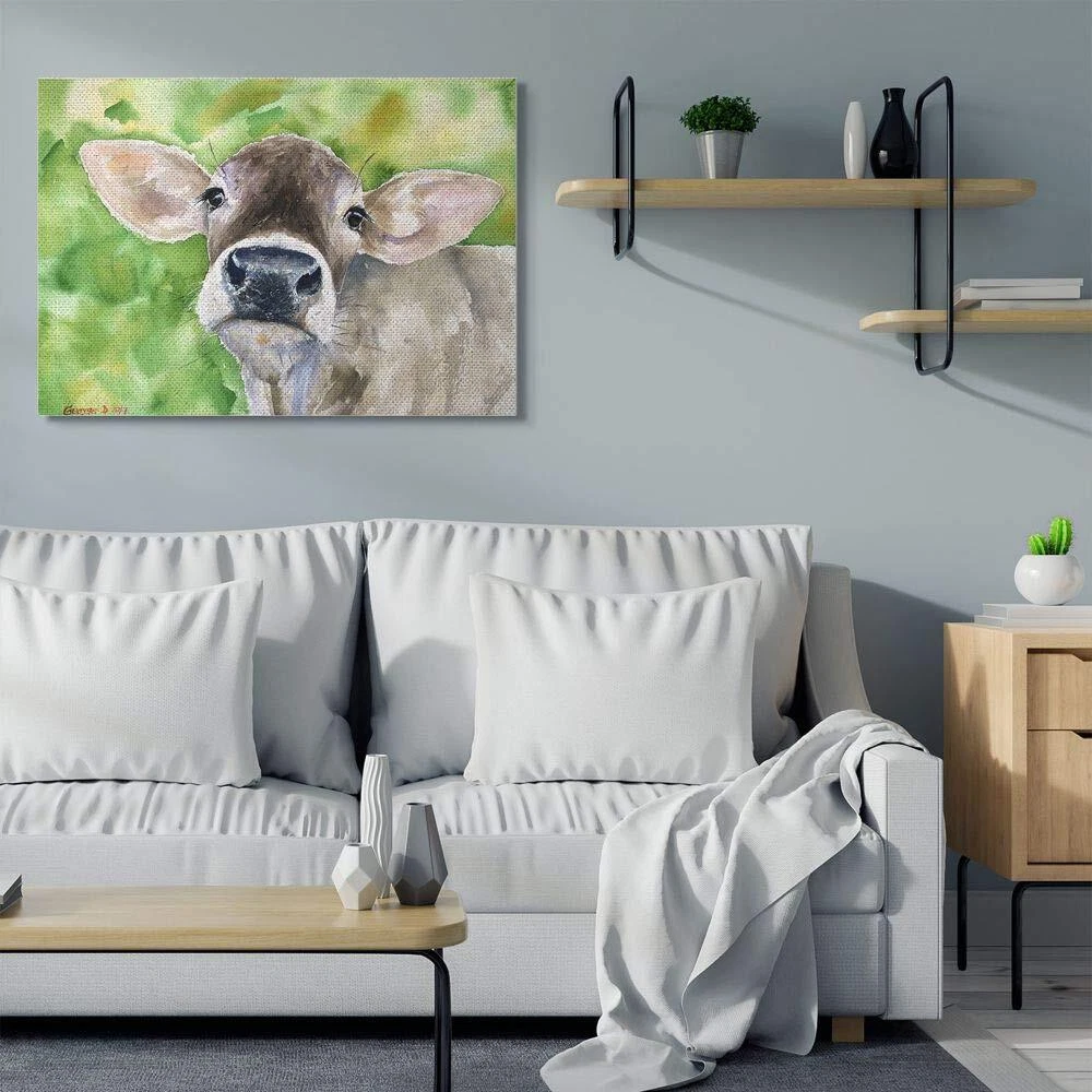 Cute Baby Cow Animal Green Watercolor Painting Canvas Wall Art, 36 x 48, Mult...