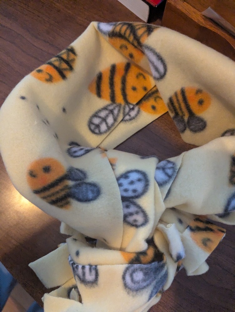 A thick winter scarf, fleece material made from a cotton and polyester blend. Features cute bee pattern on the scarf. This scarf is handmade and has never been worn, it's new. Has cute fringe at ends of the scarf. I tried to show it all in pictures, it's a bit longer so can be wrapped twice.