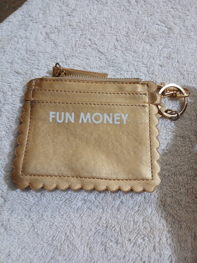 This adorable gold keychain cardholder coin purse is perfect for any child star or party fun money Wallet. Made of faux leather and acrylic material, this XS size wallet features a geometric pattern with a zipper and logo accents. The zip-around style and money theme make it a great addition to any woman's accessories collection. With credit card slots and a packed party fund, this wallet is both functional and fashionable. The gold color and leather fabric type add a touch of luxury to any outfit. Whether you're looking for a small wallet for your everyday essentials or a fun accessory for a night out, this Money brand wallet is the perfect choice.