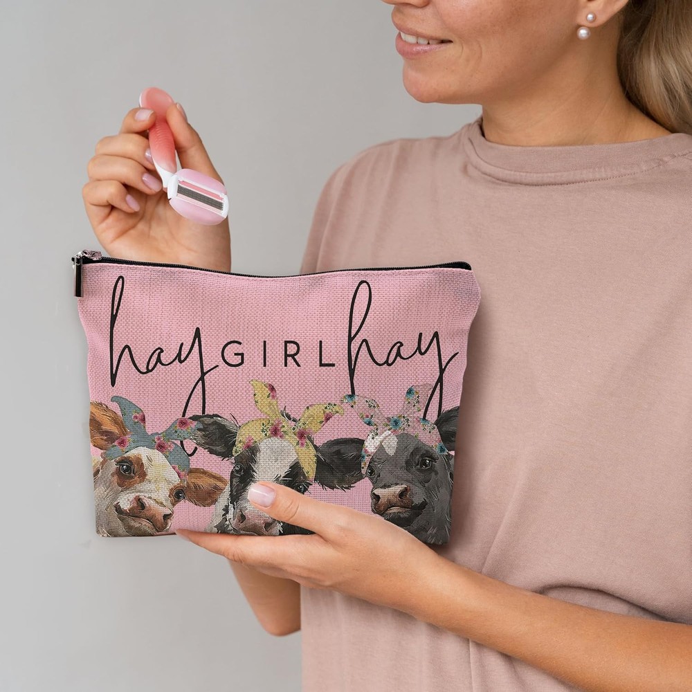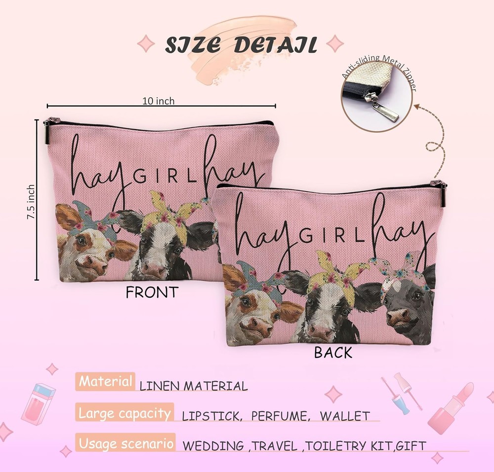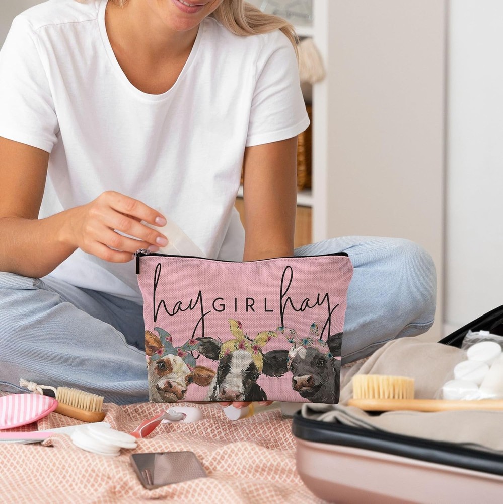 This small travel makeup bag is absolutely adorable! The cute cow print and soft pink color make it so charming, and the linen fabric feels high-quality yet lightweight. It fits perfectly in my purse and holds all my essentials without taking up much space. The material is durable and easy to clean, plus the vibrant colors stay bright. Super practical and stylish—love it!
