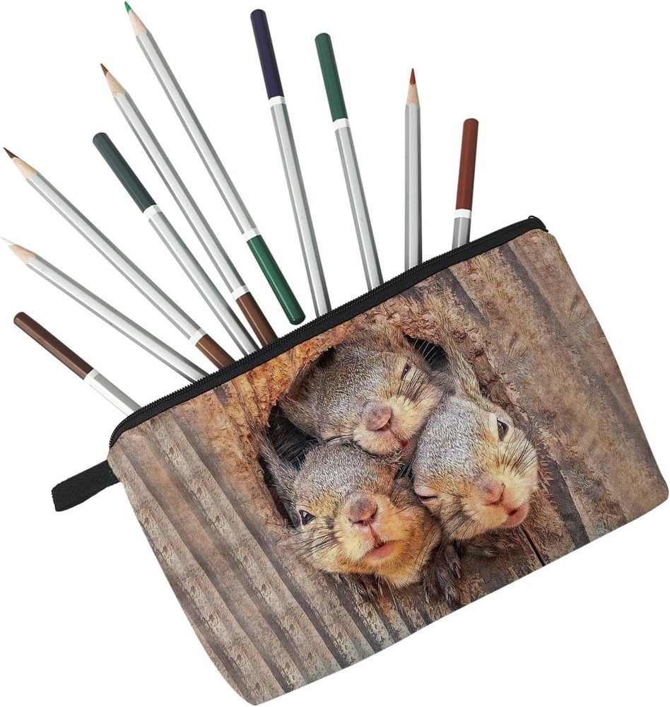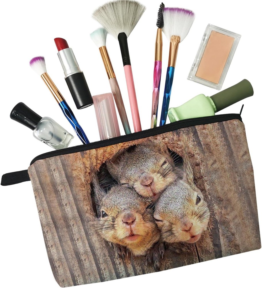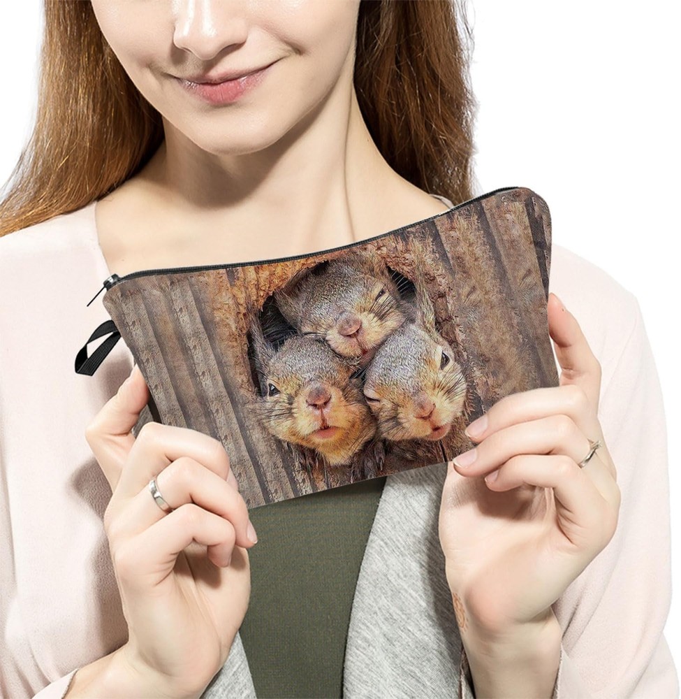 This cute squirrel makeup bag is absolutely adorable and perfect for travel! The quality is great—soft yet sturdy polyester with a smooth metal zipper that glides easily. It’s super lightweight and fits nicely in my purse, holding all my essentials without taking up space. The design is whimsical and fun, making it a fantastic gift for sisters or friends who love quirky accessories. Plus, it’s easy to wipe clean—so practical! Definitely recommending this little gem.