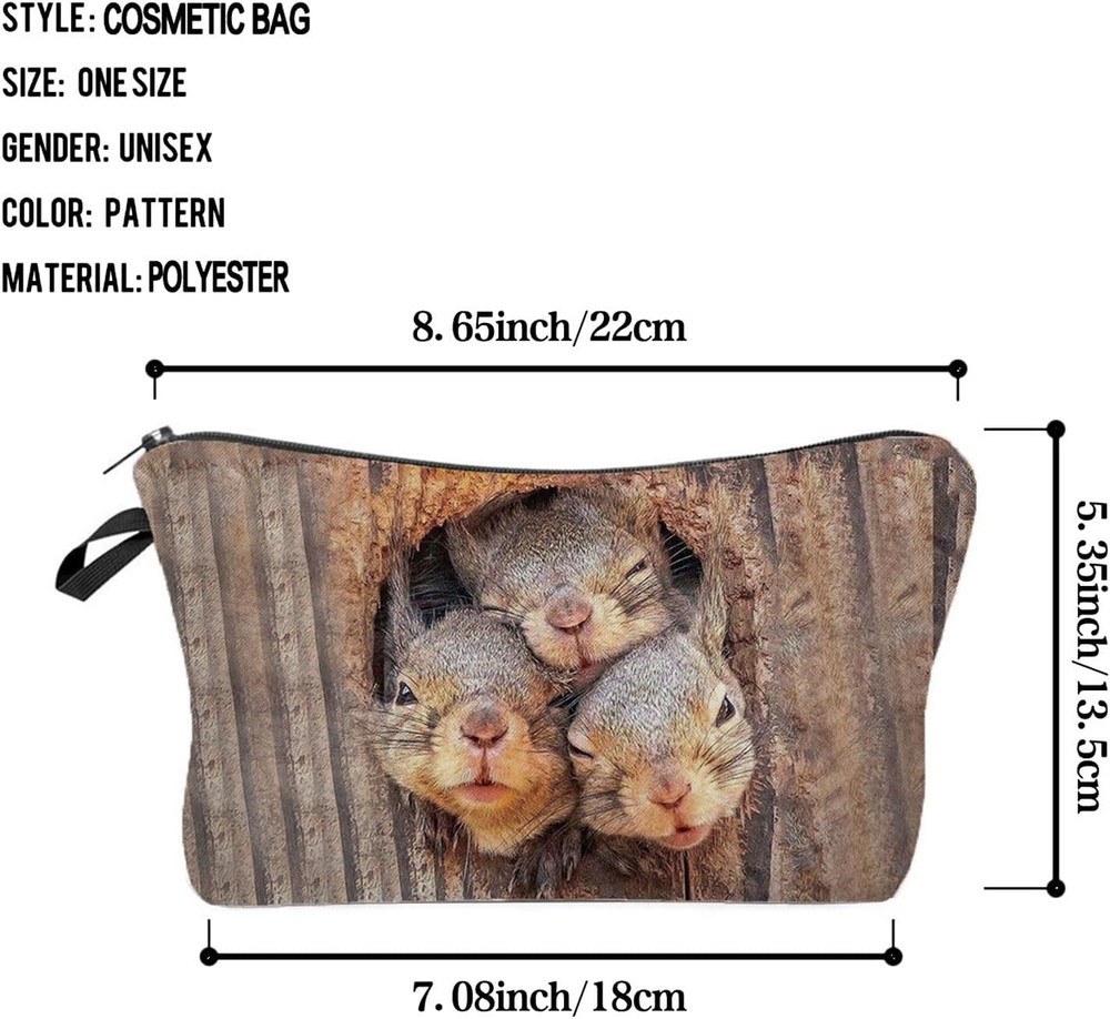 Squirrel Cosmetic Bag for Women Cute Small Makeup Bag for Purse Travel Toiletry Zipper Pouch for Girls Gift for Sisters Squirrel Makeup Bag for Her Product Details Product Dimensions: 8.65 x 2 x 5.35 inches Item Weight: 0.634 ounces Department: Unisex Manufacturer: Livel lhood Country of Origin: China Item model number: 275-3 1.Durable Material: The Squirrel cosmetic bag is made from soft Polyester with a metal zipper. It's soft, smooth, hardy and durable, and has a high quality. It's easy to clean with a lightweight which means easy to carry. 2.Fashion Design: The Squirrel cosmetic bag has a clear and vibrant design, double-sided printing. There are different kinds of cute, lovely, funny and beautiful patterns to choose. The makeup bag fits both the popular aesthetic and unique personalities. 3.Good Size:8.65 in* 2 in* 5.35 in. 25 grams weight. The cosmetic bag is easy to carry make-up tools like lipsticks, eye shadows, brushes, sunscreens, etc. The makeup bag is also able to carry stationery, medicines, coins, cards and other personal effects. 4.Fits: Makeup bags and gifts for women, girls, animal lovers, friends, teenagers, family members on Christmas, New Year, Mother's Day, Thanksgiving, Valentine's Day and other holidays as well as birthdays and memorial days. Receiving a gift like this bag will make her happy. This is also a good way to express love and show her or their personalities. 5.Applicable Occasion: Ideal for travel, vacations, business trips, gyms, camping and other outdoor activities. These cosmetic bags can be used as makeup bags, coin purses, cellphone pouches, medicine storage bags and so on.
