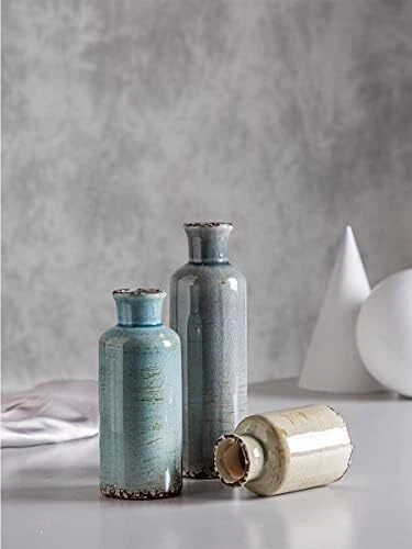 CwlwGO- Ceramic vase 3 Piece Set, Small Flower for Home Multicolored Product Details Material: Ceramic Color: Multicolored Brand: CwlwGO Product Dimensions: 3.2"L x 3.2"W x 10"H Shape: Round Multifunctional decorative vase set: Artificial flowers or fresh flowers that can be Color Choice Will Fit In With An Abundance Of Styles In Any Room , You Will Find One That Fits Your Need, Also Use The Decorative Vase As Flower Vases For Centerpieces, Fireplace Mantel Decor, Dinning Table Decorations.Decorating Your Home Brings Your Personality To Life - Show Your Style With Confidence,To Take Your Décor To The Next Level,And Impress Your Guests. Advantages: The distressed design is so stunning, Color(Teal Gray,Blue,Green),you can use it on its own as a beautiful piece, or add faux flowers, stems, bouquets and greens for a pop of color. Everyday Office Use, Living Room Decoration, Fireplace, Bathroom, Laundry Room, Coffee Table, Restaurant, Shops, Ideal Book Shelf Decor, Flower Arrangement Decoration ShootingProps, Ceramic Simple Vase, Modern Farmhouse Decor, Wonderful Table Centerpieces For Wedding, Graduation, Party. Long Lasting Quality: 100% handcrafted from high-quality ceramic, these vases exhibit excellent corrosion resistance, ensuring the safety and comfort of your flowers. (Dimensions: 3 inches long x 3 inches wide x 10 inches high; 3 inches long x 3 inches wide x 7.5 inches high; 3 inches long x 3 inches wide x 5 inches high) Additionally, this vase is available in four other colors to cater to your decorative needs. Exquisite Gifts Box Packaging: The product comes with custom foam packaging for protection and is presented in a beautifully designed gifts box. This allows you to easily gifts it to your loved ones, making it for weddings, Christmas, housewarming, birthday presents, and more. It makes for a wonderful gifts!