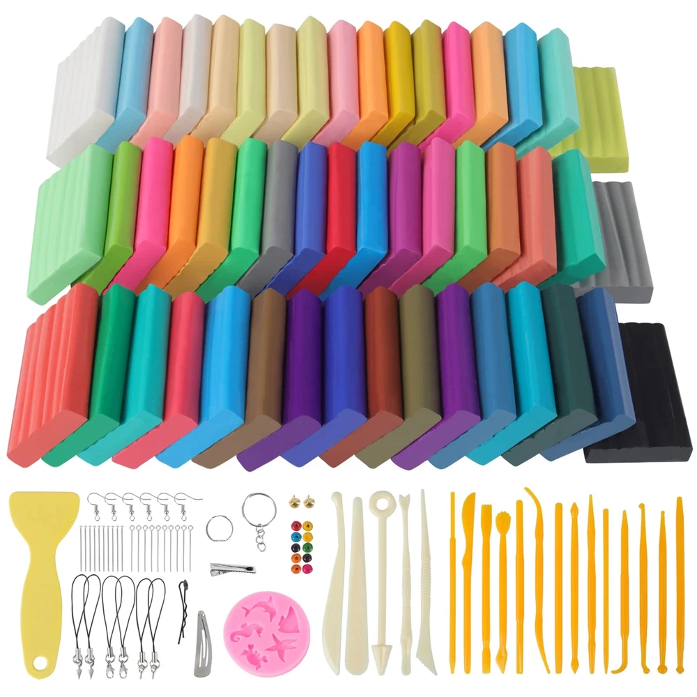 1.Good ductility, random fabrication, rich colors, satisfying matching,non-sticky, non-fading, easy modeling, non-toxic, environmentally friendly,especially suitable for artistic creation.. 2.Soft clay can help children use their brains and hands, inspire children tothink creatively, and cultivate cultural temperament. It is the favorite of theDIY people in the craft industry. Polymer Clay Kits: ▶50pieces of colored polymer carving clay ▶2-layerportable plastic storage box ▶5 Sculpting Clay Tools ▶1silicone molding mold ▶1manual ▶2bells ▶10beads ▶3pairs of earring hooks ▶1hairpin hoder ▶3ring holders ▶1key ring ▶9-needles ▶6mobile phone chain 1 Slicker SHAPINGMETHODS: 1.Ovenbaking: ▶Placepolymer clay on an oven-safe glass Tin foil or metal surface. ▶Bakeat a temperature of 248-266°F (120-130°C) for 15 -30minutes per 1⁄4 inch (6.4mm) thickness ▶Afterthe baking is completed, the work can be taken out after cooling down. 2.Heating by hair dryer or hot air gun (suitable for 1-2 inch size works): ▶Putthe work in a closed box and heat it for 3-5 minutes 3.Boiling method (suitable for 1/3 inch size works): ▶Putthe workpiece on the plate and put it in cold water until the water boils ▶Keepboiling for 10-20 minutes ▶Takeit out after cooling water Safety Guidelines: ▶CHOKING HAZARD-Small parts.soft clay is forbidden for children under 3 years old,children 3-8 years old need to be accompanied byan adult for artistic creation. ▶When using polymer clay,be careful not to wipe your eyes and washyour hands often,especiallybefore eating. ▶Polymer clay is an oily material.Please wash your hands before use and apply somehand cream to make the Sculpting clay noteasy to stick to your hands and easy to make. ▶Modeling clay will never solidifyif it is not baked,itcan be recycled for creation,and it needs to be stored in a cool place for next use. The Most Ideal Diy Gift: 50 Color Polymer Clay, With Rich Visual Sense, Creative Inspiration, Discover Children's Artistic Talent, Promote Brain Development, Stimulate Creativity, Enhance Parent-Child Communication, Halloween, Christmas Clay Set Gift Safety Material: Strictly Comply With Astm D-4236/Ce (En-71) Standards And Requirements, Polymer Clay Is Made Of Polymer, And Has Good Toughness And Does Not Stick To Hands. Accompanies Your Child Safely Product Packaging: 50 Rich Colors Of Modeling Clay For Kids, Each 0.7 Ounce Piece Of Clay Is Packed In a Pe Bag, 5 Sculpting Clay Tools, Silicone Model, Accessories And User Manuals, 2 Layers Of Plastic Storage Boxes, With Clay Sculpting Tools ,Clay Kits,Molding Clay For Kids Total Weight 2.87 Pounds Modeling Clay Mode: Oven Bake Clay-Set The Temperature To 130°C (266°F) And Bake For 10-30 Minutes-Recommended, Hair Dryer Heating (Suitable For Small Workpieces Of 1-2 Inches), Boiling Method, Don’t Microwave,Instructions For Safe Use: Children Aged 1 To 3 Are Prohibited From Using It, And Children Aged 3 To 6 Are Recommended To Use It Under The Supervision Of An Adult CyAJM Polymer Clay Set: If the product does not work, you can contact our friendly customer service