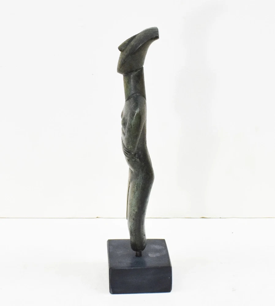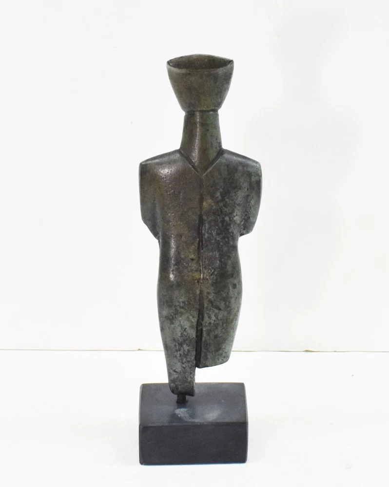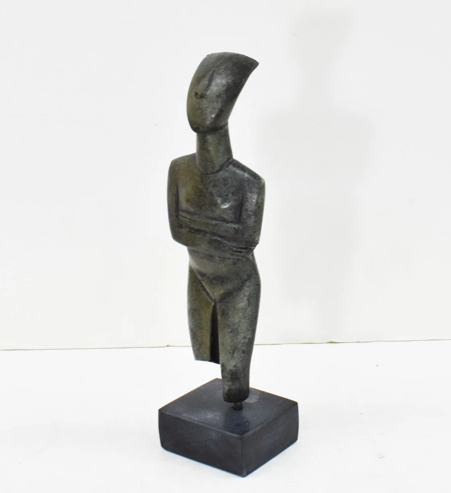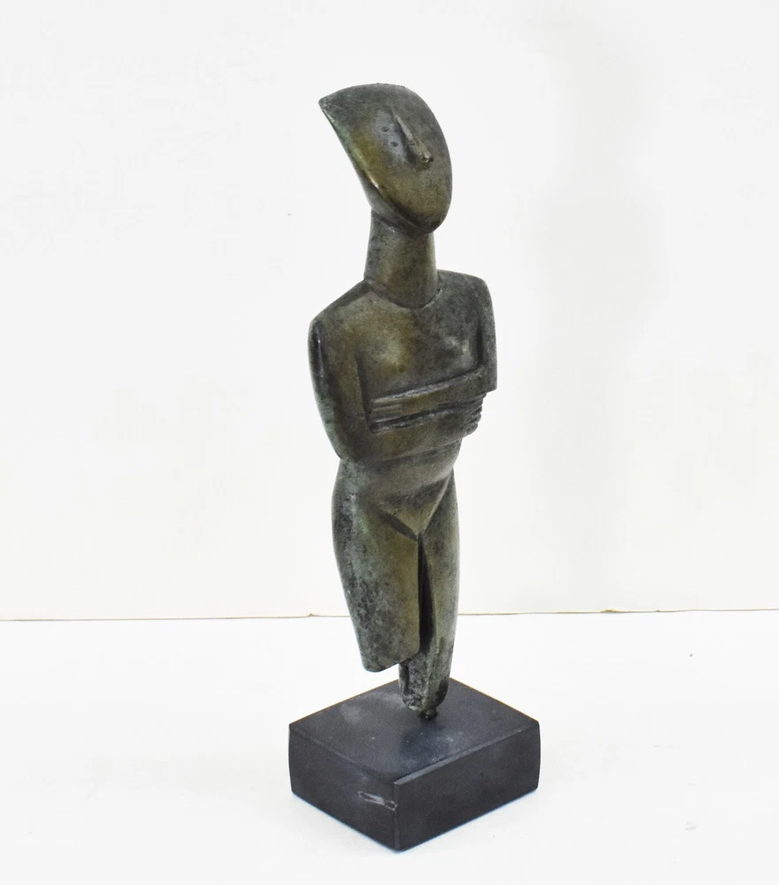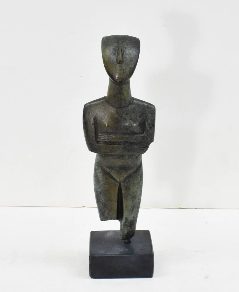 CYCLADIC ART BRONZE IDOL Cycladic art encompasses the visual art of the ancient Cycladic civilization, which flourished in the islands of the Aegean Sea from 3300 - 2000 BCE. Along with the Minoans and Mycenaeans, the Cycladic people are counted among the three major Aegean cultures. Cycladic art with its anthropocentric character - expressed through perfection and proportion in form, simplicity, and reduction to the very essential. It is an art that has strongly influenced early 20th century sculpture. All our bronze items, are cast in Greece, using the traditional 'lost wax' method. As nothing is mass-produced, there will inevitably be slight variations in patination and colouring. Each piece is, therefore, unique.(37-508-A) Details: Condition: New, Handmade in Greece Material: Pure Bronze Height: 19 cm(7.5 inches) Width : 6 cm(2.4 inches) Weight : 700 g