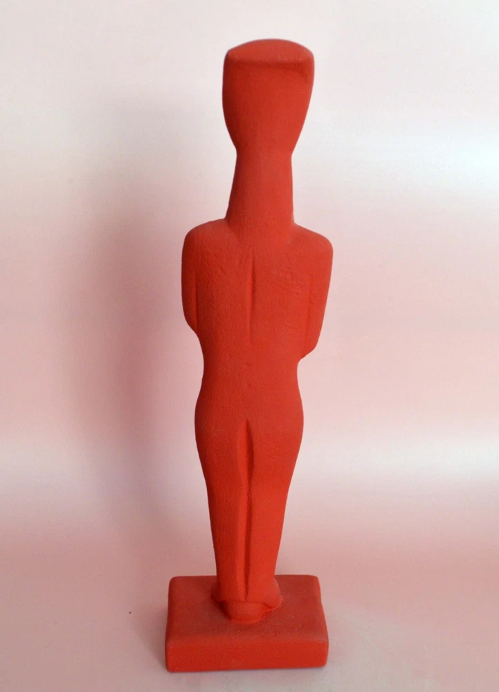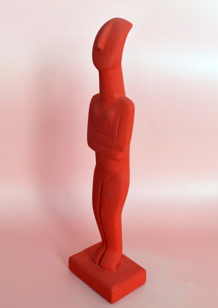 CYCLADIC ART IDOL Cycladic art encompasses the visual art of the ancient Cycladic civilization, which flourished in the islands of the Aegean Sea from 3300 - 2000 BCE. Along with the Minoans and Mycenaeans, the Cycladic people are counted among the three major Aegean cultures. Cycladic art with its anthropocentric character - expressed through perfection and proportion in form, simplicity, and reduction to the very essential. It is an art that has strongly influenced early 20th century sculpture. Please be aware that, due to the fact that our products are either individually cast, carved, hand painted and hand finished, there will inevitably be minor variations in size, colour and texture.(B103-R) Details: Condition: New, Handmade in Greece Material: Casting stone Height: 27 cm(11 inches) Width : 7 cm(2.7 inches) Weight : 350 g
