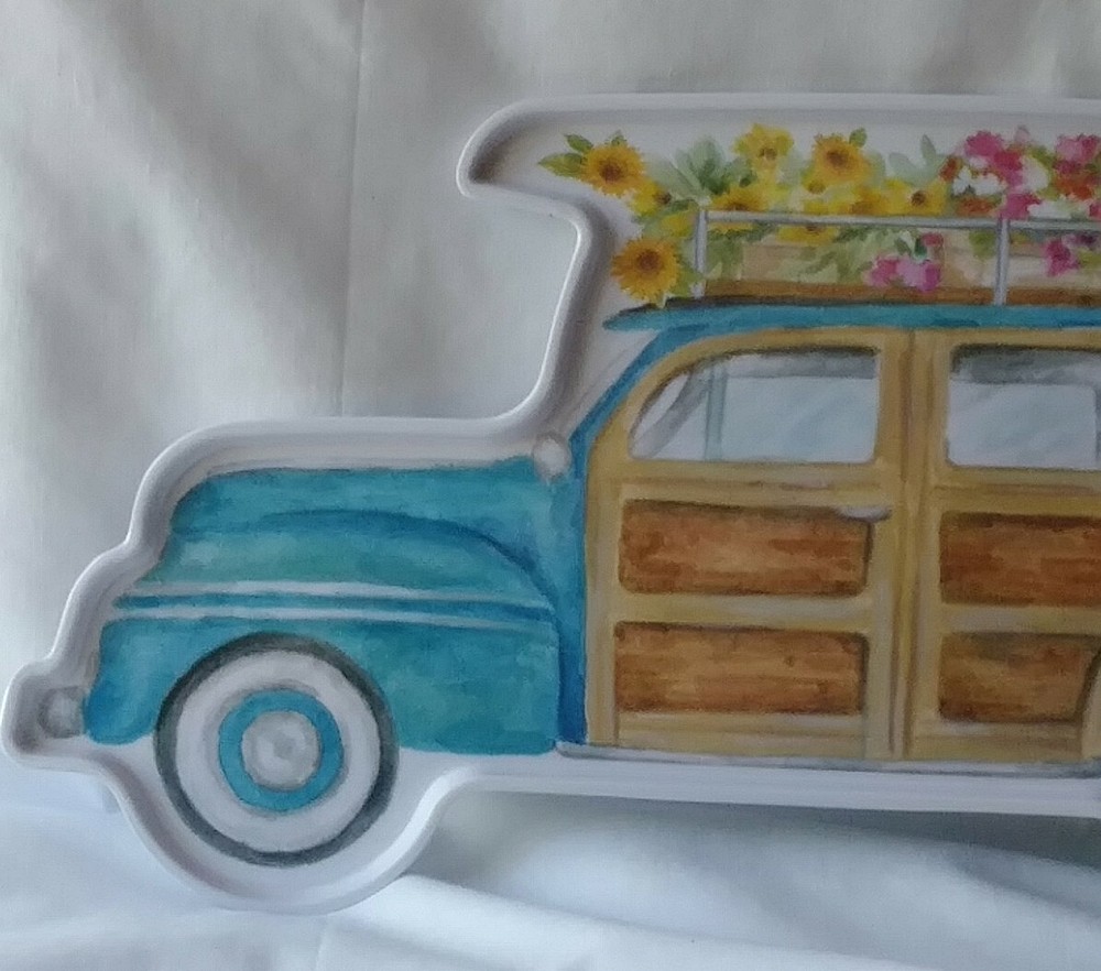 Party Platter Woody Wagon Dog Flowers Cynthia Coulter Melamine Tray Melamine plastic Tray is Medium thickness Approx 19.5" Long 9.25" Wide x 3/4" Tall Dishwasher safe top rack NO microwave. New - never used Please view all photos zooming in on them as they are part of the description for you to judge condition. Will ship either USPS Priority, Fedex or UPS depending on the location of where buyer lives IMPORTANT - if whips via UPS or Fedex they require a home delivery address as they cannot deliver to post office boxes - NO Post Office Boxes