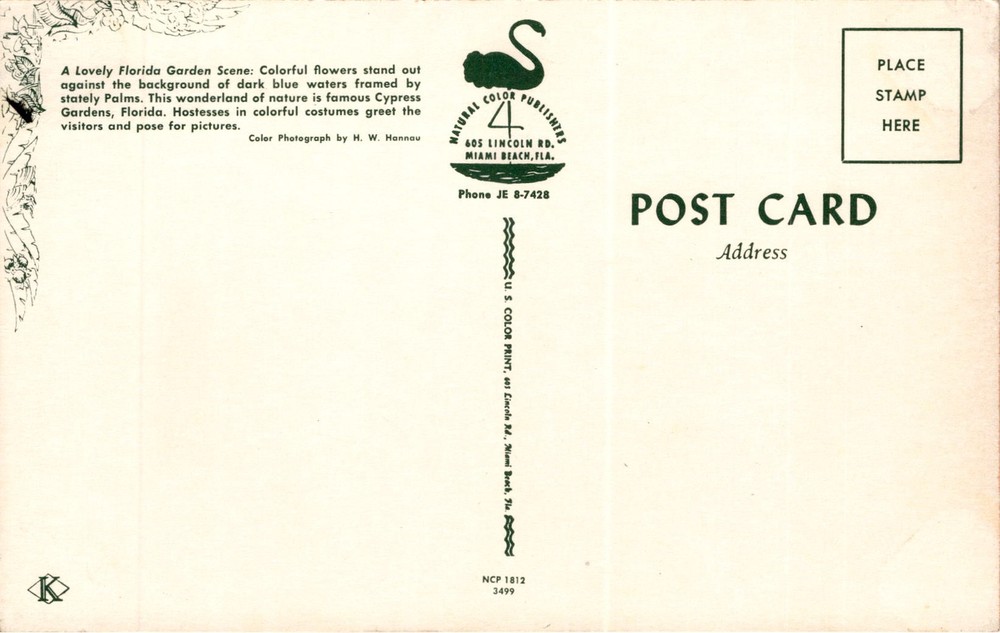 The postcard depicts a beautiful garden scene in Florida, specifically Cypress Gardens. The image shows colorful flowers contrasting against dark blue waters, with stately palms framing the view. Hostesses in vibrant costumes welcome visitors and are available for photographs.Cypress Gardens was a famous botanical garden and theme park located in Winter Haven, Florida.