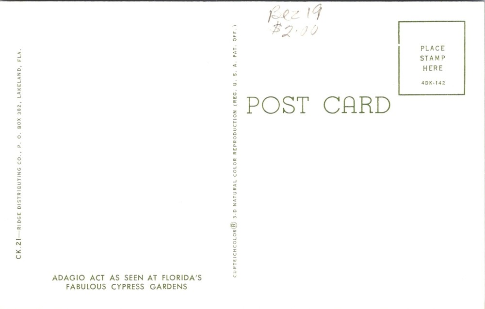 Subject:Water SkiingMaterial:PaperOriginal/Licensed Reprint:OriginalCountry:United StatesEra:Photochrome (1939-Now)Unit of Sale:Single UnitPostage Condition:UnpostedType:Printed (Lithograph)Number of Items in Set:1City:Cypress GardensCountry of Origin:United StatesModified Item:NoVintage:YesContinent:North AmericaTheme:Cities & Towns, Community Life, Domestic & Family Life, People, Sports, Tourism, Transportation, Travel, Water SkiingRegion:Florida