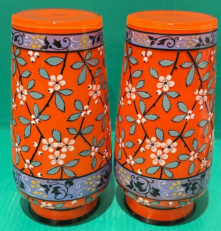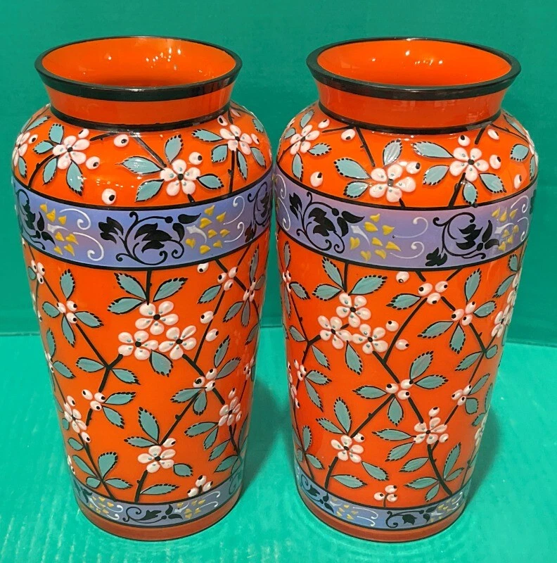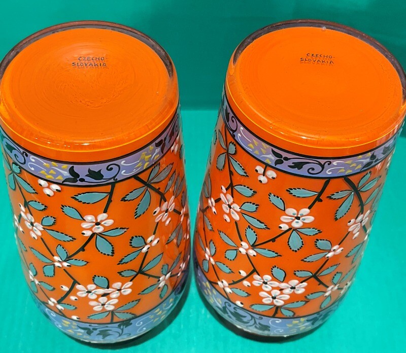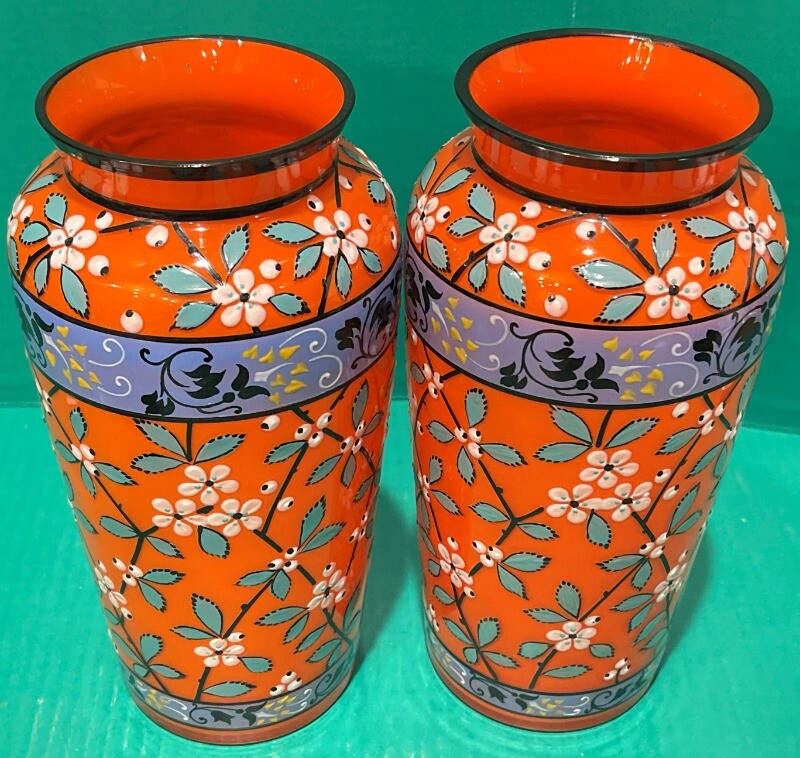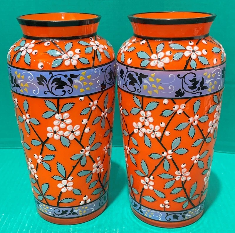 Czechoslovakia Czech Heavy Enamel Floral Design PAIR of Vases Bohemiam Czechoslovakia Czech Heavy Enamel Floral Design PAIR of Vases Bohemian Click images to enlarge Description Description Item Description Brand/Artist Czechoslovakia Item Pair of Vases Pattern/Design Floral Enamel Description Vintage Czech Pair of Vases Orange and Black Bohemian Art Glass with Multi Color Floral Heavy Enamel Design Each is marked Czechoslovakia Combined shipping is available. Message me if you wish to purchase more than 1 item Shipping rates are determined by the size of the package. Origin Age Actual Age Unknown Measurements 9" Tall 3 1/2" Across Weighs 1.5 and 1.1 lbs (Each) (Prior to Packaging) Pictures Please scroll down thru all of the pictures. They are part of the description Condition Excellent Condition. No chips or cracks. Minimal, if any, indication of wear. POLICIES Payment Info Due within 3 Days Shipping Info Packages are normally shipped no later than 48 hours after purchase (excluding weekends). Packages are normally shipped via USPS or FEDEX Ground with Tracking, Delivery Confirmation and Insurance. Insurance costs are added as a handling charge. Combined Shipping Usually available. Please wait for invoice for correct shipping costs. Insurance All of my items are shipping with insurance. If an item has arrived with damage, buyer must report immediately after delivery. I will file a claim with the insurance company. Buyer will be required to send paperwork and pictures to the insurance company as directed. International Sales It is illegal to place a lower value on your purchases or mark your item as a gift. I will not do this so do not ask. Buyers are responsible for customs/ duty tax in your country. Please make sure the item you are purchasing can be legally shipped to your country. Perfumes cannot be shipped by air, so no international sales on perfumes. Most international sales must be shipped using express mail for tracking purposes. If insurance cannot be purchased for your country, then transaction will be cancelled. Vintage Perfumes Vintage perfumes can lose their freshness. The older the perfume, the less likely it will smell like its original scent, nor will it last as long after applying Vintage Clothing Vintage clothing are a one of a kind item and may show signs of usage, storage, aging,etc. Major flaws/issues will be noted. Be sure to check all measurements, as sizing can be different for older items and brands. Shoe size fits can vary with different brands and styles Pictures Colors can be difficult to photograph and describe as there are so many variations of each standard color. Please ask if you have any questions regarding the color. Photos are of the individual item being sold, unless they are part of a set such as dishes and glasses or if I have more than one item in the same pattern. Signatures may vary on items. Returns Sales are Final. Returns will be accepted if an item has been inadvertently misrepresented. Buyer must notify me within 24 hours of receipt. Returns must be returned in same condition as received and by the same method as when originally shipped, including any security tags or marks. Condition My opinion of condition may differ from yours, so please ask any questions prior to purchase Please view all of the images as they are part of the description Questions Please ask all pertinent questions in advance of purchase so as to avoid any misunderstandings. Please read item description completely and refer to the pictures as they are part of the description and condition. Most items that I sell are used or vintage and therefore will show age appropriate signs of wear. If an item is new, it will be so stated Customer Service Customer Service and Satisfied Buyers are important. Please contact me with any problems. Positive feedback & 5 Star Detailed Seller Ratings will be appreciated and after which I will reciprocate. Condition: Used Condition Notes: Excellent Condition. No chips or cracks. Minimal, if any, indication of wear Payment Paypal Shipping Domestic shipping: Weight based Shipping Charges. Domestic Carriers are: Usps Priority, FedEx Ground International shipping: Weight based Shipping Charges. International Carriers are: Usps Express Intl I will ship to: United States, Worldwide Weight: 8 lbs. Shipping and Handling: Please check eBay's Shipping & Payment tab Vendio Images: More than just a pretty image. 250+ Mobile Responsive & Active Content Free Listing Templates with Vendio Sales Manager. Vendio provides powerful selling automation for sellers of all sizes. Get business information that counts! - Vendio Counters are active content free.