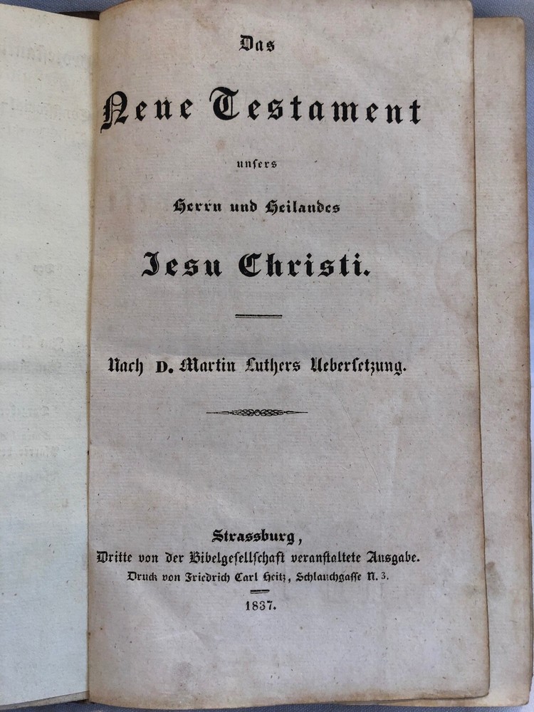 Das Neue Testament - D Martin Luther - 1837 Strassburg - Printed by Friedrish Carl Heitz 327 Pages - Height: 21.5cm - Width: 13.5cm - Depth: 2.5cm - Imprinted on front Cover outside - Society Biblique Protestanter: Paris