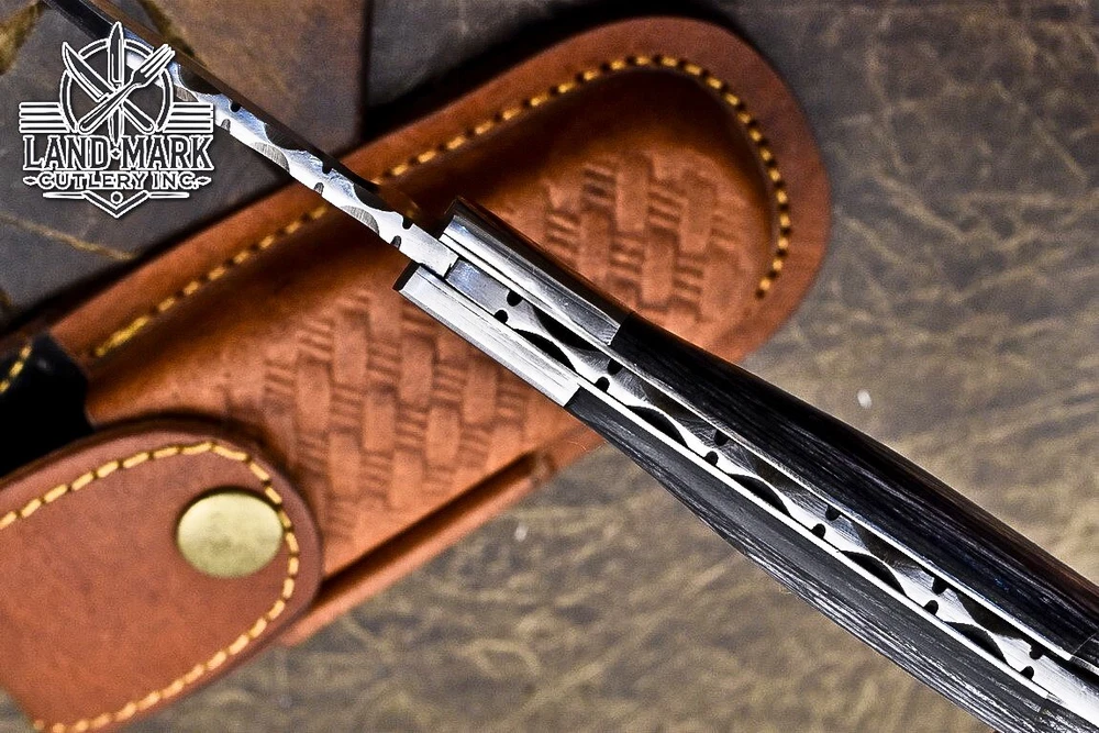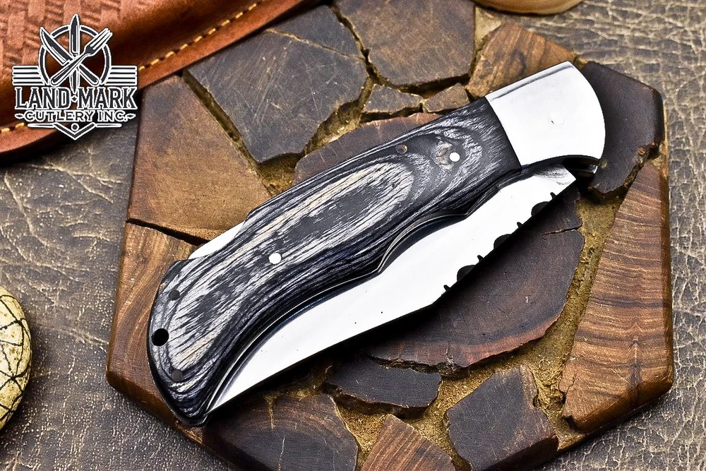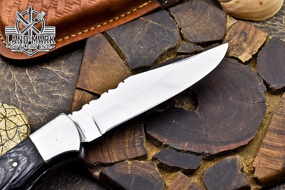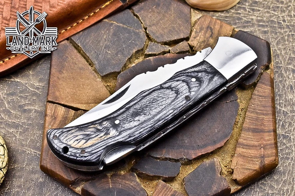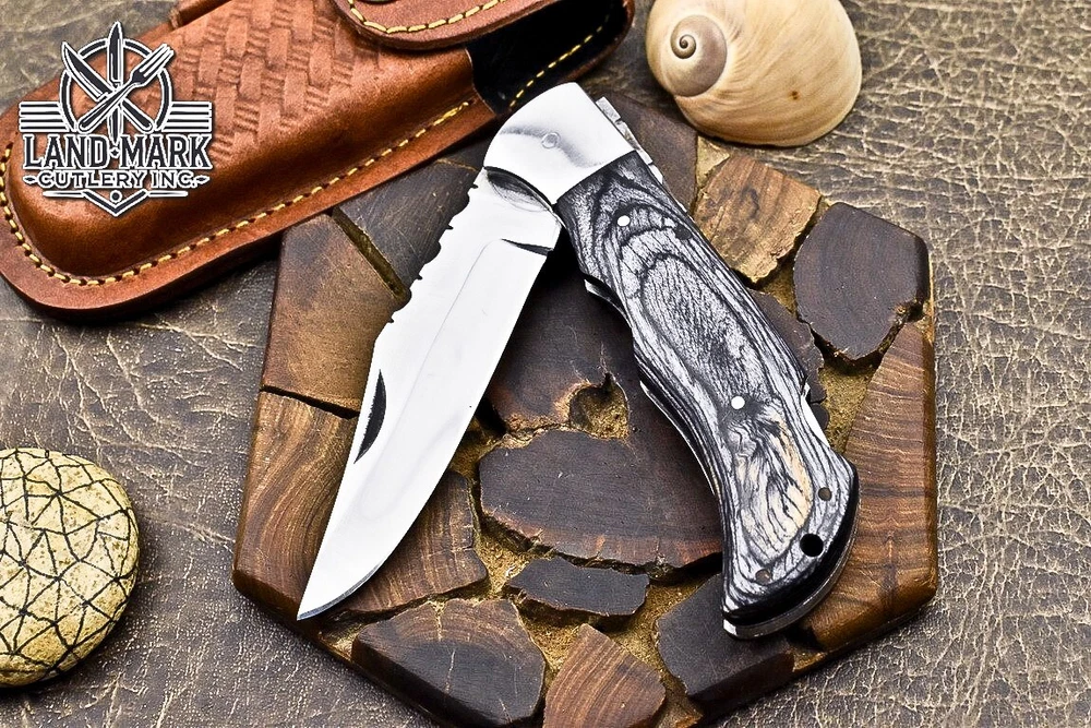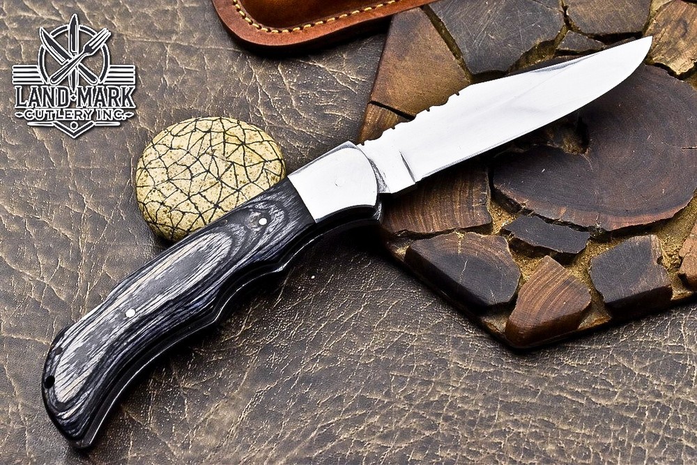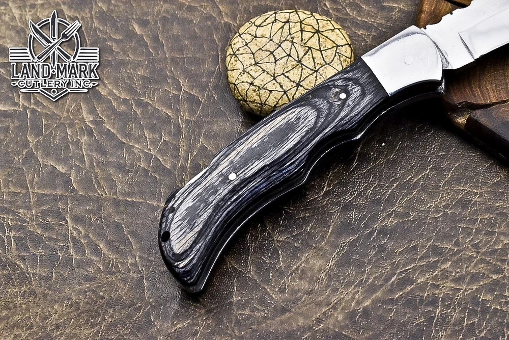 Custom Hand Made D2 STEEL HUNTING BACK LOCK FOLDING KNIFE WITH PAKKA WOOD HANDLE We offer a shipping discount for More then one purchased . And discount will be apply on combine invoice, Discount will not apply on separate payment. ITEM DETAILS OVER ALL LENGTH 7 - 8 inches long (Approx) HANDLE LENGTH 3.8 - 4 inches long (Approx) BLADE LENGTH 3.1 - 3.3 inches long (Approx) BLADE HARDNESS 58-60 HRC Which Holds The Sharp Edge For Long Time. HANDLE PAKKA WOOD COVER LEATHER SHEATH This Awesome custom made KNIFE has a nice hand forged with the combination of 4340 & 1080 steel. HOW OUR DAMASCUS IS MADE: All our Damascus is real and not just an acid etch. Damascus is a mixture of 1080HC and 4340 nickel carbon. You heat them up together and then fold the bar over and over to get the desired layers, ours are 396 layers. Then you burn the blade in acid, and it turns the nickel satin color and the high carbon turns blackish gray. This is how the layers are exposed to show the layers of the new steel created coined "Damascus". All Damascus is acid etched to show the layers. If you high polish the metal it will be shinny satin like all steels. Only after you burn the sides of the blade with acid do you see the layers of the two steels. Makes sense? After we make our knives we high polish the handles and put an edge on the blade. The high polishing buffs off the acid burned layer of the handle, and the blade edge is sharpened and the acid burned edge becomes satin. You can re-burn the tang of the blade near the handles and the edge of the blade and it will show the layers once more. All our knives are hand made, durable and unique ***** YOU WILL RECEIVED THE SAME KNIFE Qality Standards Our Damascus blades are made from high quality non-stainless steels which rival or exceed any Damascus blade made from the 10 series with 4340. Our Damascus combination has taken years to perfect and has been tested under a variety of application which will offer professional performance in categories of toughness, strength (lateral stress) and edge honing and holding ability. In a 5 spot Rockwell test our blades will average near or close to 58 which offers a perfect balances between its toughness and strength.Our blades due to carbon content need to be regularly treated with wax and/or 3 in 1 oil to maintain its superior quality. Questions if you have any question feel free to send us message we aim to answer all questions within 24 hours Feedback If you are not satisfied with our service please contact us before leaving any negative or natural feedback. We will resolve all issues as quickly as possible. Disclaimer We are not responsible for any injuries associated with the use of our tools. Our products are intended for legal use only by responsible buyers. Therefore, we will not sell our products to anyone under the age of 18. Before bidding please check your country laws as some countries Custom don't allow this. If your purchase is held by Custom Authorities in your country/State we will not be responsible for that and no refund will be issued Shipping We offer a 20% shipping discount for More then one purchased . And discount will be apply on combine invoice, Discount will not apply on separate payment We ship within 24 hours after receiving complete payment but this can be delayed due to week ends or Governments and Religious Festivals . . This is beyond our control and we apologize for this inconvenience. Precautions Our Tools are very sharp so open and use them very carefully We are not responsible for any injuries associated with the use of our tools Tips to Care knife 1. NEVER STORE YOUR KNIFE FOR LONG TIME IN LEATHER SHEATH. 2. LEATHER CAN ABSORB WATER, WHICH WILL RUST THE KNIFE. 3. ALWAYS CLEAN THE BLADE AFTER USING WITH OIL OR WAX