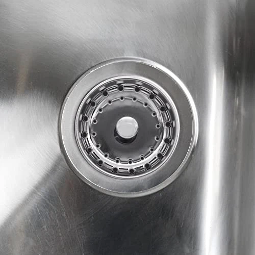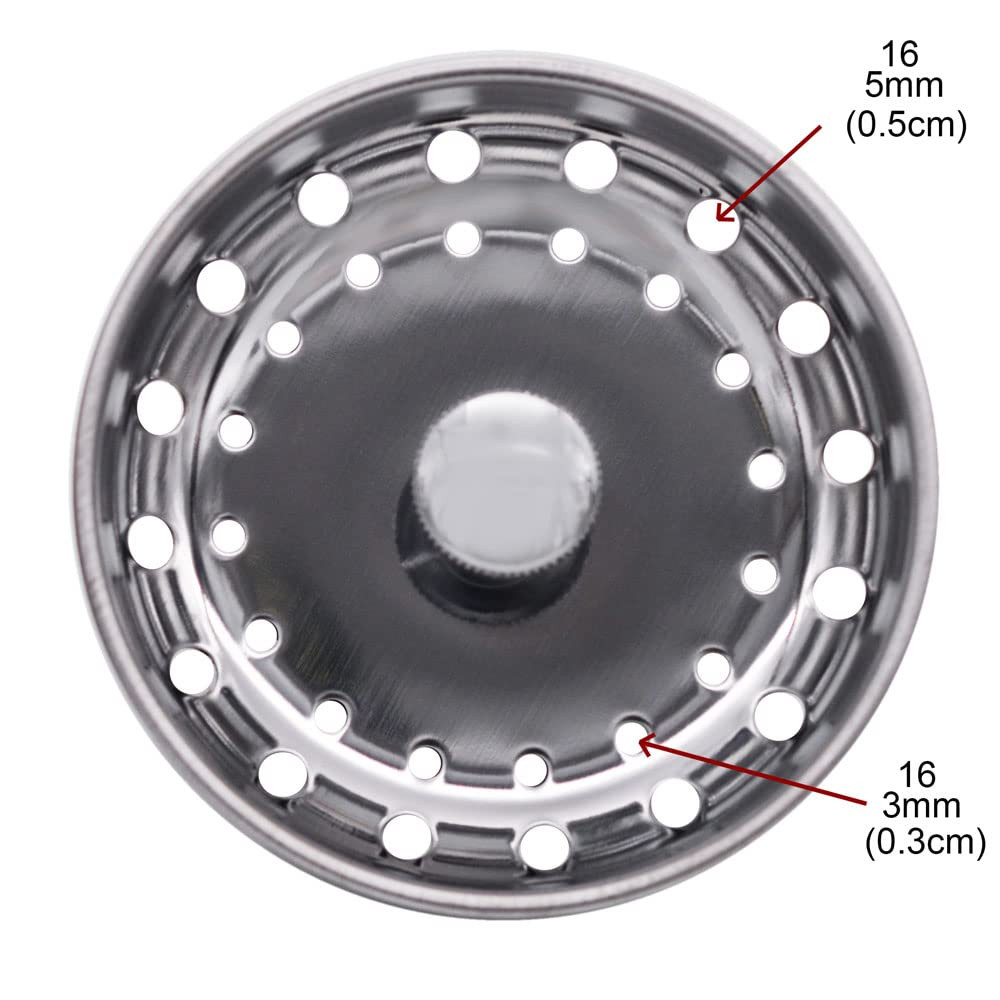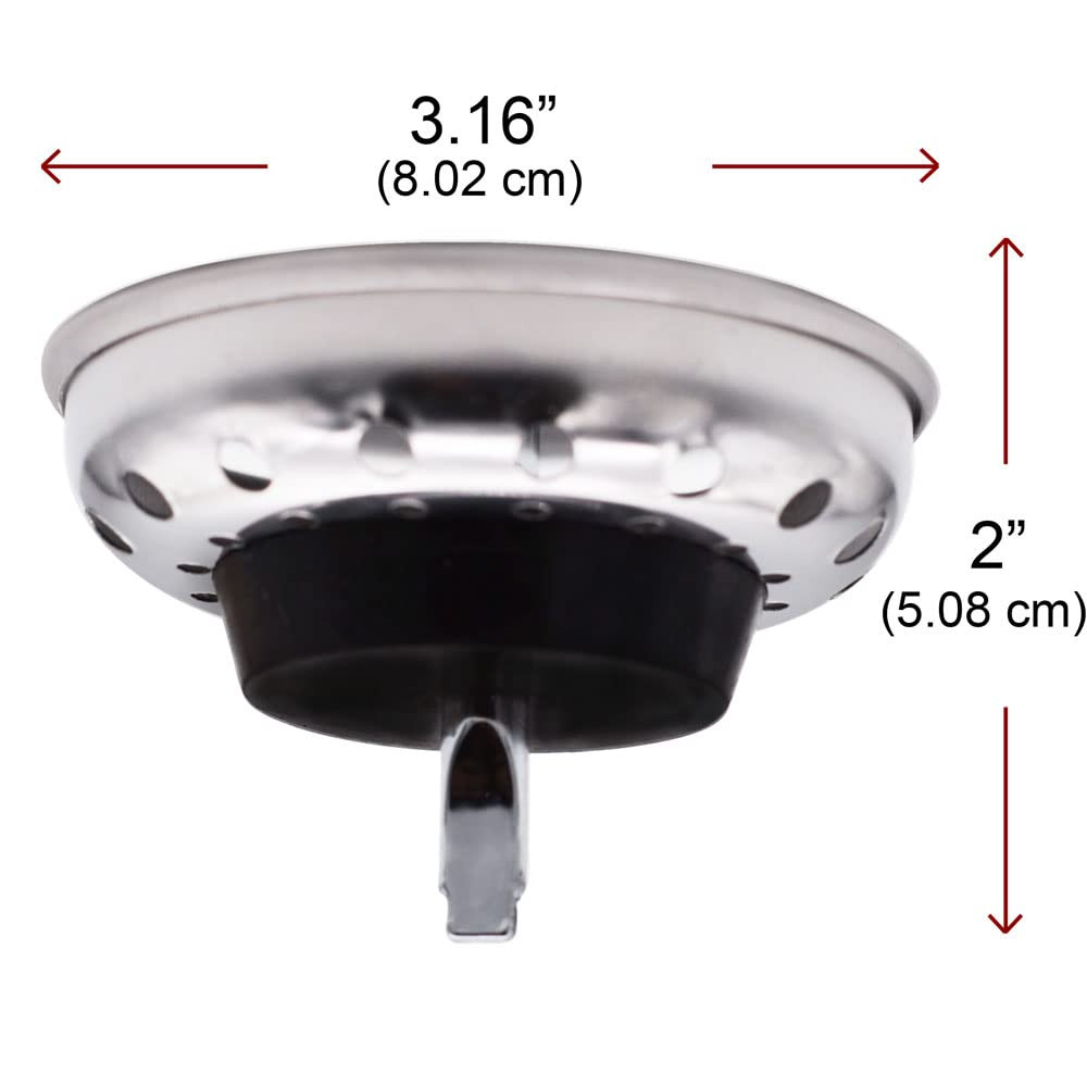 This pack of large center post style kitchen sink basket strainer will protect your drain from clogging by preventing unwanted debris from entering the drain. Universal in size fitting 3-1/2 - 4 in. standard kitchen drains or older sinks. Enjoy both convenience and style as you simply turn the center post to open or close the basket to slow the drain of water. Available in a variety of stylish finishes, this item is sure to complement your existing fixtures. Be sure to check out our other model styles and VISIT OUR STOREFRONT for more Kitchen and Bath items to stylize your home with convenient functionality and beauty. Universal kitchen sink basket strainer/stopper in . Fits 3-1/2 - 4 in. standard kitchen drains or older sinks The basket strainer is designed to protect your drain from clogging by preventing unwanted debris from entering the drain. 32 holes in the basket for easy drainage. 16 larger holes of 5mm diameter and 16 smaller holes of 3mm diameter The sink strainer basket can be used as a strainer and drain plug. Turn post and push to restrict or stop the flow of water Dimensions: 3-1/16 in. diameter, Overall height 2 in. Constructed of stainless steel for durability and the stopper is made of silicone. Dishwasher safe