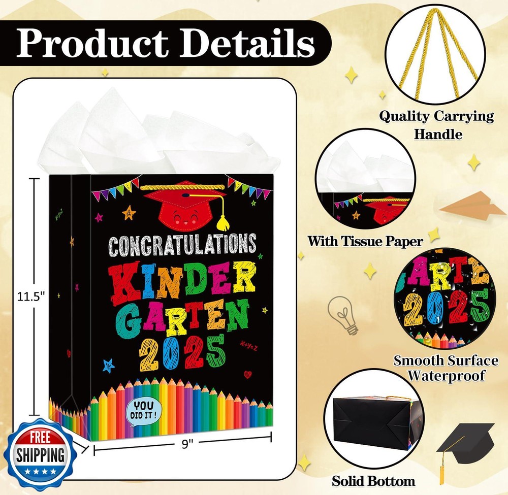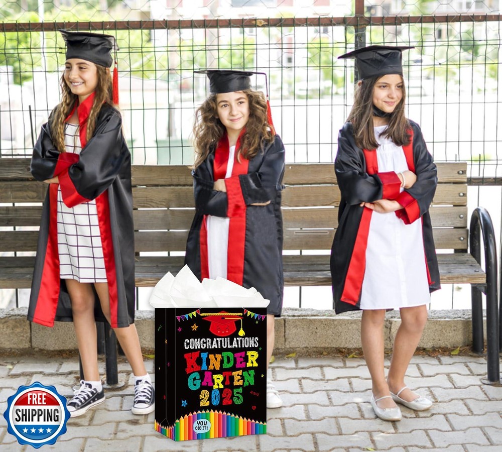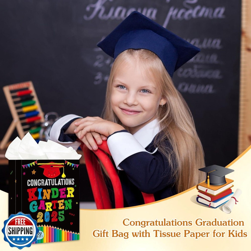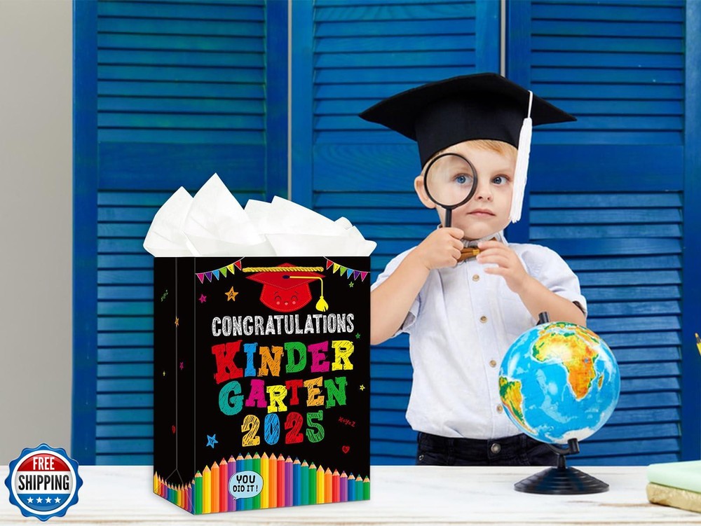 D4DREAM Kindergarten Graduation Gift Bags -11.5'' 2025 Congratulations Preschool Kindergarten Graduation Gift Wrap Bag with Tissue Paper and Handle for Kids Student Boys Girls PreK Grads Party Favors Features Congratulations Grads Gift Bags - Celebrate your little graduate with our colorful kindergarten gift bag! Featuring cute graduation-themed designs like caps, stars, and pencils, this gift bag adds extra joy to the occasion. The print "Congratulations, Kindergarten, 2025, You Did It!" commemorates their achievement. 2025 Kindergarten Graduation Gift Bags - Each package includes a graduation gift bag (11.5 x 9 x 5 inches) and a sheet of white tissue paper, perfect for presenting gifts to kids. The bag features a convenient handle for easy carrying and ample space for your heartfelt presents. Material - The graduation gift paper bag is made from high-quality cardstock, guaranteeing durability and long-lasting use. The vivid printing on the paper bag is fade-resistant, ensuring it can be kept and utilized for an extended time. Perfect Graduation Gift Bags for Kids - Ideal for kindergarteners, preschoolers, or elementary school graduates, this cute graduation gift bag is an essential addition to your child's graduation festivities. Capture cherished memories of this significant milestone with this colorful graduation bag! Graduation Gift Wrap Bags - This 2025 graduation gift bag is versatile and ideal for wrapping a wide range of items such as presents, flowers, candy, chocolates, cookies, candles, standard-sized books, apparel, graduation caps, diplomas, and beyond. It's an excellent choice for kids' graduation gifts! Shipping Free & Fast Shipping: We offer free shipping to most of the USA with a normal delivery time of 3-7 days. However, due to the current situation, additional delivery time (up to 3 weeks) may be required for some items. Alternative Carriers: We may use alternative carriers (e.g., USPS, FedEx, UPS) to ensure your package arrives safely and on time. Due to the use of multiple carriers, we are unable to provide a tracking number automatically. Handling Time: Orders are processed and shipped within 1-2 business days of receiving cleared payment. Shipping Restrictions: Shipping to Alaska, Hawaii, Puerto Rico, Guam, and other US territories may incur shipping charges or delivery restrictions. Please contact us before ordering, or your order can be refunded/cancelled. State Restrictions: Certain items may not be shipped to California due to state regulations. Contact for Tracking Updates: If you require tracking updates or have any concerns about the delivery of your order, please feel free to contact us, and we will be happy to assist you. Return Policy 30-Day Hassle-Free Returns: If you are not completely satisfied with your purchase, you can return the item for free within 30 days of receiving it for a full refund or exchange. Easy Return Process: Contact us, and we will provide you with a prepaid return shipping label and detailed instructions. No Restocking Fee: There are no restocking fees for returns. However, the buyer is responsible for return shipping costs if the return is not due to a seller"s error. Refund Processing: Refunds will be processed within 1 business day of receiving the returned item in its original condition. Feedback Your feedback is extremely important to us. We strive to provide the best products and customer service possible. If you are satisfied with your purchase, please take a moment to leave us a positive review. If you have any concerns or issues with your order, please contact us before leaving negative feedback. We are committed to resolving any problems and ensuring your satisfaction. Contact Us If you have any questions or concerns, please feel free to reach out to our customer support team. You can contact us through the eBay messaging system. We are available Monday to Friday, 9:00 am to 5:00 pm EST, and we will do our best to respond to your inquiry within 24 hours. Thank you for supporting our small family business!