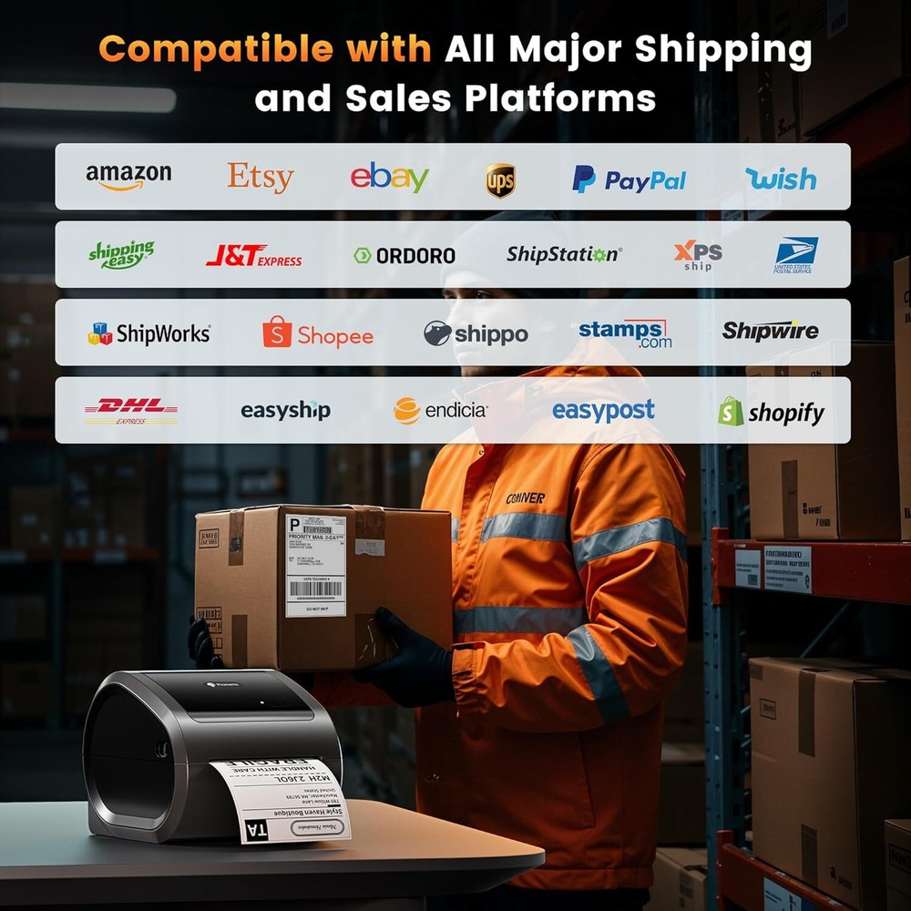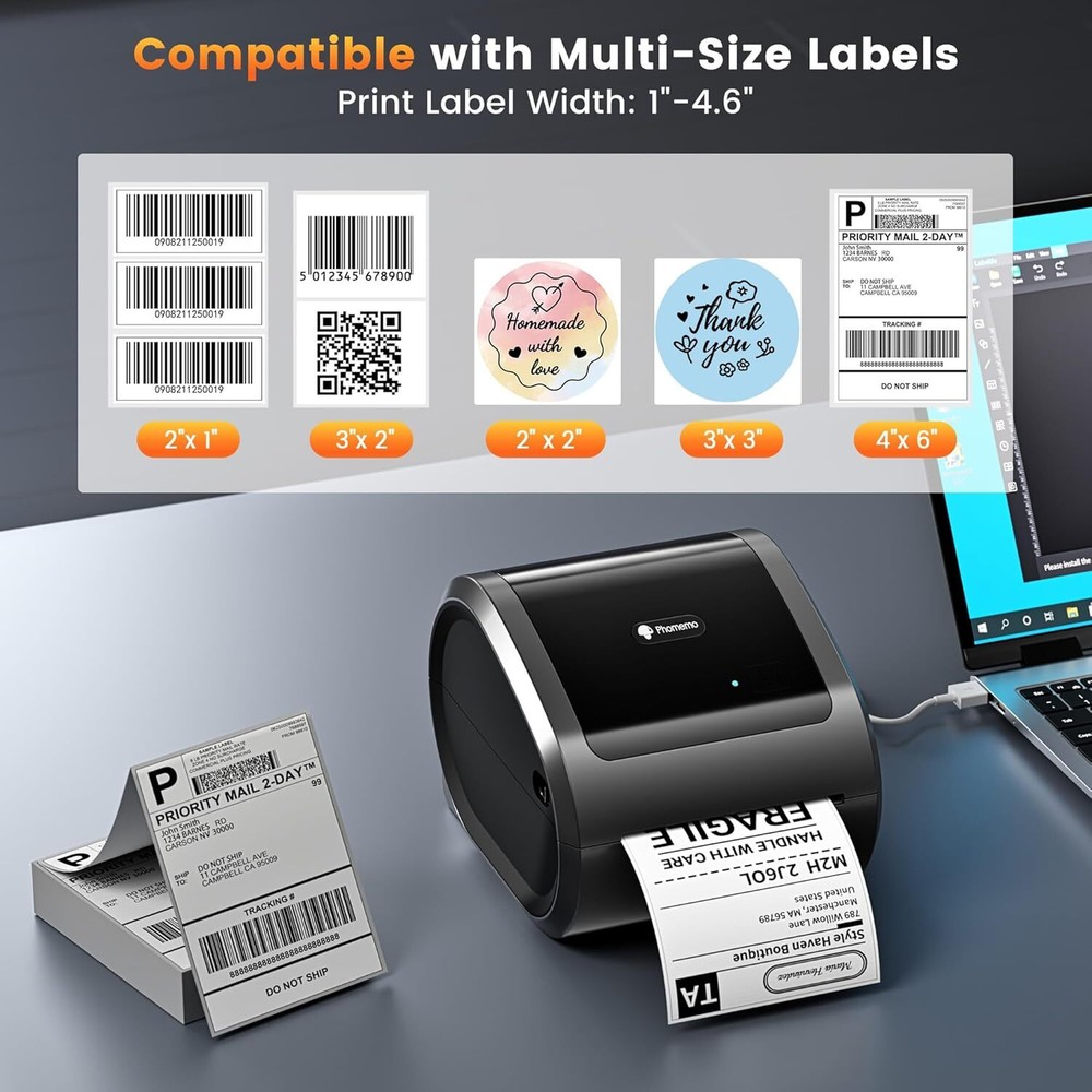 About this item Space-Saving Internal Paper Holder: This thermal printer features a built-in paper holder, eliminating the need for an external label rack. This design helps save desktop space and keeps your workspace organized. Suitable for small businesses and home offices, this label printer reduces clutter and fits seamlessly into any environment. Wide Printing Range and High Speed: This versatile thermal printer supports a printing width of 1-4.6 inches, making it ideal for various printing tasks, from small labels to wider receipts. With a printing speed of up to 72 PCS/min, it efficiently handles high-volume printing needs, enhancing workflow efficiency for your small business. Dual Connectivity Options: This label printer offers both USB and Bluetooth connectivity, providing compatibility with a variety of devices. Easily pair with Android and iOS devices via Bluetooth using the compatible app. Additionally, it supports USB connections to Windows, Mac, Chrome OS, and Linux systems, meeting diverse user requirements for a desktop thermal label printer. Ink-Free Thermal Printing Technology: Equipped with ink-free thermal printing technology, this thermal printer reduces ink costs and provides efficient, high-quality prints. With a printing speed of 150mm/s and high-resolution output, each label is printed with sharp and precise detail. This eco-friendly technology reduces wait times and improves the overall printing experience, making it perfect for a shipping label printer. Comprehensive App Support and Easy Setup: The postage label printer comes with app support, offering a range of free templates for customizing labels and print content. It supports the creation of various types of labels, including shipping labels, address labels, barcode labels, and thank-you stickers. The printer includes detailed video tutorials and user manuals to help you set it up quickly. Product dimensions: 10.31 x 10.31 x 7.87 inches