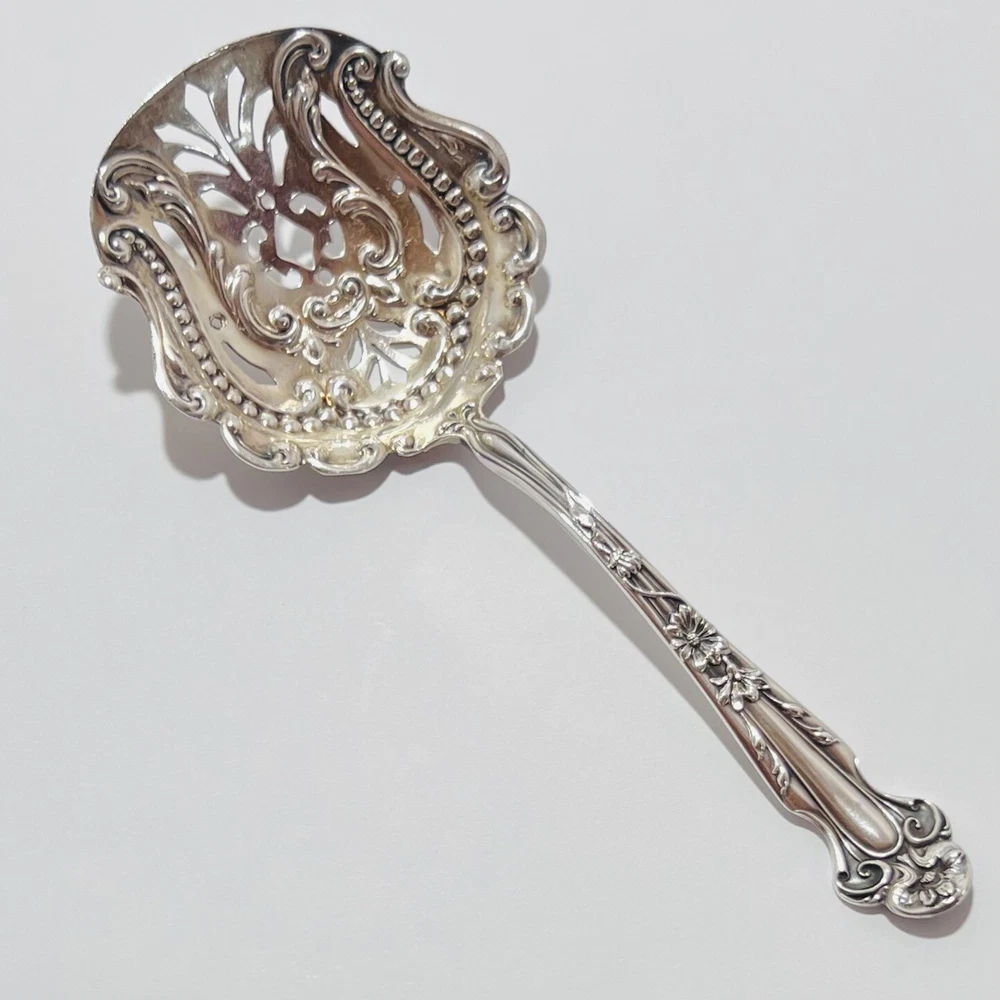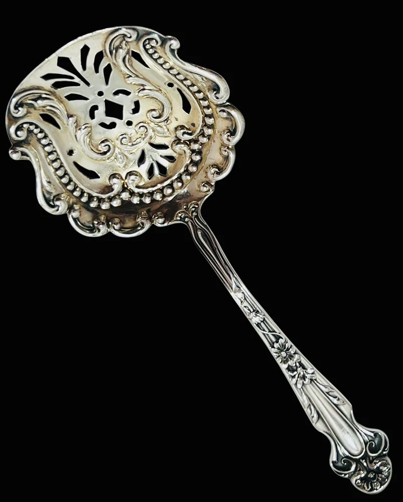 Up for bid is a Lovely DAISY Almond Nut/Scoop Spoon Sterling Silver by R. BLACKINTON & Co. Circa 1904 Length: 5" A beautiful rare serving piece decorated with a gold washed pierced bowl perfect for your next party or holiday gathering! The Daisy pattern by R. Blackinton & Co.was designed by Thomas C. Heath and Charles H. Such in 1904. The art nouveau style of this silverware has daisy flowers that run from the top of the pattern down the center with stems underneath those petals. Please review the photo gallery as it accurately depict the condition of the item you will receive. Thanks for stopping by “JG Coins & Collectibles”!