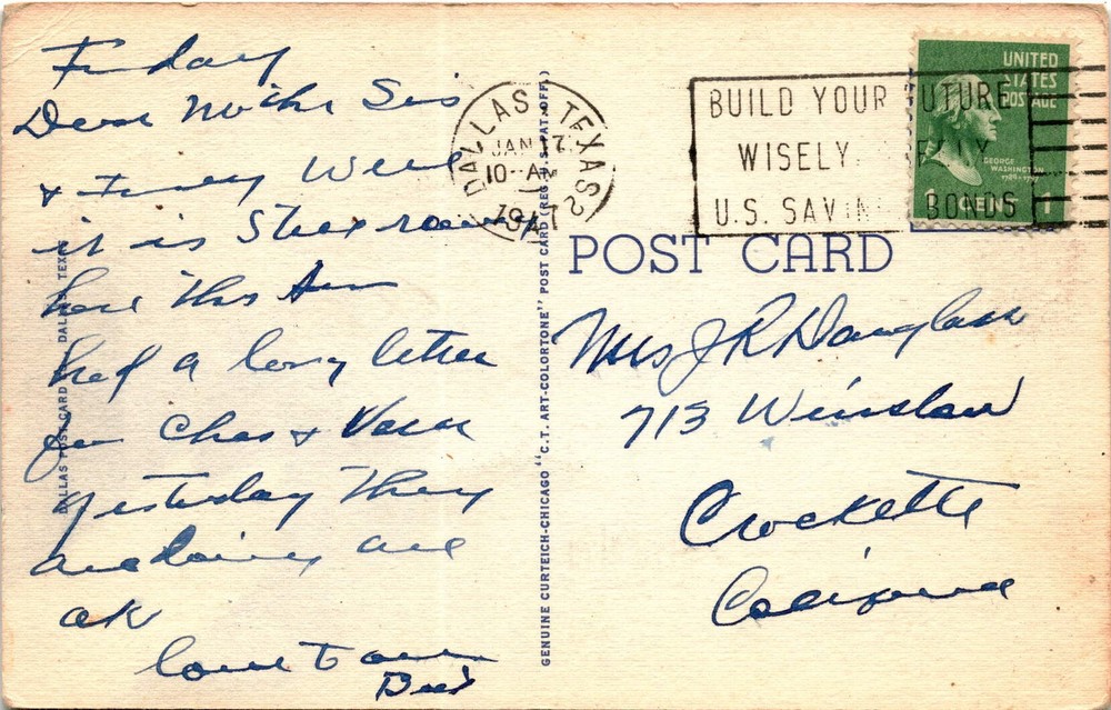 MAKE AN OFFER. THE MORE YOU BUY THE BETTER DEAL I WILL ACCEPT The postcard features an image of the Dallas Country Club in Dallas, Texas. The text on the postcard mentions a Huge Bart and includes a reference to George Washington's presidency from 1789-1797. It also encourages the recipient to BUILD YOUR FUTUREOS WISELY and mentions U.S. Savings Bonds.
