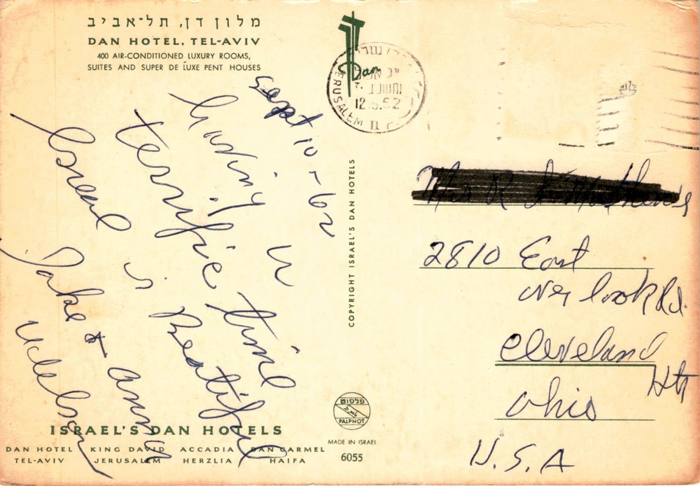 The postcard features the Dan Hotel in Tel Aviv, a luxurious hotel with 400 air-conditioned rooms, suites, and super de luxe penthouses. The postcard also mentions other locations such as Haifa, Herzlia, and Salem in Israel.