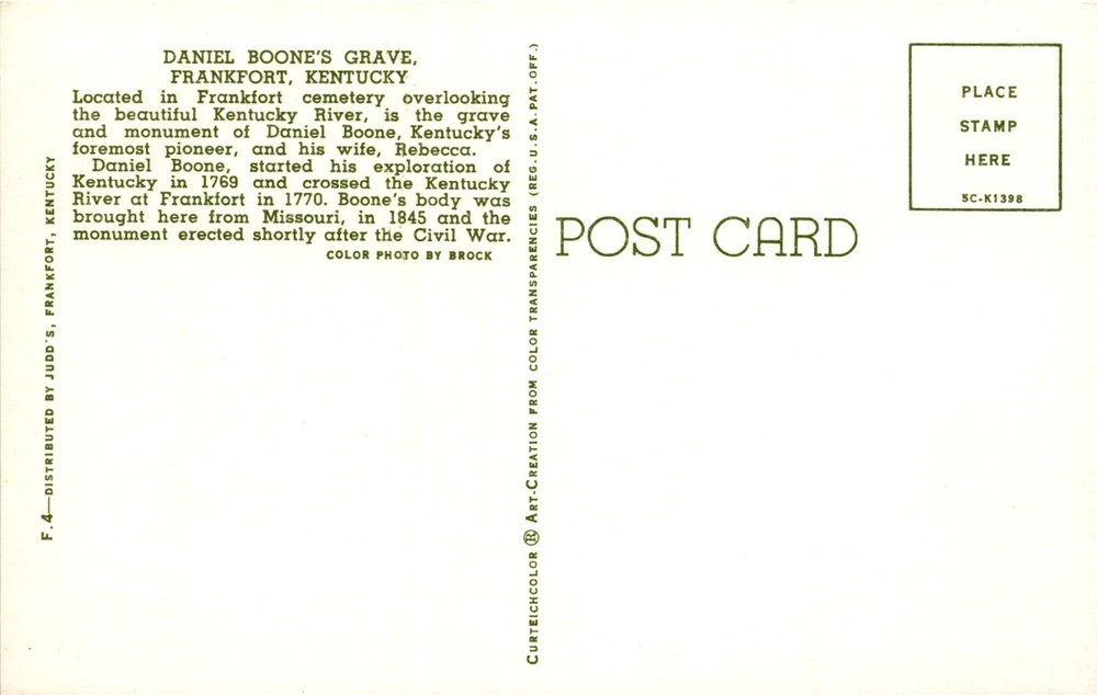 MAKE AN OFFER. THE MORE YOU BUY THE BETTER DEAL I WILL ACCEPT The postcard features a color photo of Daniel Boone's grave and monument in Frankfort, Kentucky. Daniel Boone, a prominent pioneer, is buried alongside his wife, Rebecca, in Frankfort cemetery overlooking the Kentucky River. Boone began exploring Kentucky in 1769 and crossed the Kentucky River at Frankfort in 1770.
