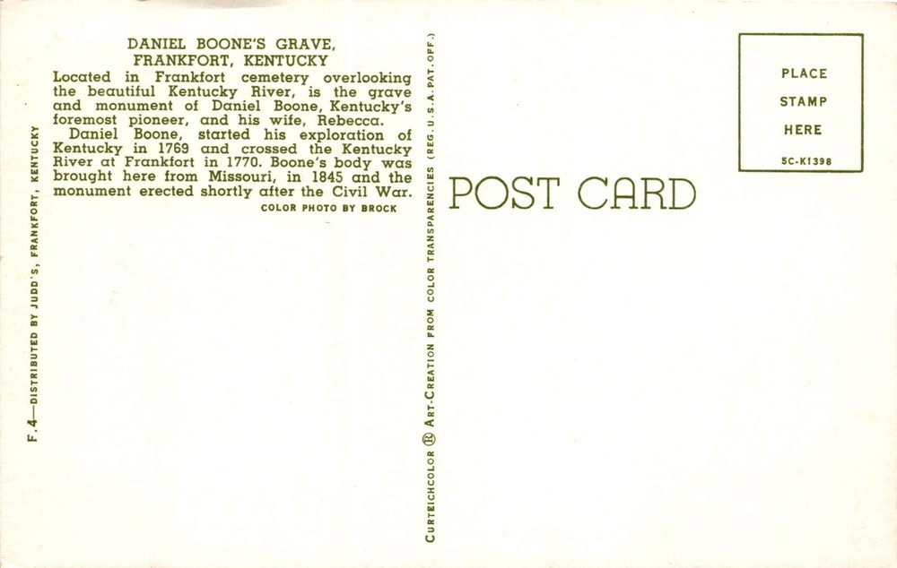 MAKE AN OFFER. THE MORE YOU BUY THE BETTER DEAL I WILL ACCEPT The postcard features a color photo of Daniel Boone's grave in Frankfort, Kentucky. Daniel Boone was a famous pioneer who explored Kentucky starting in 1769 and crossed the Kentucky River at Frankfort in 1770. His grave, located in Frankfort Cemetery overlooking the Kentucky River, also holds the remains of his wife, Rebecca.