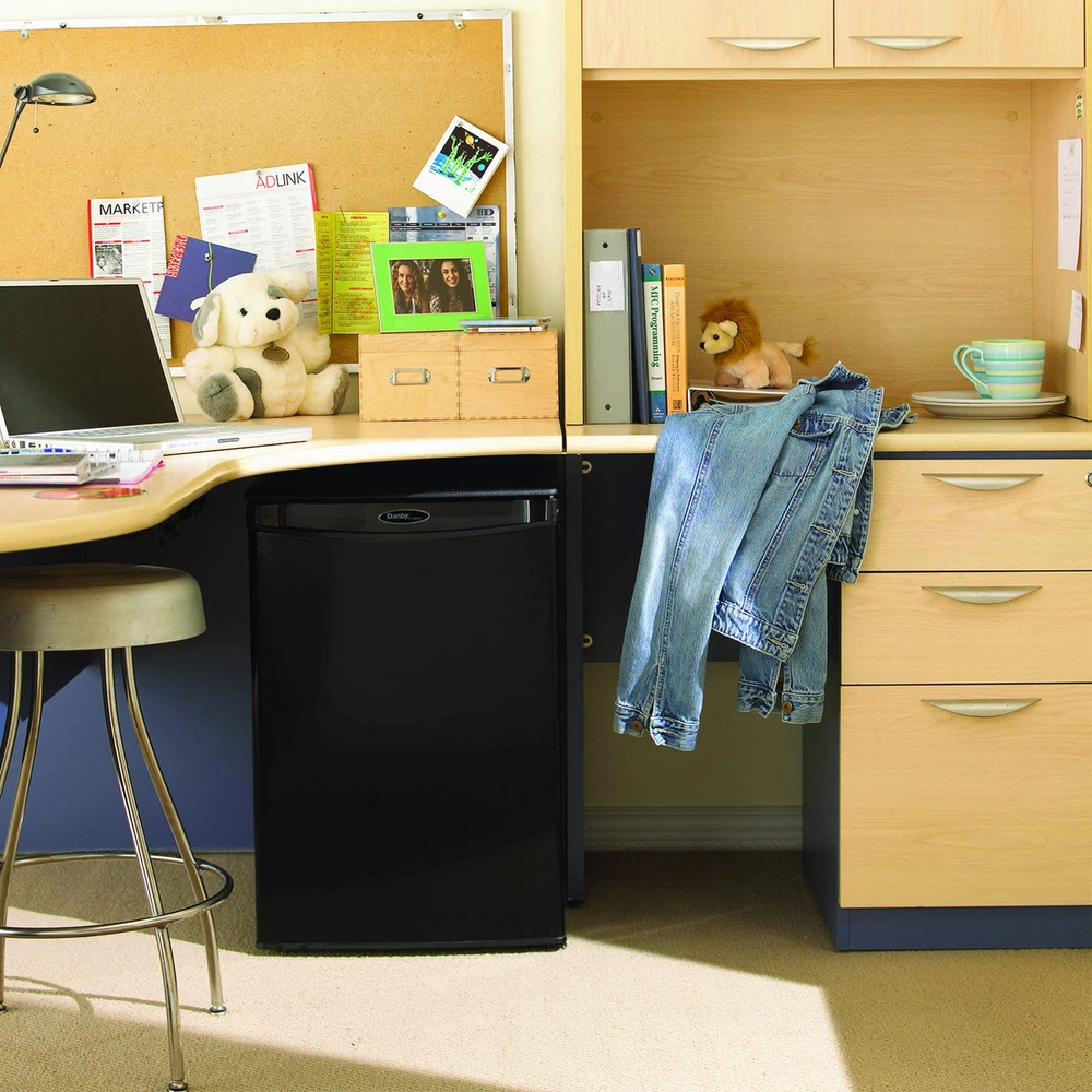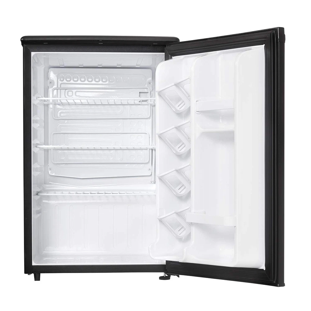 The Designer line of compact refrigerators is dedicated to being well built, easily maintained and convenient. The DAR026A1BDD-6 model comes in at a height of just over two feet and features 2.6 cu. ft. (73 L) of cooling capacity. Quality can look good, with its sleek exterior, this is the ideal unit for floors and countertops, making it the perfect fridge for spaces such as dormitory rooms, wet bars, rec-rooms, dens, workshops and basement lounges. Integrated door shelving with tall bottle storage makes storing all your additional drinks and snacks easy. Accessories can be stored on the scratch-resistant worktop and there’s no need to defrost the unit as it’s done automatically. This appliance also comes with a mechanical thermostat and offers 2.5 strong wire shelves for maximum storage versatility and optimal cool air circulation. Both left and right-handed users will love the convenient reversible door swing and the integrated door handle. This mini fridge is designed to blend with any decor style seamlessly. Compact Mini Fridge: This Designer Mini Fridge is the perfect size to fit countertops, desktops or floor and is an ideal mini fridge for your bedroom, office, or dorm 2.6 Cubic Feet (73 Liters) Capacity: The All refrigerator unit is small but mighty with 2.6 cu. ft. of fridge space Integrated Door Shelving: Tall bottle storage is ideal for large pop, water, juice, or other drink bottles CanStor Beverage Dispensing System: Efficient and tidy can storage integrated into the mini refrigerator door Clean Bright and Modern: White interior, integrated door handle and functional textured scratch resistant worktop Fits anywhere: Smooth back design with no bulky exposed components means this small mini fridge can fit just about anywhere in your room Versatile: 2 full width and 1 - 1/2 width adjustable wire shelves for undisrupted air circulation and reversible door hinge Easy to Operate: Automatic defrost and mechanical thermostat means no extra maintenance on your part Environmentally Friendly: Energy Star compliant and uses environmental-friendly R600a refrigerant