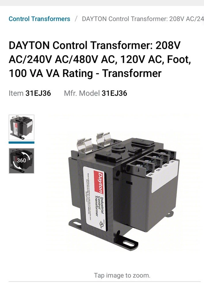 HomeDAYTON 31EJ36 Control Transformer,100VA,208/240/480VAC 31EJ36