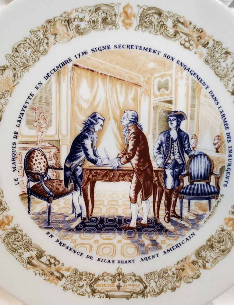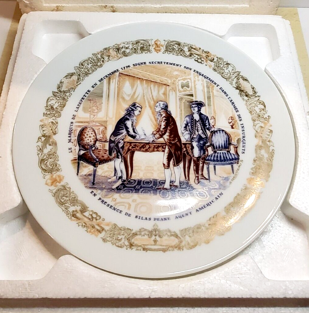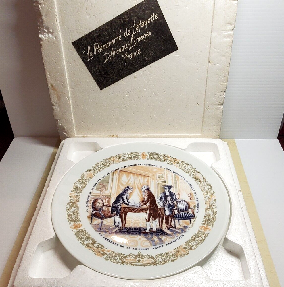 Vintage D'Arceau Limoges SECRET CONTRACT Collectors Plate. This collectible plate is part of a series of 6 plates from the 1970s. The plates reflected different scenes of the revolutionary war and have a story on the back written in French. Plate measures 8 1/2" across . Has no chips or cracks and comes in the original box as shown.
