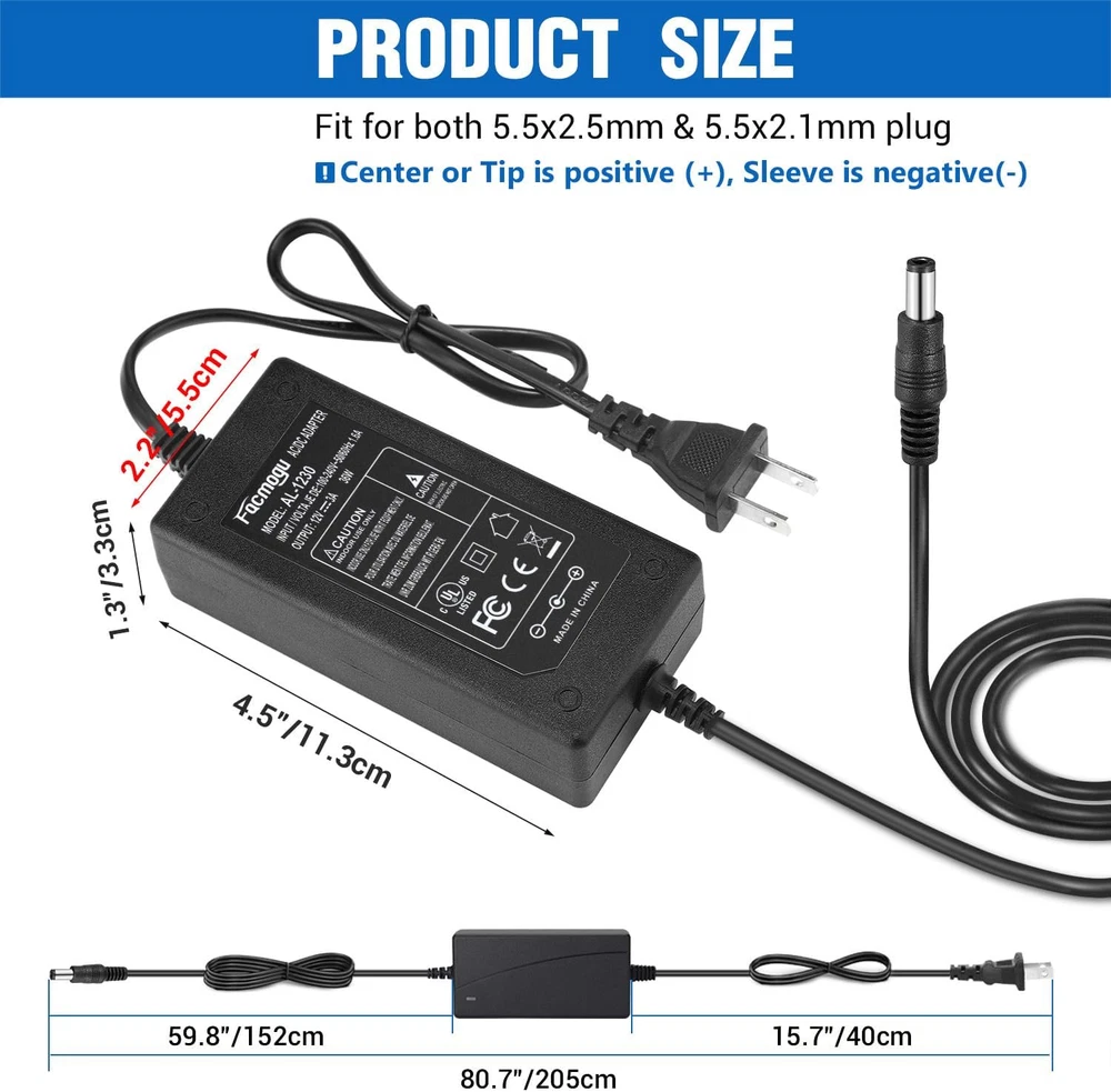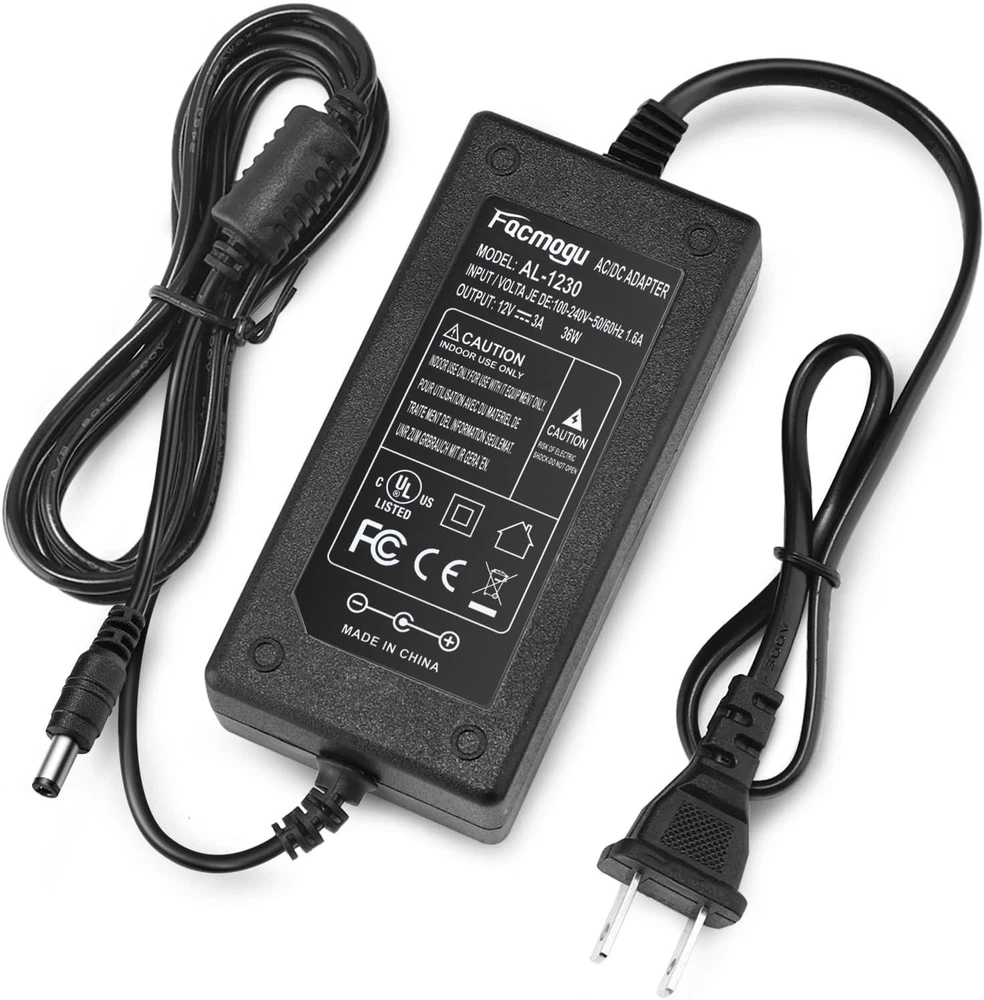 Store New Arrivals Add to Favorite View Feedback DC 12V 3A Power Adapter, 100-240V AC to DC 12V 3A 36W Power Suppy with Barrel Connector 5.5X2.5Mm & 5.5X2.1Mm, 12 Volt 3 Amp Desktop Adpater 12V Switching Transformer AC/DC Power Converter Description Item model number AL-1230 Amperage 3 Amps Number of Items 1 Is Discontinued By Manufacturer No Product Dimensions 6.5 x 9 x 0.39 inches Connector Type Barrel Jack Compatible Devices Monitors Item Weight 7 ounces Input Voltage 240 Volts (AC) Size 12V 3A Special Feature Built-in Power Supply Protection Wattage 36 watts Compatible Phone Models Universally compatible with 12V DC devices (3A max, 36W max) Included Components connector 【IMPORTANT NOTE】-- NOT Available for High Power!! Compatible with 12V DC equipment, please make sure that the output voltage of your electronic device is 12V and the output current is less than or equal to 3A, the rated power is within the range of 36W! This is a 3A low-power converter. If a product exceeding 3A is connected, which will cause not working properly. 【Power Specifications】-- Power Supply with Input AC100-240V- 50/60Hz and Output: DC 12V/3A (3000mA), 205cm (6.72 feet) Total Cable Length. Indoor use only! NOTE: Only for 12V devices, and the output current is less than or equal to 3A!!! 【Plug Design】-- Fit for both 5.5x2.5mm & 5.5x2.1mm plug. This cable terminates with a "standard" 5.5mm OD, 2.5mm ID DC plug, but it's also compatible with DC 5.5x2.1mm socket with the inner center spring contact. (NOTE: Power Supply Polarity: Center or Tip is positive (+), Sleeve is negative(-). 【Built-in Power Supply Protection】-- Certified by UL, it ensures safe use with over voltage, over current, and over temperature protection to keep all of your mobile devices safe from unexpected surges and spikes. Wide voltage range from 100V to 240V makes it suitable for travel. 【Wide Applications】-- 12V 3A Power adapters are in high demand for audio amp boards, portable powered speakers, cable boxes, LED light strips, LCD monitor, wireless routers, CCTV cameras, DC motors, 3D printers, computer projects, HUB, Switches, audio/ video power supply, and Arduino controllers to provide a safe and stable power supply for your creation. Product description Facmogu DC 12V 3A Power Adapter, AC 100-240V to DC 12V 3A 36W Power Supply Switching Transformer Compatible with 5.5x2.5mm & 5.5x2.1mm Plug Input Supply: 100-240VAC Frequency: 50-60Hz Output Voltage Rating: 12V Output Current Rating: 3A Power Rating: 36 Watts Incredibly Low Fault Rates, Low Energy Consumption No Minimum Load, Regulated Stable Voltage Stabilized Output, Low Ripple & Low Interference Fit for both 5.5x2.5mm & 5.5x2.1mm plug Total Length: 205cm / 6.72ft Package: 1PCS 100V- 240V AC To DC 12V 3A (3000mA) Power Adapter 12V 3A DC Adapter – Table Top This adapter buyout replaces many 12V DC adapters for around half the cost of other 3,000mA power supplies. Its tip positive 5.5 x 2.5mm plug (aslo compatible with 5.5 x 2.1mm) is the most common size for portable amplified speakers, cable boxes, and LED light strips. Safety Circuit Protection Function: short-circuit, over-current, over-voltage, over-load, over-charge protection is built-in to ensure its reliability and longevity. Wide Applications for Electronic robots, CNC Machine, Lighting, LCD monitor, wireless router, CCTV cameras, 3D printer, ham radio transceiver, camera, car subwoofer amp, audio amplifier, RC LiPo chargers, computer project, wireless router, ADSL Cats, HUB, audio/ video power supply. Indoor use only! 100V - 240V AC 50/60HZ to DC 12V 3A Switching Power Supply Home Power Adapter US Standard Plug The following will cause damage to your device: Reverse polarity Higher voltage adapter than device rating The following will cause harm to your power cord or adapter: Reverse polarity Lower current adapter than device rating The following might not cause damage, but the device will not work properly: Lower voltage adapter than device rating Higher current adapter than device rating Therefore, please check the plug size and voltage before purchase, and make sure your device input using DC 12V, 3A! ABOUT US We offer the best prices around on high quality products. Our E-store includes media such as books, movies, music and games while offering electronics, toys, sporting apparel, clothing, tools, general home, garden items and more. SHIPPING We are always working hard to ensure your package arrives as soon as possible. Please understand that some factors like weather, high postal traffic, and the performance of shipping companies are outside of our control. We offer free shipping to the lower 48 states and ship within 2 business days of payment, usually sooner. We do not accept P.O. Boxes. Please provide a physical address. RETURNS We offer a 30-Day Return Policy on items which you are not completely satisfied with. You have the option for a full-refund or an exchange of the item. No returns are available on items shipped outside of the USA. PAYMENT We accept PayPal. CONTACT US This page content is yet to come Please ad us to your favorite seller and visit again later Thank You