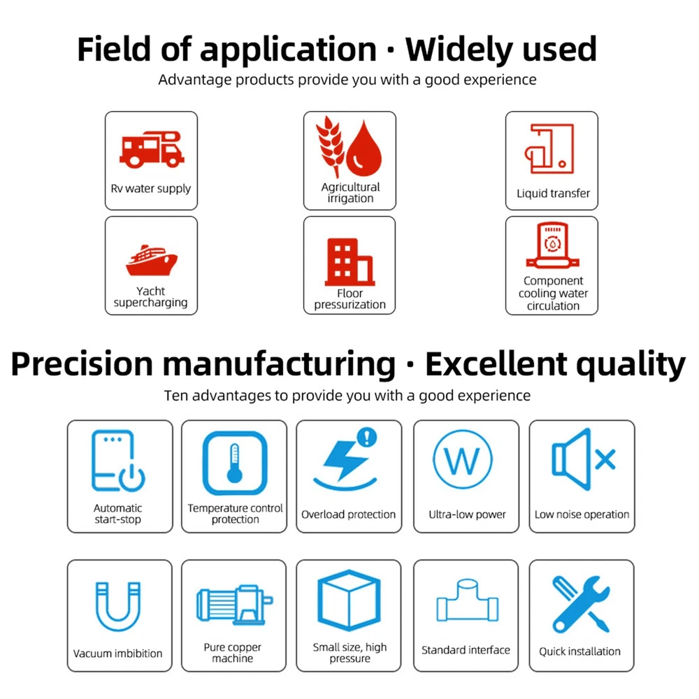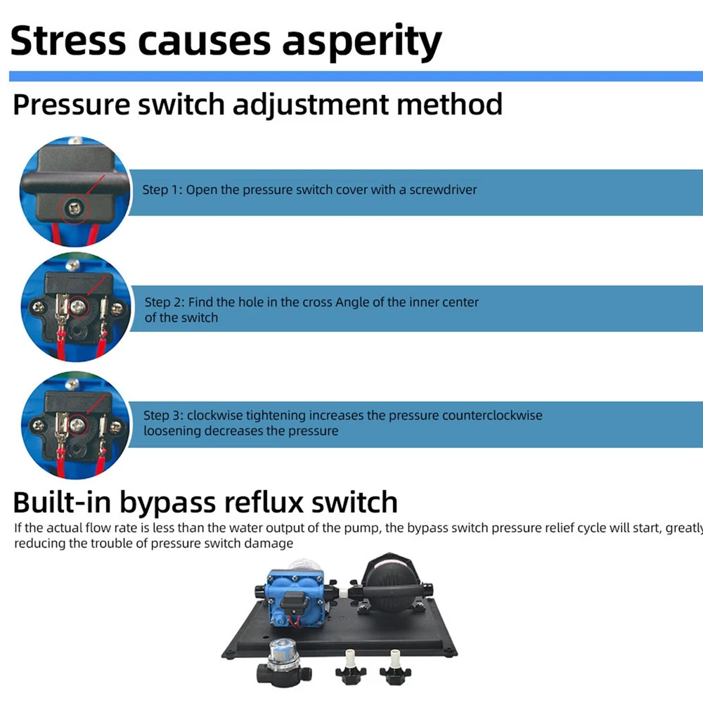Features: 【 and Efficient】: This DC 12V boost water pump kit features a powerful motor and a rate of 3GPM (11.3L/Min) at 55PSI, ensuring a steady and consistent water supply. The built-in thermal overload protection automatically stops the pump when the motor overheats, providing peace of mind and preventing damage. 【Versatile and Easy to Install】: Designed with a standard 4-point external threaded interface, this water pump is easy to operate and quick to install. The automatic pressure switch allows for adjustable pressure ranging from 1.0kg/cm² to 3.5kg/cm², catering to various needs. The shock-proof iron plate mounting feet effectively reduce noise and the galvanized prevents rusting, making it even in humid environments. 【Powerful and 】: Equipped with a high-quality copper core motor, this water pump delivers superior performance, low noise, and higher rotation speed for safer and more . The motor also features overload and overheat protection, automatically disconnecting the circuit to the motor. With its exceptional durability and anti-oxidation ability, this pump is built to last. 【Integrated Water Pressure System】: Our RV water pump comes with a pressure tank, providing a stable and water supply. The integrated system offers multiple configuration options to suit different applications, including yachts, RVs, agricultural irrigation, industrial use, fluid transfer, water purifier boosting, solar water systems, home water supplementation, and car washing. The simple installation and of this system effectively reduce the frequency of pump start-up and absorb excess heat generated by heaters. 【Pressure-Regulating and Reflux Functionality】: This water pump is designed with a built-in pressure switch and reflux function. When the actual rate is lower than the pump's output, the bypass switch starts the pressure release cycle, greatly reducing the of pressure switch damage. This feature ensures the longevity of the pressure switch, providing optimal protection and peace of mind. Specifications: Maximum Rate: 11.3L Maximum : 38m/124ft Pump Body Material: Engineering plastic Drive Mode: Electric Pressure/ Rate: 55PSI/11.3L GPM: 3 Environmental Temperature: ≤+50 ° C Medium Temperature: 0~+65 ° C Medium PH Value: 5.0-10 The volume of solid inputs in the medium is ≤ 0.1, and the particle size is not greater than 0.2mm Power Frequency: 50Hz Voltage: DC 12V Voltage Translation Range: Rated value ± 10% Product Size: 36.9 * 25.9cm/12.5 * 10.2inch Note: Due to the different display screen and light effect, the actual color of the item might be slightly different from the color showed on the pictures. Packing List: 1 x Water Pump 1 x Filter 2 x Joint On Dec 11, 2024 at 02:55:16 PST, seller added the following information: On Dec 17, 2024 at 22:30:47 PST, seller added the following information: On Dec 26, 2024 at 20:14:39 PST, seller added the following information: