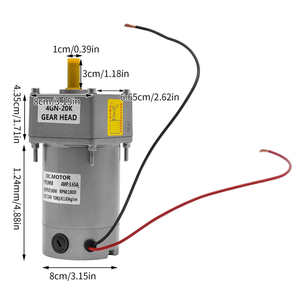 Specifications Color: Silver Model: DM08 Assembly Required: No Material: Aluminum Alloy, 40cr Alloy Steel Motor Type: Brush Copper Wire Motor Reduction Ratio: 1:20(20K) Process: Tempering Treatment, Fine Finish, Nitrogen Treatment Noise(About 1m/3.28ft Away): 50db Protection Level: IP65 Motor Speed: 1800rpm Output: 60W AMP: 3.65A Volt: 24V Torque: 1.83kg/cm Shaft Bore Diameter: 10mm/0.39inch Keyway: 4mm/0.16inch Shaft Bore Length: 30mm/1.18inch Product Size(Gearbox and Shaft Included): 80*198mm/3.15*7.8inch Packaging Size: 23.8*10*10.8cm/9.37*3.94*4.25inch Gross Weight: 2.6kg/5.73lbs Net Weight: 2.3kg/5.07lbs Package Included 1*DC Gear Motor DC 24V Gear Motor Adjustable Motor 1800rpm, Large Torque Gear Motor Waterproof Description The 20k DC gear motor is a high-performance motor made of high-quality aluminum alloy and 40cr alloy steel, which is solid and durable. It uses a high-quality copper wire brushed motor with high strength, high efficiency, low noise, and long service life, making it widely used in various mechanical equipment and industrial automation systems. Key Features Build to Last: With high-quality aluminum alloy and 40cr alloy steel materials, this motor features excellent corrosion and oxidation resistance as well as outstanding mechanical properties, hardness, toughness, and wear resistance . Low Noise: It works at a low noise of about 50dB at a distance of 3.28ft, equivalent to a relatively quiet office environment, providing you with a comfortable working ambiance. Excellent Workmanship: With processes including tempering treatment, fine finish, and nitrogen treatment, this motor features high accuracy, excellent working performance, and efficient running. High Efficiency: The 60W copper wire motor with strong reliability, 1800rpm rotational speed, 1.83kg/cm torque, 1:20 reduction ratio, and reversing function can effectively improve work efficiency. Thoughtful Design: It features an IP65 protection level, which is dustproof and waterproof , making our product more durable. It also adopts full ball bearings with high torque and low vibration, ensuring fast starting speed and stable performance of the motor. Ready to Use: The motor is assembly-free , so you just need to connect the wire to the right place on your machine, or you can connect it with a speed controller(not included) for more accurate speed control. Easy to Carry & Store: The compact size(3.15*7.8 inches) and 5.07 lbs weight allow you to easily carry this product to the required working site and store it with less space. Customer Service: We aim to provide quality products and services. If you have any problems, please feel free to contact us. We will reply and solve the problem for you as soon as possible. Details External Carbon Brush: It makes the changing of the carbon brush easier and gives the product a longer service life. Shaft Sleeve: The yellow shaft sleeve can effectively protect the shaft and reduce friction and wear. Two Lead Wires: Two nickel-plated lead wires have better conductivity, ensuring stable performance and providing you with a better user experience. Application It can be used in packaging, printing, food, textile, engineering machinery, and other fields, sports building materials, escalators, automated welding, transportation equipment, weaving machinery, packaging machinery, CNC equipment, machinery and equipment, grinding machines, milling machines, printing machinery, production workshops, and assembly lines. Specifications Color: Silver Model: DM08 Assembly Required: No Material: Aluminum Alloy, 40cr Alloy Steel Motor Type: Brush Copper Wire Motor Reduction Ratio: 1:20(20K) Process: Tempering Treatment, Fine Finish, Nitrogen Treatment Noise(About 1m/3.28ft Away): 50db Protection Level: IP65 Motor Speed: 1800rpm Output: 60W AMP: 3.65A Volt: 24V Torque: 1.83kg/cm Shaft Bore Diameter: 10mm/0.39inch Keyway: 4mm/0.16inch Shaft Bore Length: 30mm/1.18inch Product Size(Gearbox and Shaft Included): 80*198mm/3.15*7.8inch Packaging Size: 23.8*10*10.8cm/9.37*3.94*4.25inch Gross Weight: 2.6kg/5.73lbs Net Weight: 2.3kg/5.07lbs Package Included 1*DC Gear Motor Notes The gearbox has different reduction ratios. Please check whether it is the appropriate model that meets the required output speed before purchasing. The bracket and speed control unit are not included in this package, so you should purchase them yourself if you need them. If the motor load is small and does not run for a long time, the controller can be adjusted to 50% of full speed. When the motor is loaded and continuously operating for a long time, the controller should not be lower than 70% of full speed. Please do not knock the product to avoid unnecessary damage. Please allow the slight color difference caused by the shooting light and 1-3cm error due to manual measurement, and make sure you do not mind before you order. Payment Delivery details Terms of sales About us Contact us Payment We accept ebay payment 。 Fees such as import duties, taxes are not included in the item price or shipping costs. These charges are the buyer's responsibility. Delivery details Shipping: 2-9 working days to: USA Terms of sales We maintain high standards of excellence and strive for hundred percent customer satisfaction. Feedback is very important to us. We hope that you contact us immediately before you give neutral or negative feedback, so that we can address your concerns. It is impossible to address issues if we do not know about them! About us Your satis faction is our ultimate goal. We work hard to earn your trust and future business. Our certified technicians have tested each item before shipping. The unit comes with 1 year limited warranty on all manufacturing defects. a) If you receive a defective item, you may return it or ask for a discount. Please contact us within 14 days after you receive the package. b) What you returned must be intact and in its original packaging as re? u. Customer is responsible for shipping costs of the