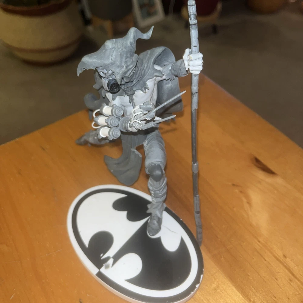 Add this DC Collectibles Batman Black & White Scarecrow statue by Carlos D'Anda to your collection today! This 8" statue features the iconic Batman character in a classic black and white design, perfect for any fan of the Caped Crusader. The detailed sculpt and paint job makes this statue a must-have for any collector or enthusiast. This figure is a great addition to any display or shelf, and is sure to be a conversation starter. The DC Collectibles brand is known for their high-quality and authentic collectibles, and this statue is no exception. Don't miss out on the chance to own this unique piece of Batman memorabilia. Nice piece the cape has a crack and missing 2 finger tips.