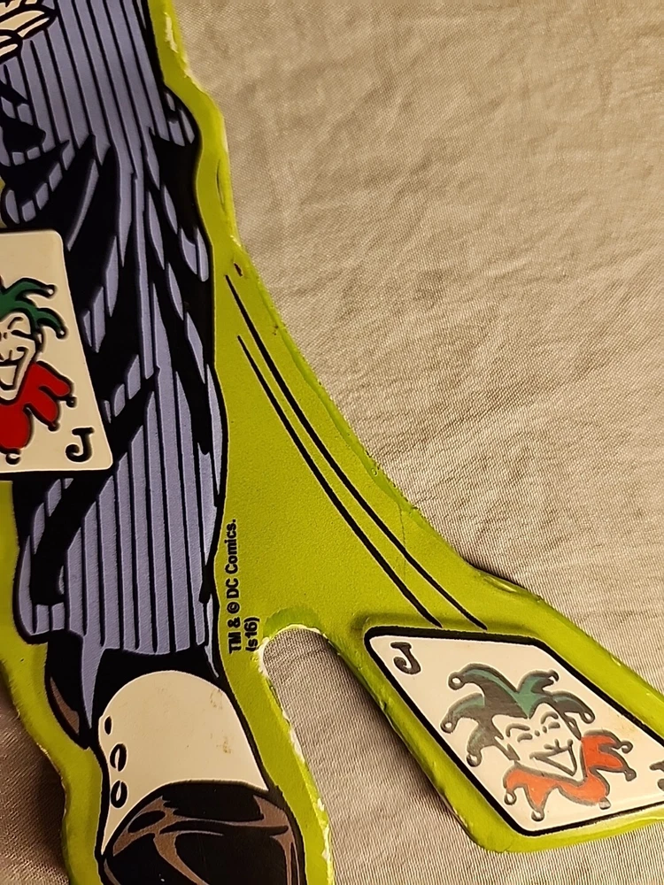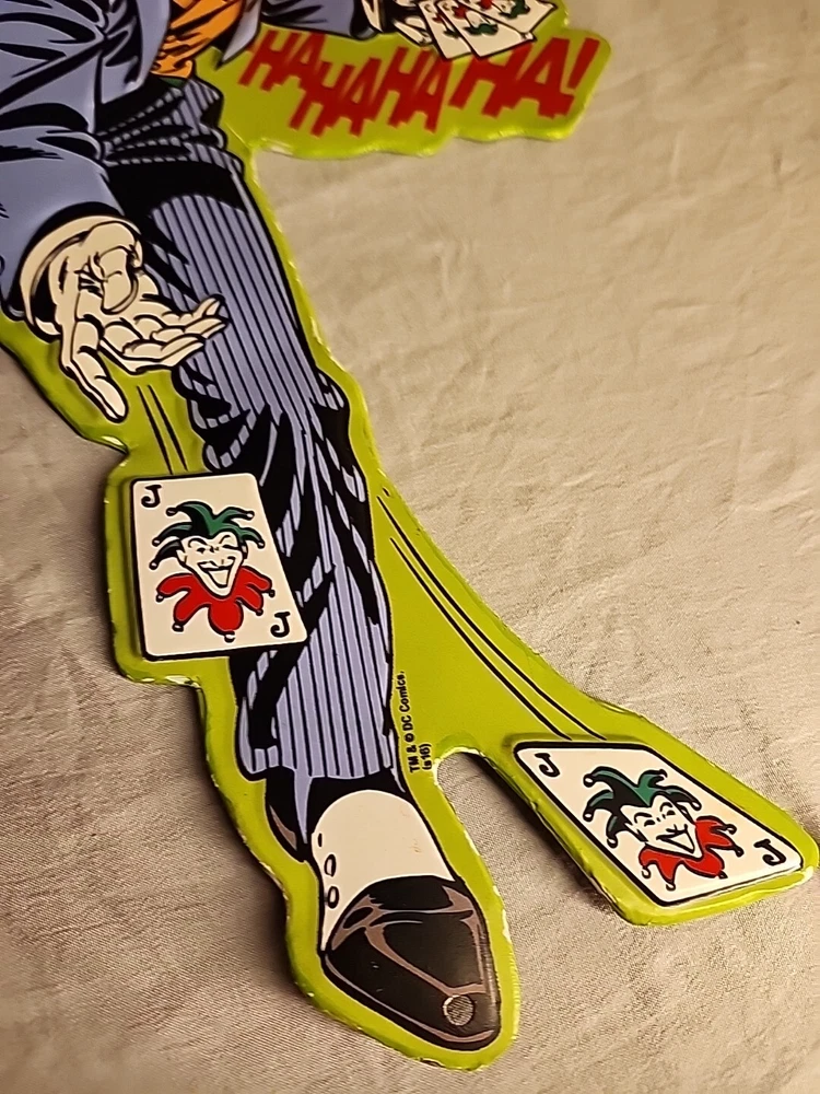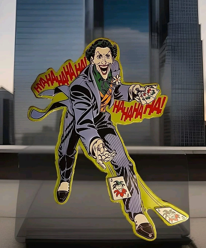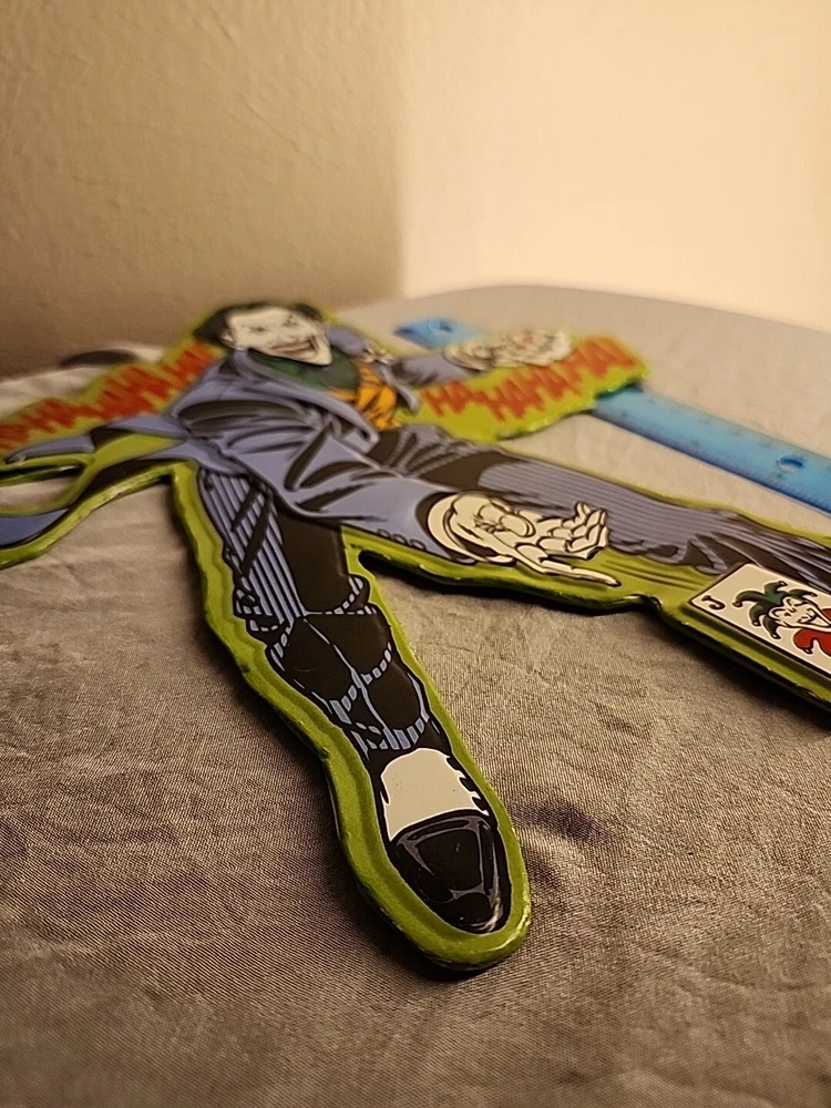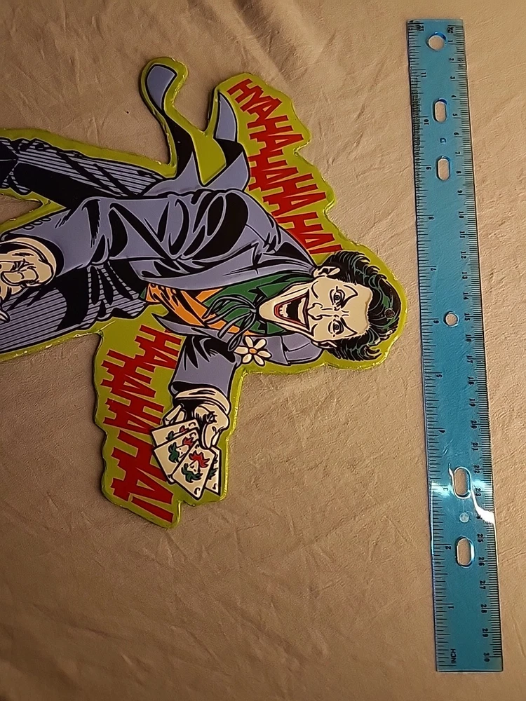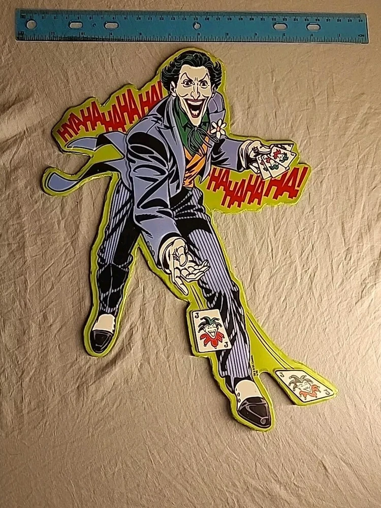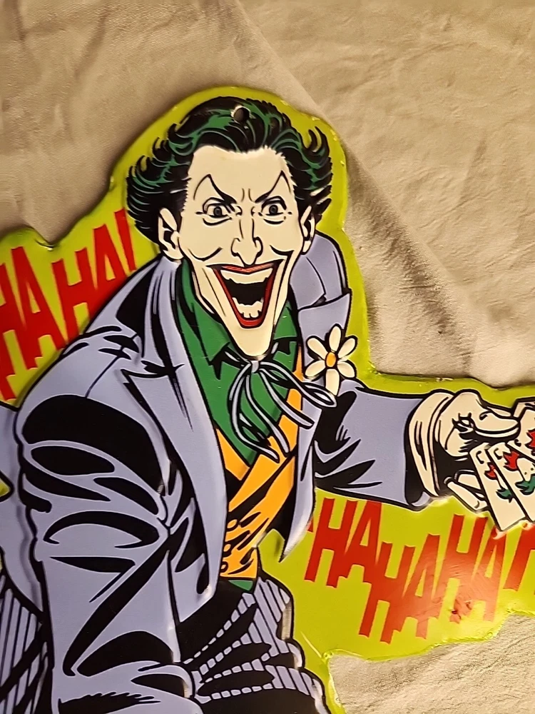 SEE PHOTOS AS IS . Some edges are bent GREAT COLLECTORS ITEM! JOKER! Add a touch of madness to your wall or door with this DC Comics Joker Metal Die Cut-Out Sign. The sign features the iconic Joker character from the Batman franchise and is made of durable metal with a metallic finish. It is suitable for any fan of the Joker or DC Comics and is perfect for adding a unique touch to your decor. This sign is a must-have for any collector or fan of the Joker. It is perfect for displaying on your wall or door and is sure to catch the eye of anyone who enters the room. Made with high-quality materials, this sign is built to last and will remain a cherished piece in your collection for years to come.