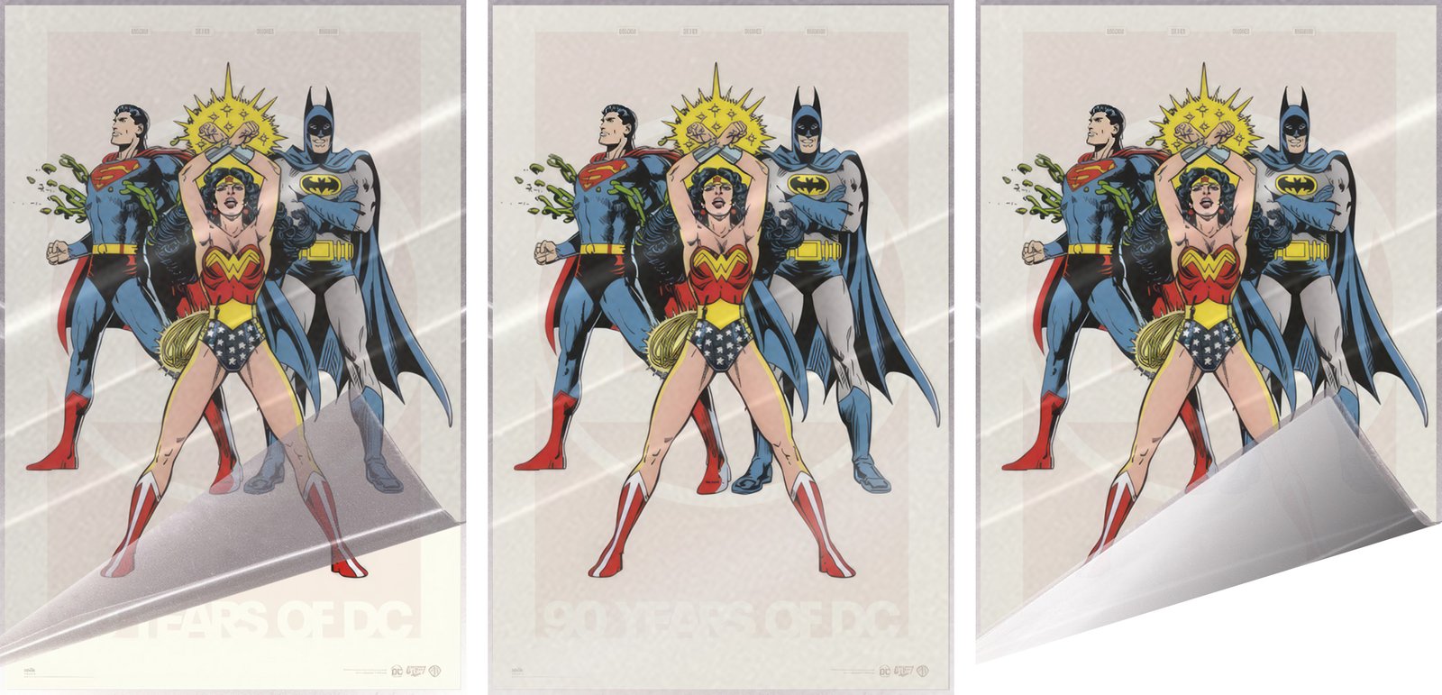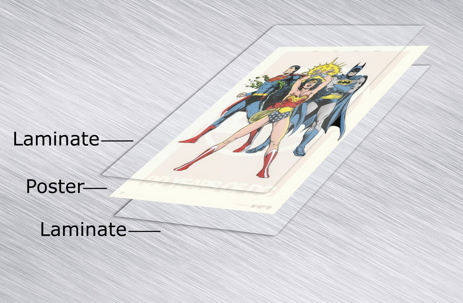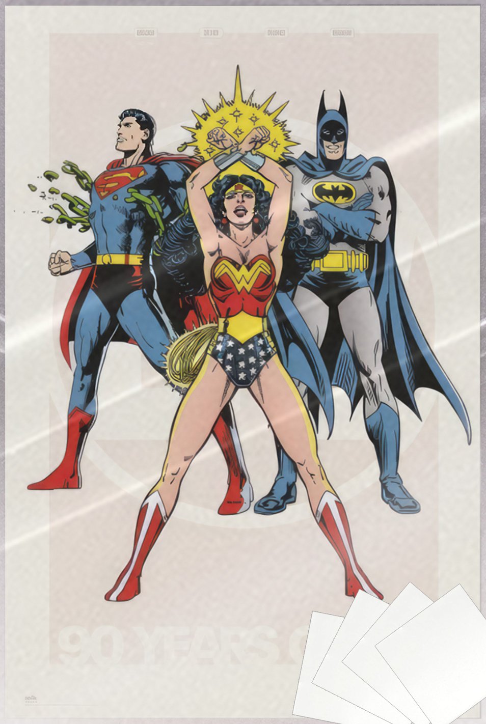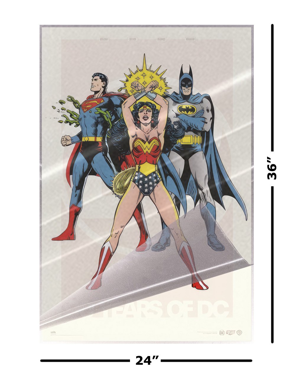 Enhance and protect your favorite DC Comics 90th Anniversary poster with our premium laminated finish, designed to make every detail stand out. The glossy laminate coating brings your DC Comics 90th Anniversary poster to life, making the colors pop with added depth, definition, and a brilliant shine that catches the eye. More than just great looks, this laminated version offers lasting durability. The protective layer makes your poster fade-resistant, preserving its bright, vivid colors for years to come. It’s also spill-resistant and easy to wipe clean, keeping your poster looking flawless even in busy environments. Whether for home, office, family room, game room, home theater, bedroom or a man-cave, lamination is the perfect way to extend the life of your poster, combining long-lasting protection with a sleek, high-quality finish. The poster is printed on high quality paper and measures 24 x 36 inches.