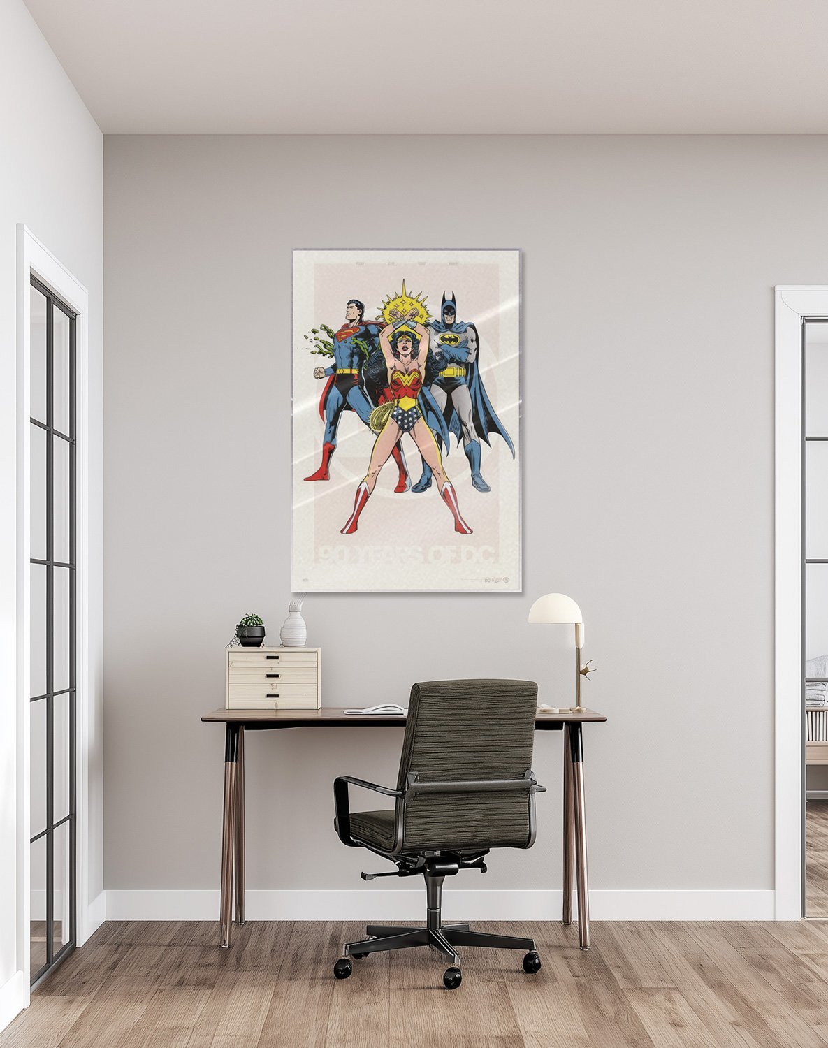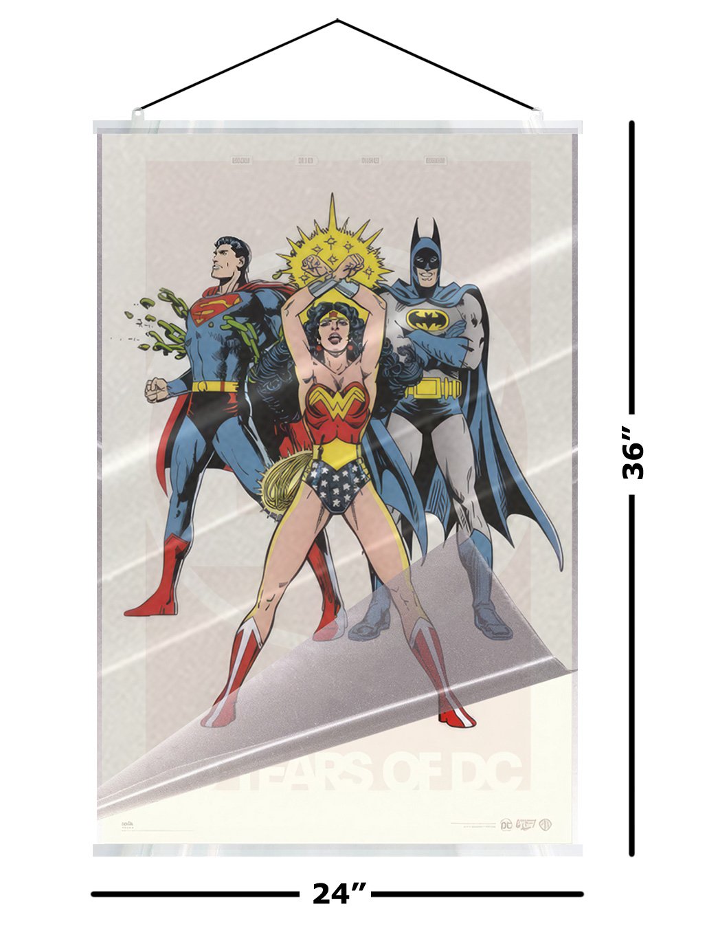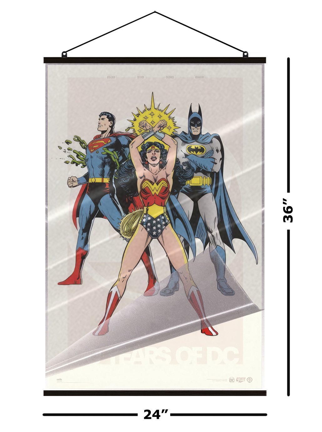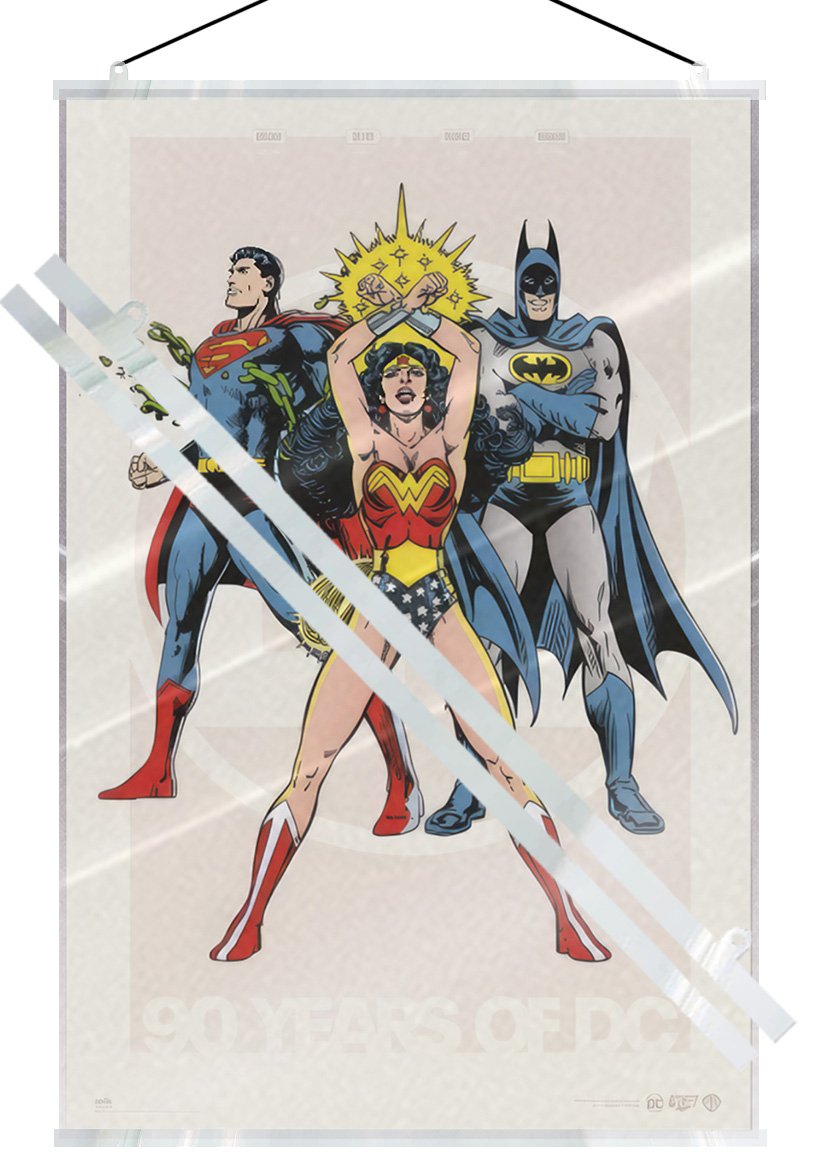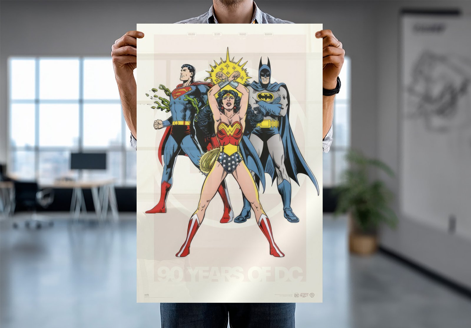 Enhance and protect your favorite DC Comics 90th Anniversary poster with our premium laminated finish, designed to make every detail stand out. The glossy laminate coating brings your DC Comics 90th Anniversary poster to life, making the colors pop with added depth, definition, and a brilliant shine that catches the eye. More than just great looks, this laminated version offers lasting durability. The protective layer makes your poster fade-resistant, preserving its bright, vivid colors for years to come. It’s also spill-resistant and easy to wipe clean, keeping your poster looking flawless even in busy environments. Whether for home, office, family room, game room, home theater, bedroom or a man-cave, lamination is the perfect way to extend the life of your poster, combining long-lasting protection with a sleek, high-quality finish. The poster is printed on high quality paper and measures 24 x 36 inches.